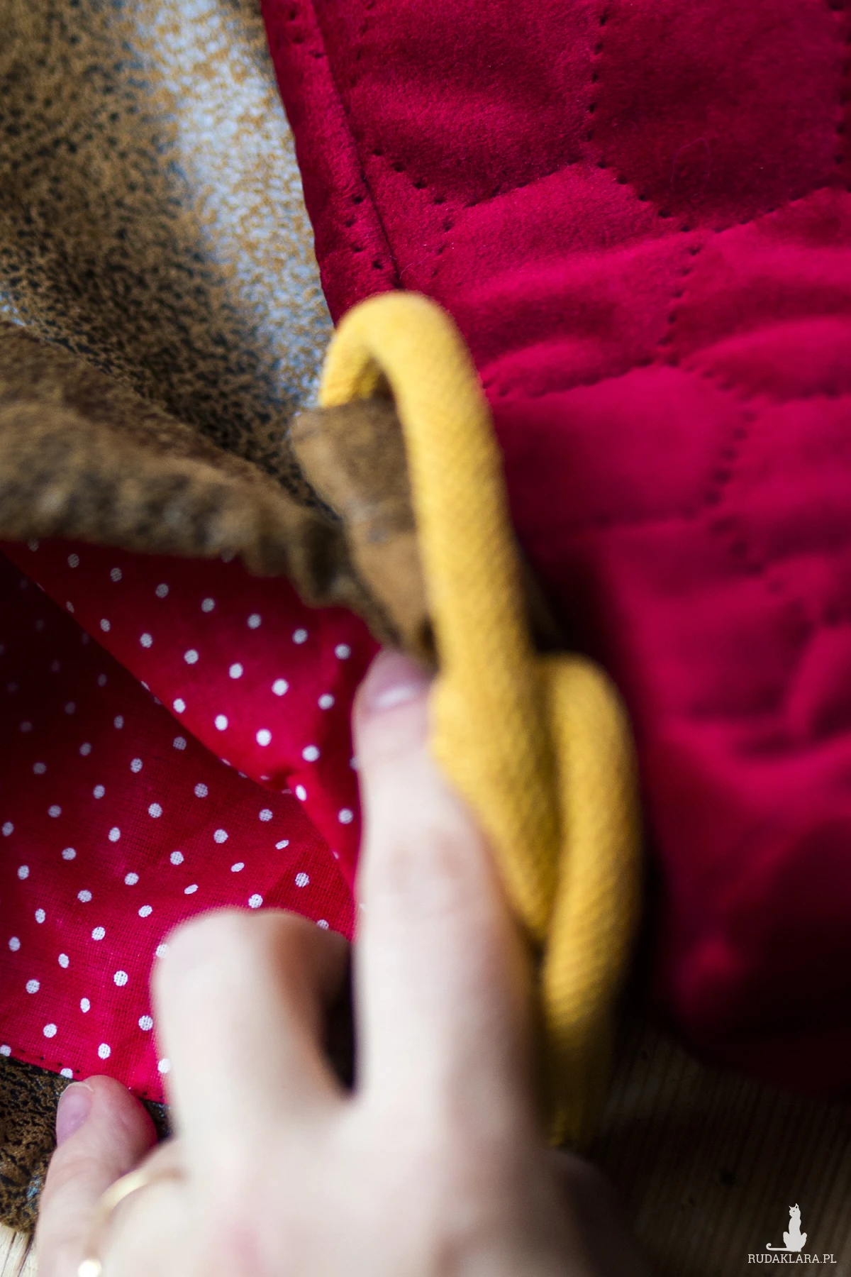 Czerwona, bawełniana podszewka w groszki, okrągłe dno. Całości dopełnia gruby, bawełniany sznurek w kolorze miodowym.