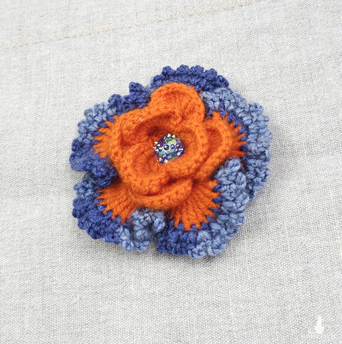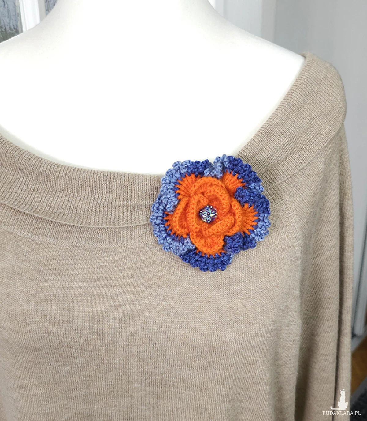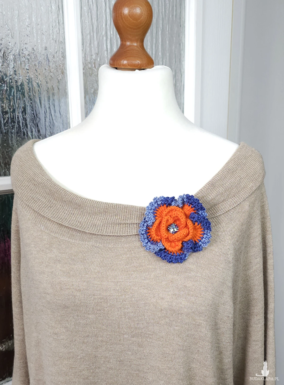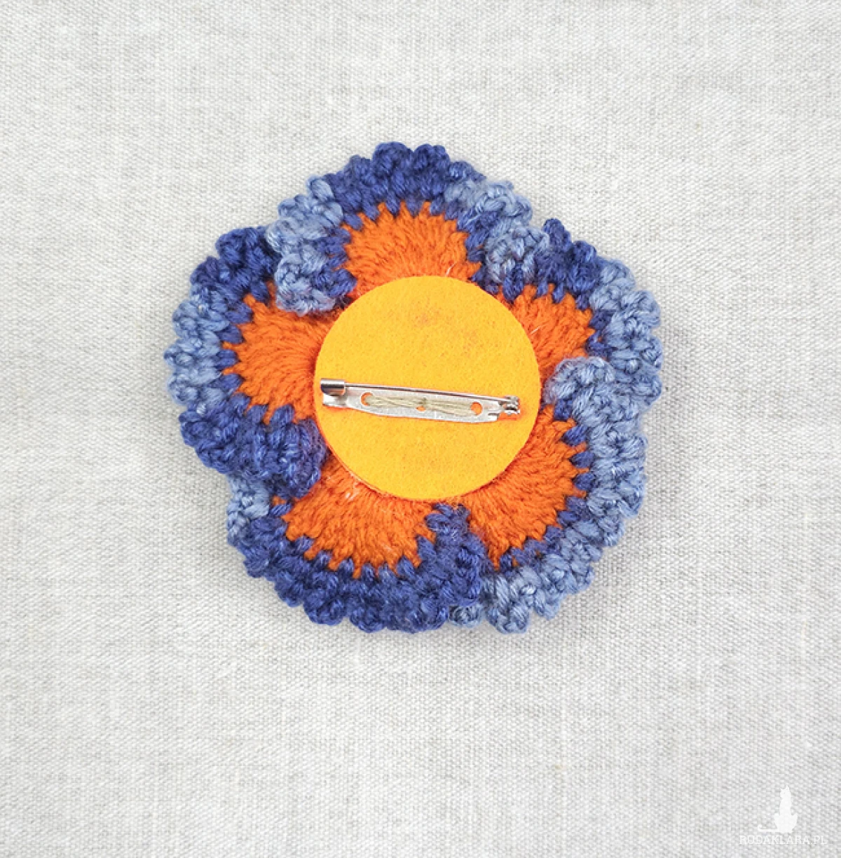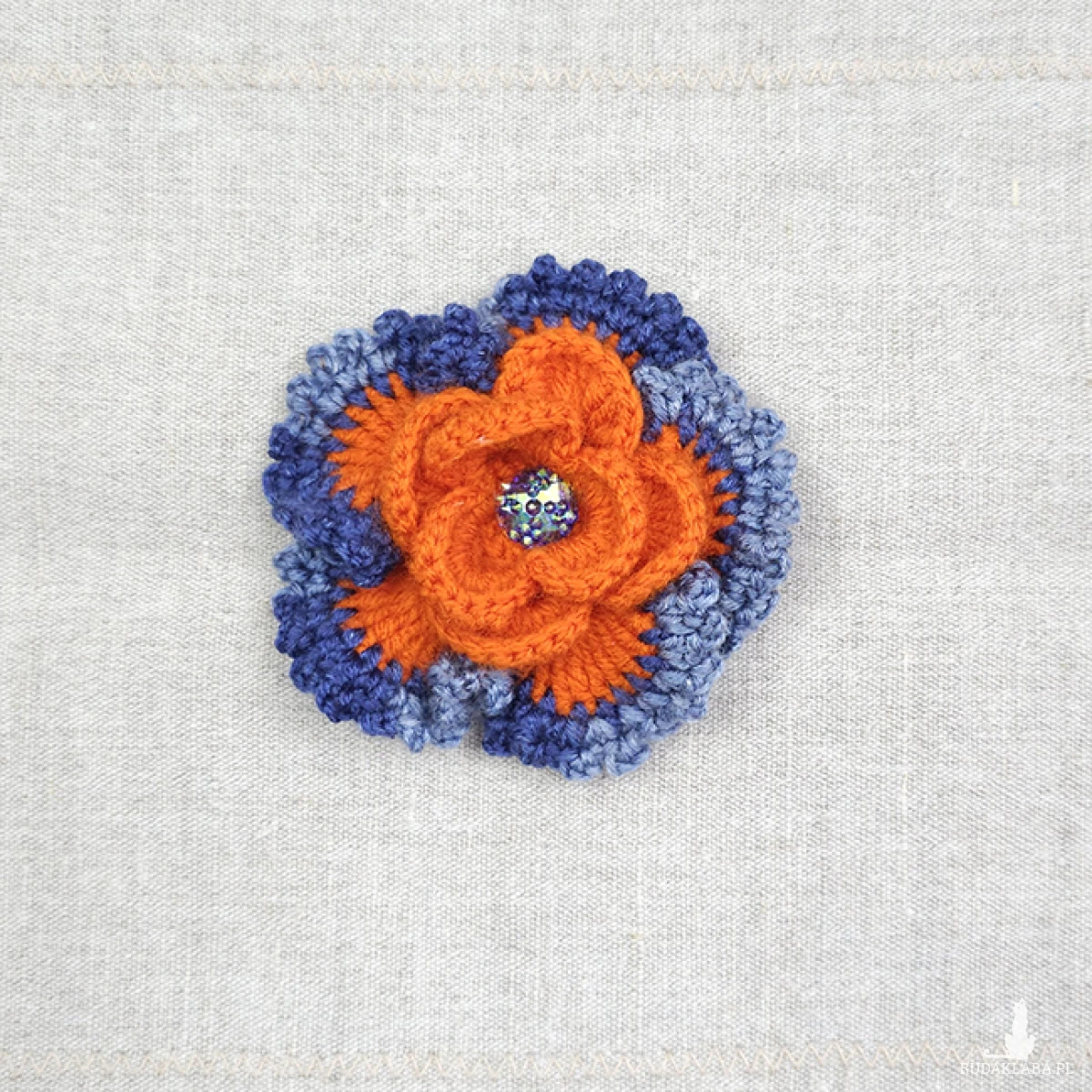 6548 szydełkowa broszka, kolorowa, przestrzenna; kwiat; pomarańczowa, granatowa