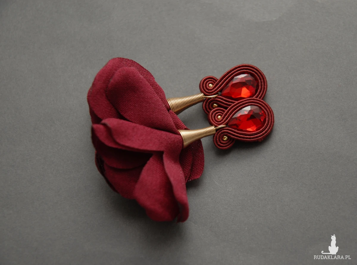 oferuję kolczyki (sztyfty) lub klipsy zrobione techniką sutasz, ozdobione fasetowanymi szklanymi kaboszonami i kwiatkami z materiału