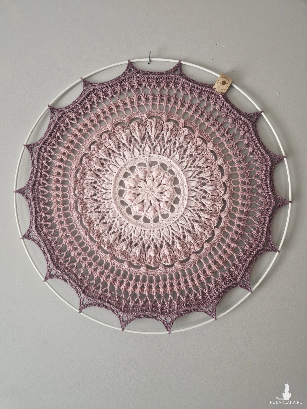 Mandala wykonana jest ręcznie na szydełku. Materiał to 50% akryl i 50% bawełna. Mandala jest rozpięta na białej metalowej obręczy o średnicy 40 cm. Wszystkie użyte materiały są najwyższej jakości, dlatego mandala nie odkształca się i nie mechaci.