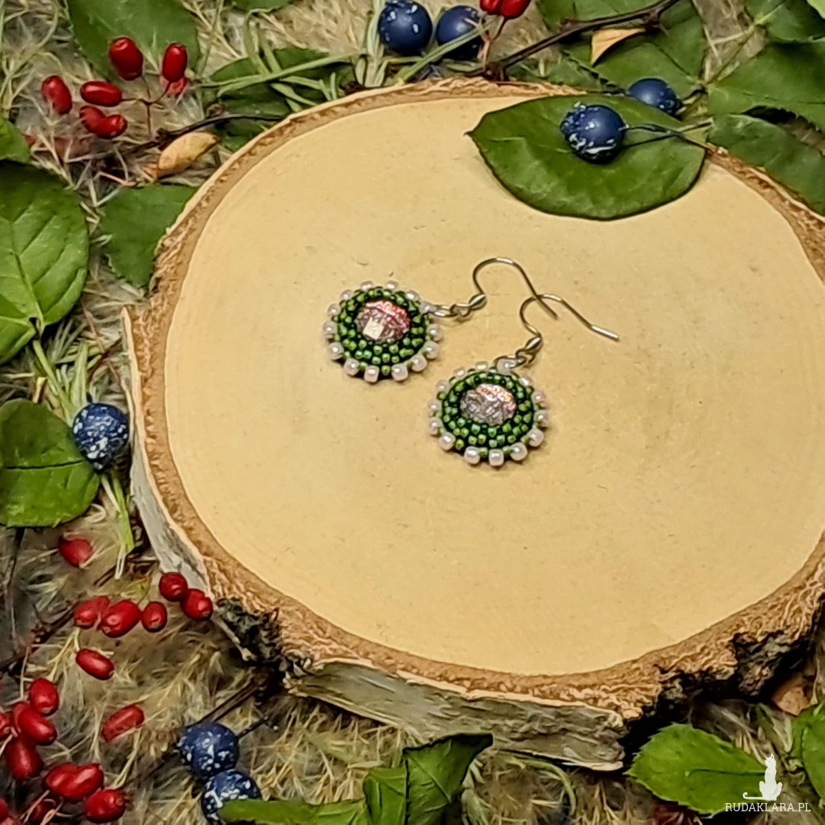 Całość wykonana techniką haftu koralikowego, gdzie każdy koralik jest starannie wyszyty, sprawia, że kolczyki nabierają wyjątkowej faktury i głębi. Błyszczące koraliki odbijają światło, dodając biżuterii elegancji i subtelnego blasku. Pomimo ich niewielkich rozmiarów, kolczyki mają wystarczająco dużo wyrazistości, by stać się wyróżniającym się elementem biżuterii, który z łatwością dopełni zarówno codzienne, jak i bardziej formalne stylizacje. To prawdziwie delikatna, ale przy tym efektowna biżuteria.