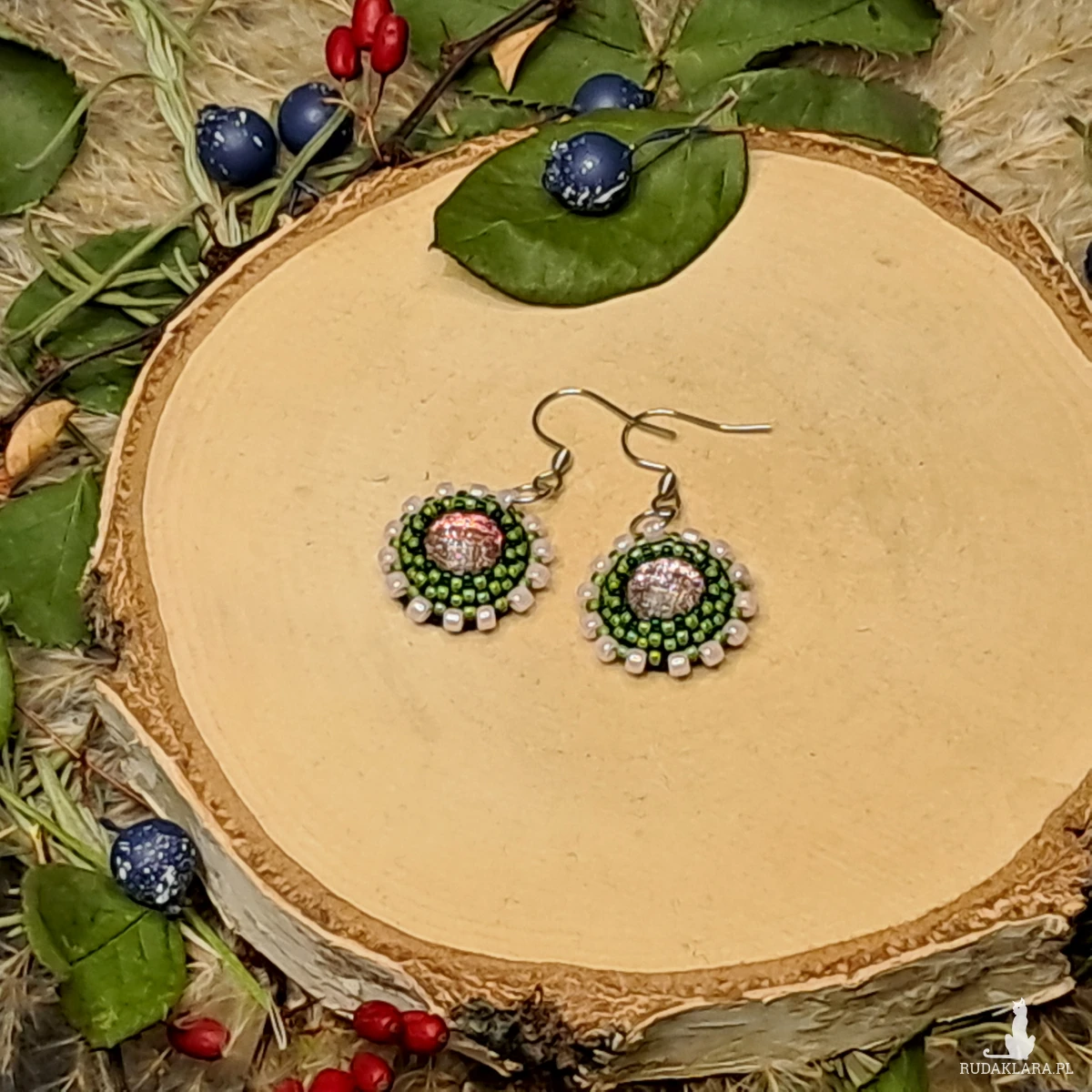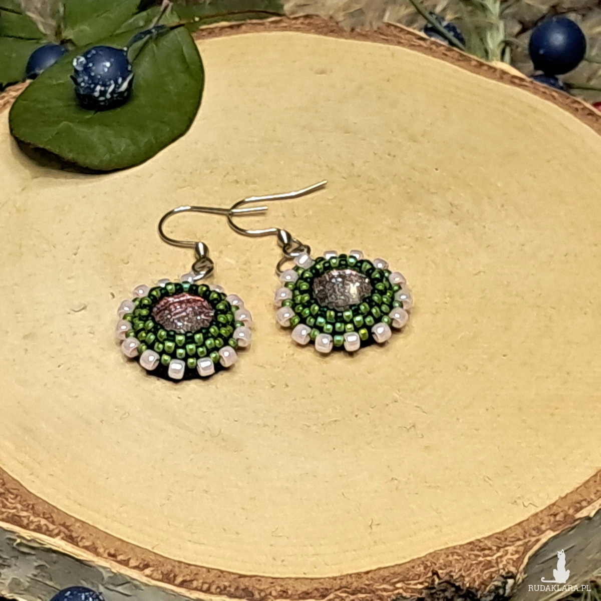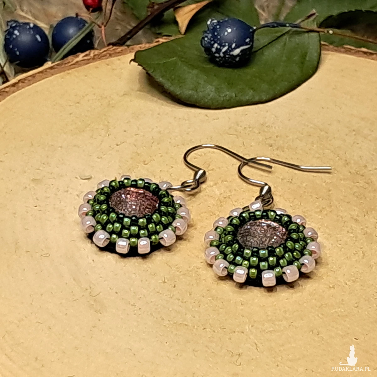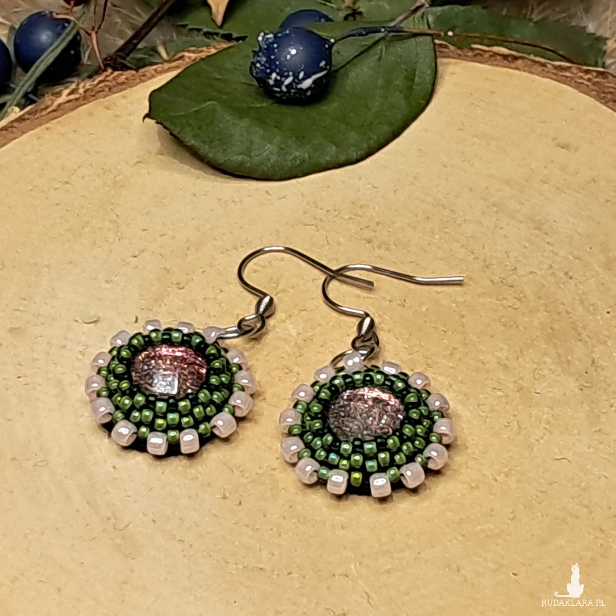 Te małe kolczyki z koralików są prawdziwym dziełem sztuki w miniaturze. Okrągły kształt nadaje im klasyczny, ale elegancki wygląd, idealny do codziennych stylizacji lub na specjalne okazje. Kolory, które dominują to: subtelny róż i ciepła oliwkowa barwa – tworząc harmonijną paletę, która przyciąga wzrok, ale nie jest zbyt przytłaczająca.
