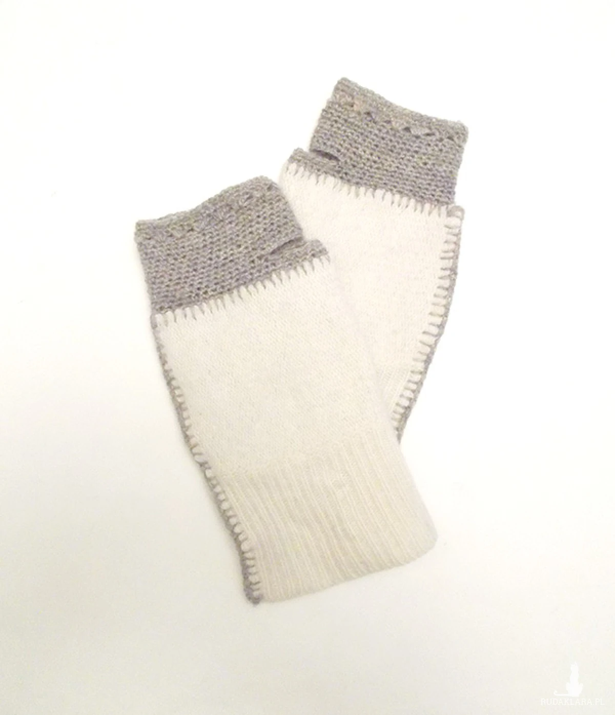 Jasne mitenki w kolorze kremowym, ecru. Materiał 70 % wełna jagnięca, 20 % angora 10 % nylon. Wykończenie akrylowe (beżowo-szare). Prać ręcznie w letniej wodzie.