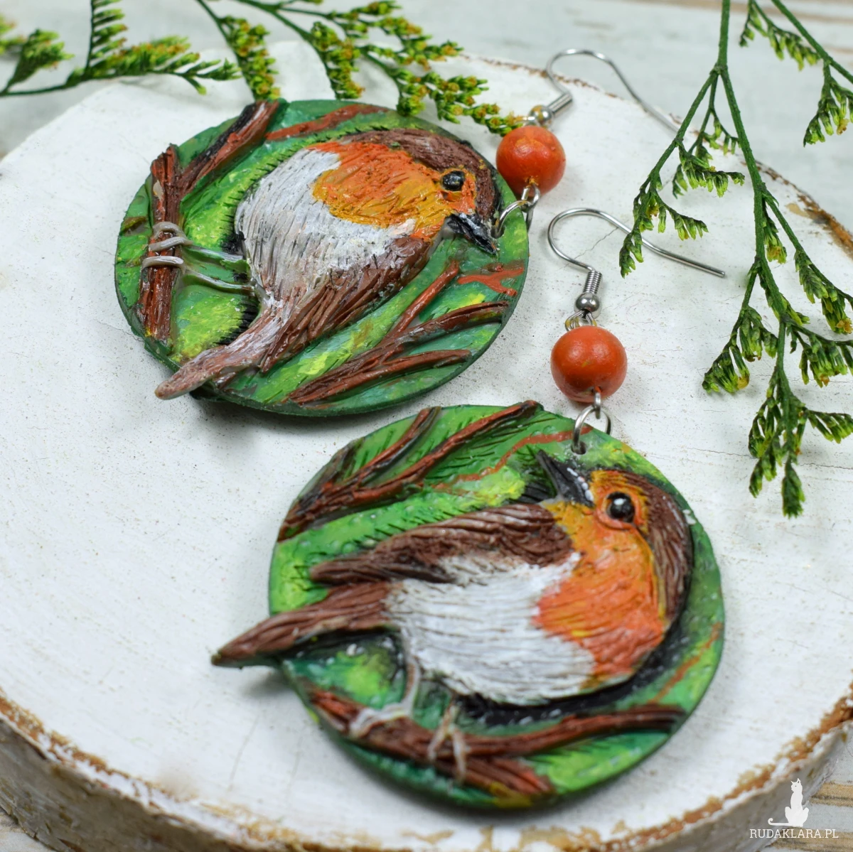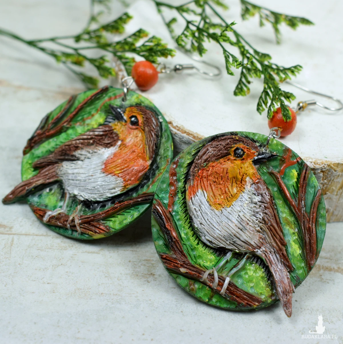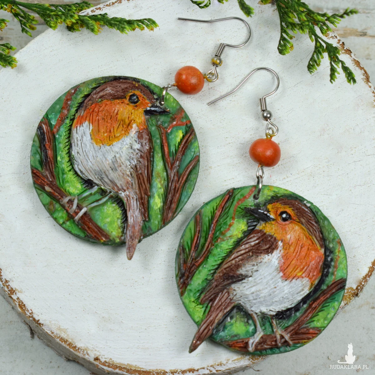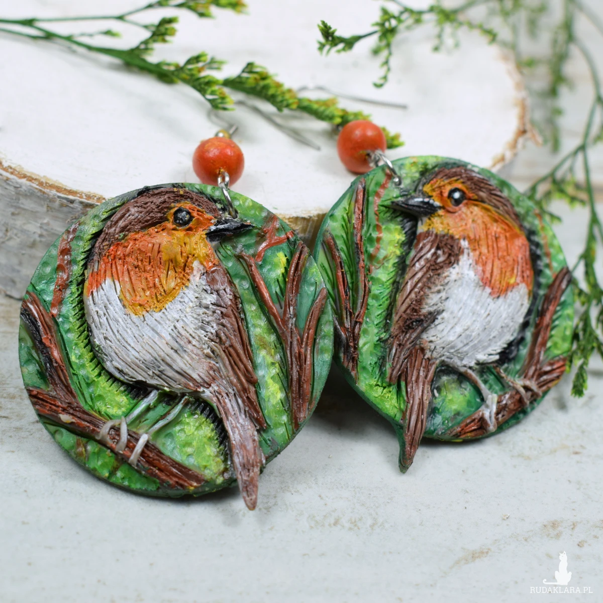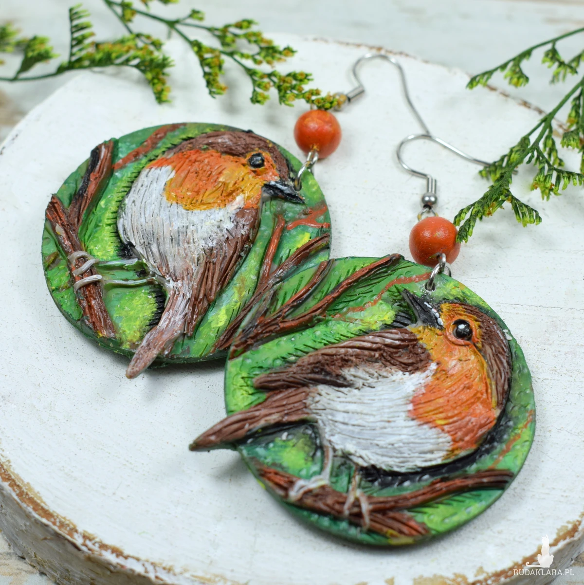 Unikatowe, wykonane ręcznie kolczyki z motywem rudzika, w odcieniach zieleni, brązów i szarości, bieli.