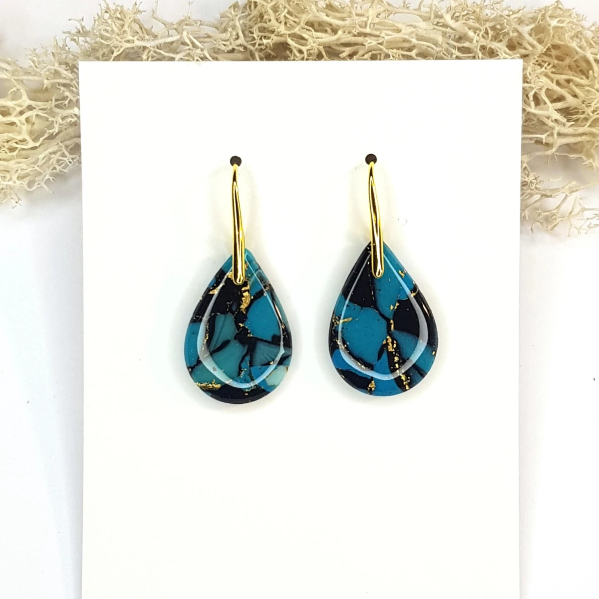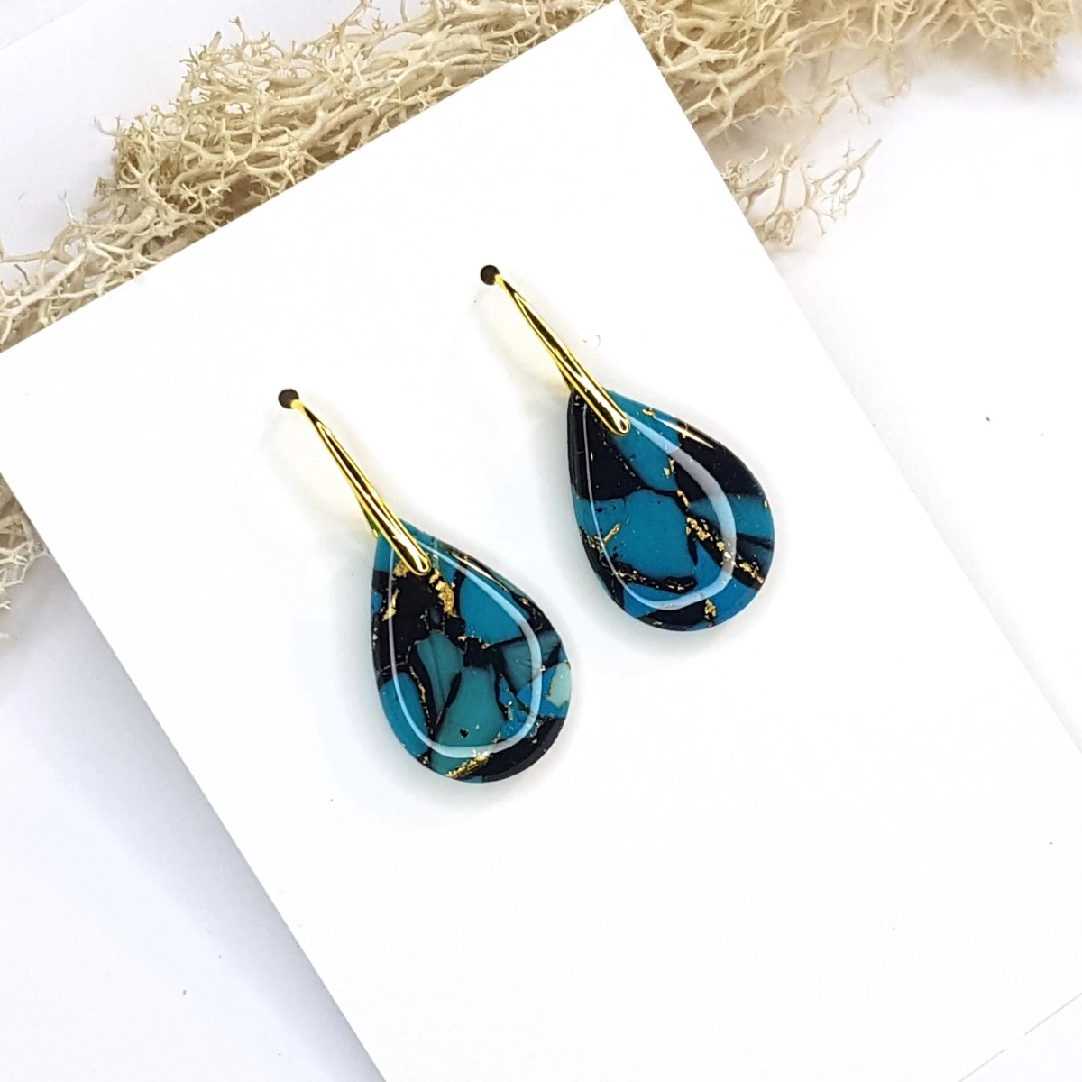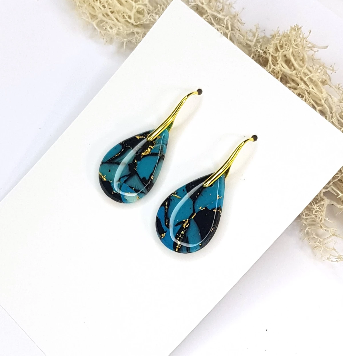 Te kolczyki to połączenie głębi czerni i hipnotyzującego turkusu, zamknięte w eleganckiej formie o długości 4 cm! podwieszone na biglu w złotym kolorze🌊🖤 Wykonane ręcznie z gliny polimerowej i powleczone żywicą epoksydową, zachwycają intensywnym kolorem i lustrzanym połyskiem. Turkusowe wzory przypominają oceaniczne fale rozbijające się o nocne niebo, tworząc efekt tajemniczej głębi.