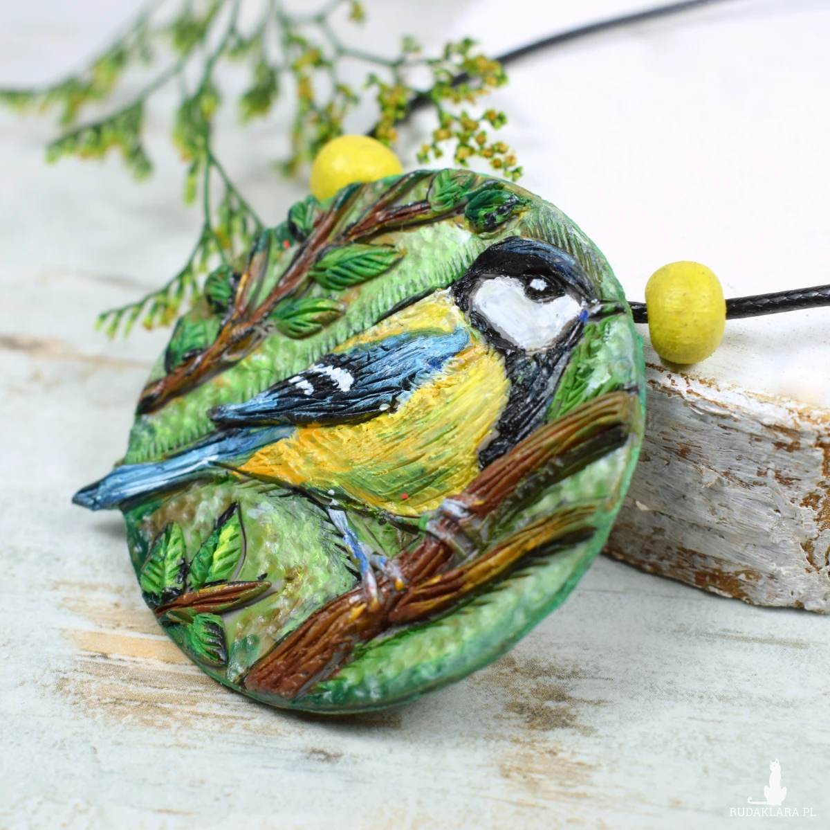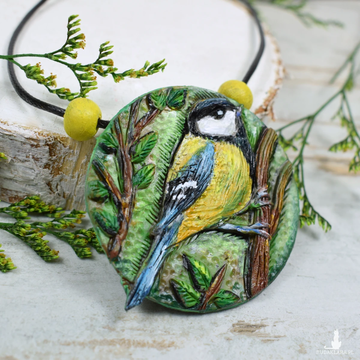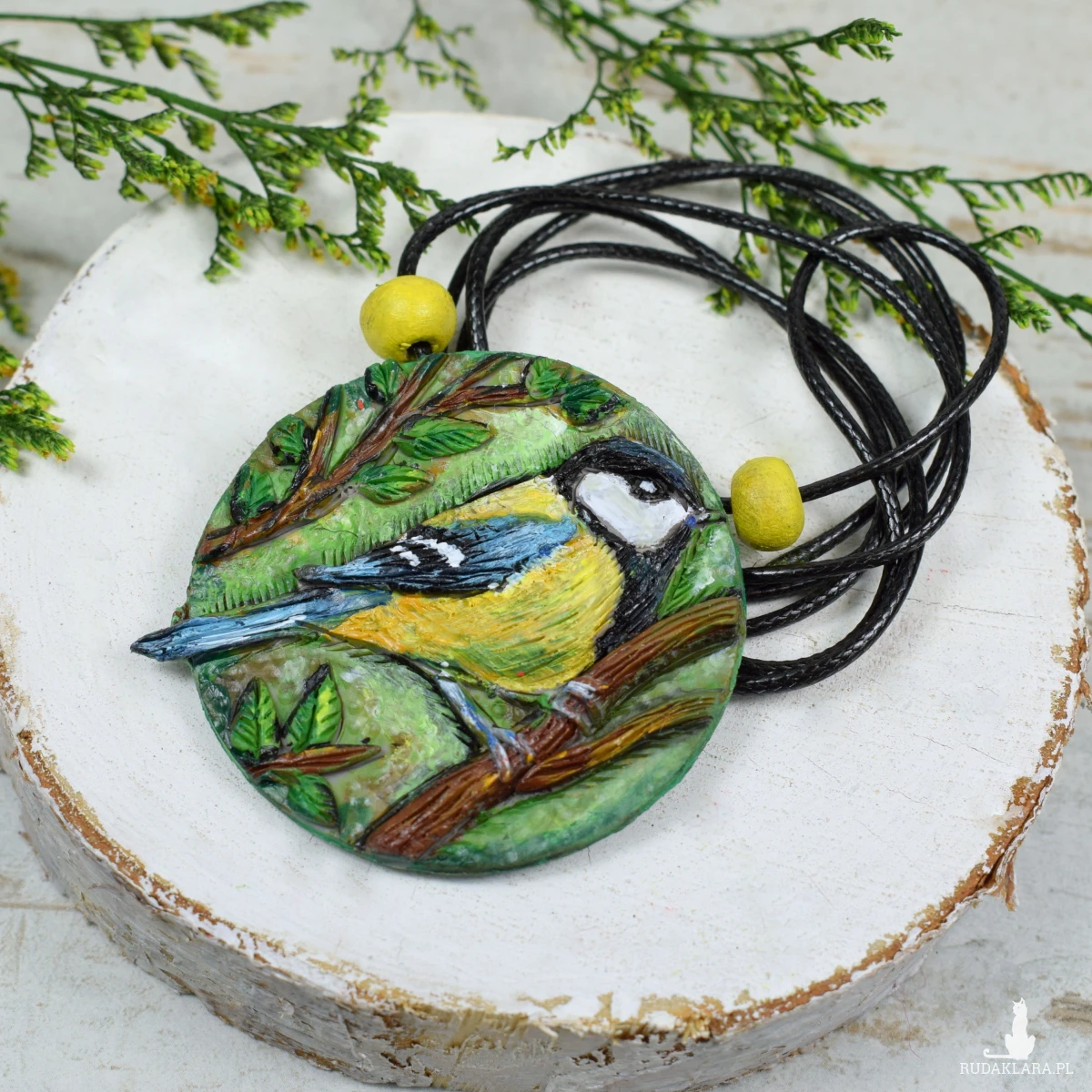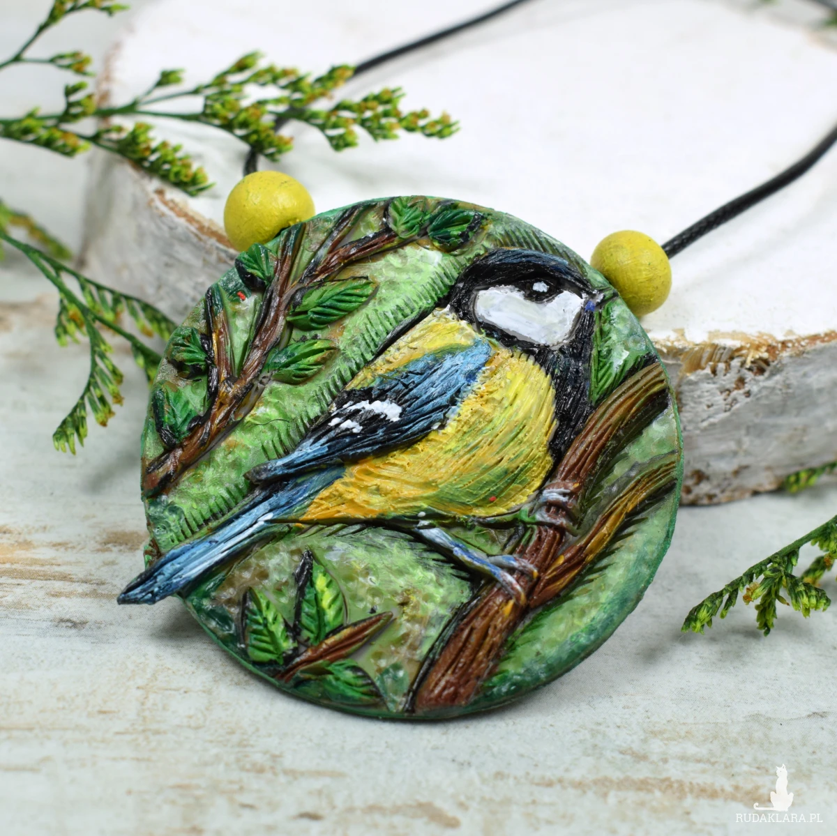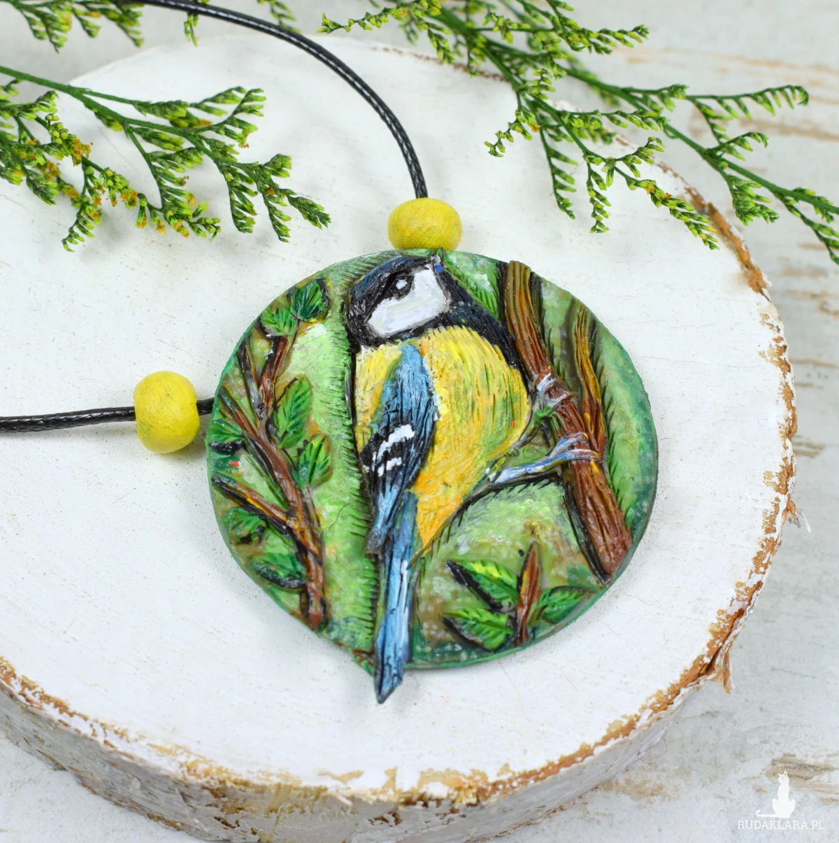 Unikatowy, ręcznie wykonany wisiorek z motywem sikorki.
