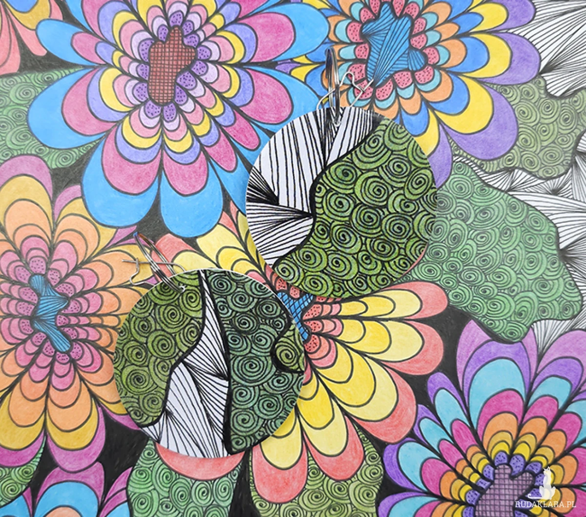 Kolczyki wykonane z drewnianej bazy oraz części mojego autorskiego rysunku "Radość".