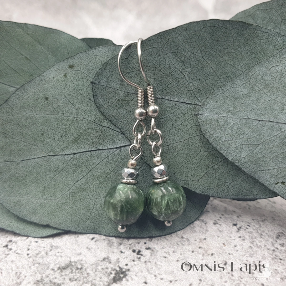 Delikatne, kobiece kolczyki w kolorze tajemniczej zieleni. Ozdobione kulami naturalnego serafinitu oraz fasetowanymi hematytami. Wykonane ze stali szlachetnej.