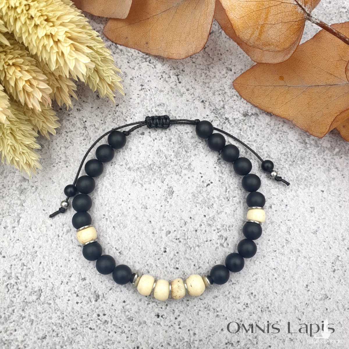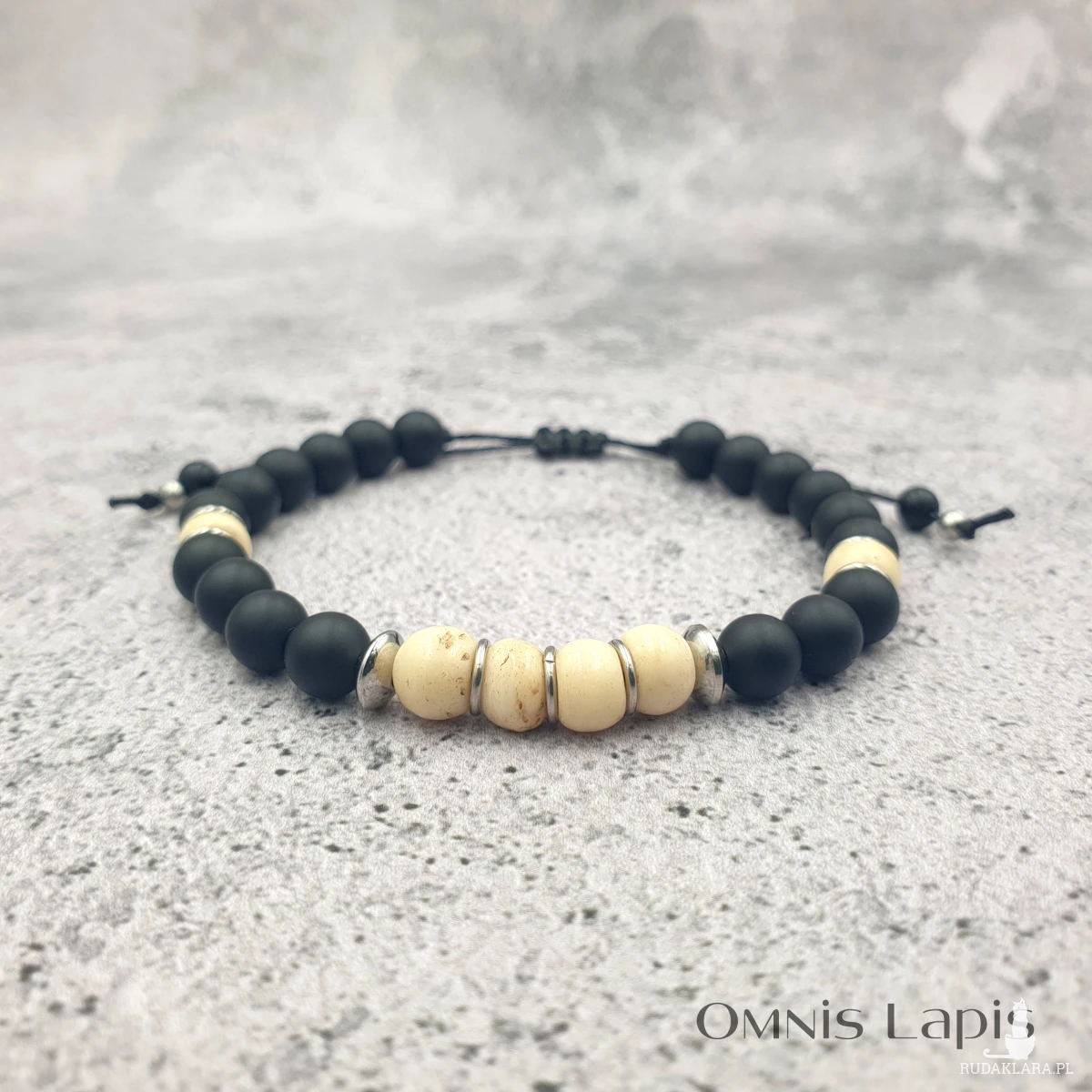 Wykonana z kul czarnego onyksu. Główną ozdobę bransoletki stanowią przekładki z naturalnej kości bawolej.
