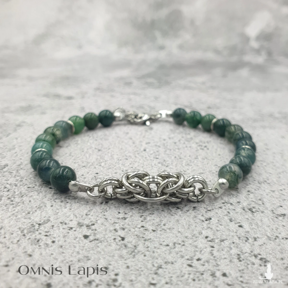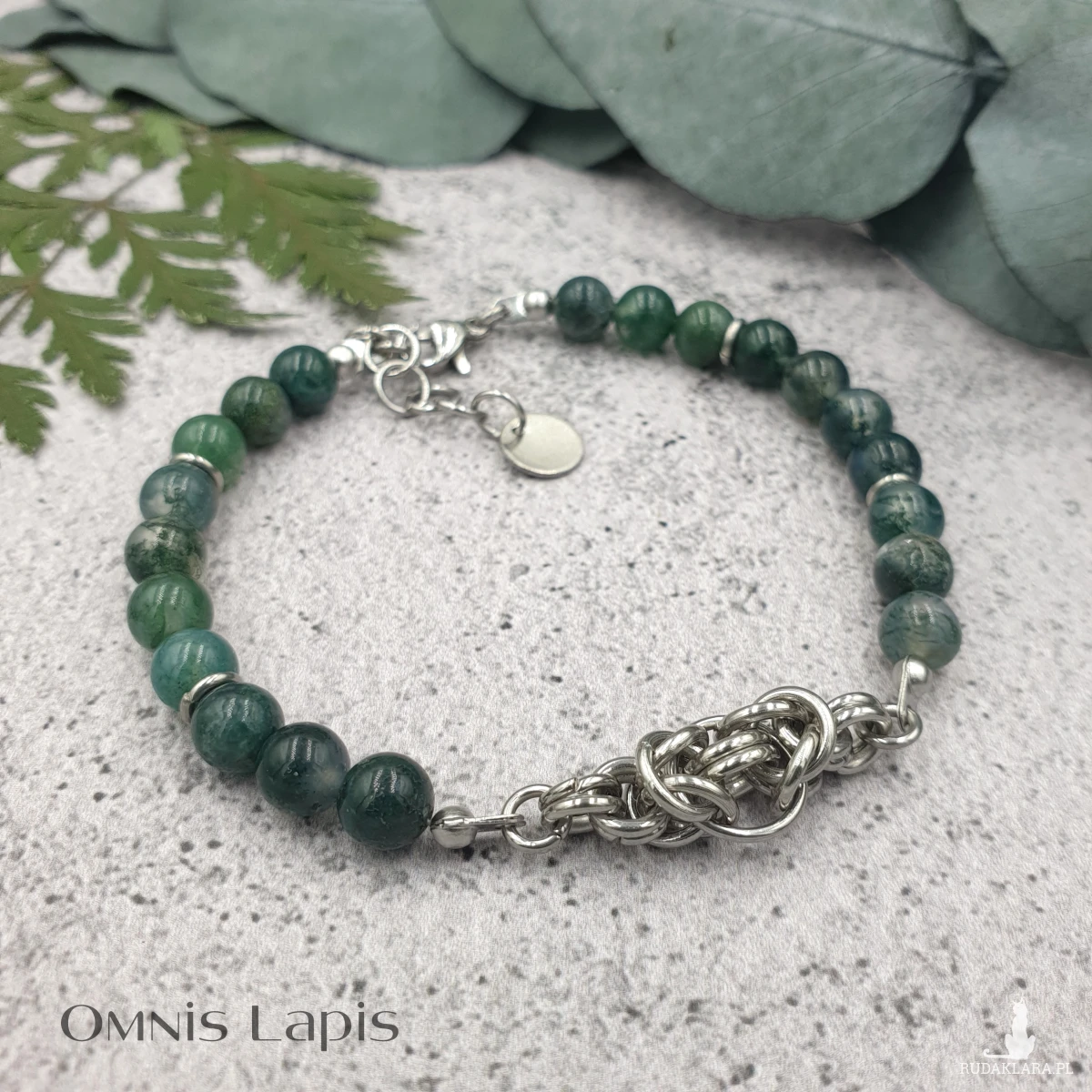 Okazała bransoletka wykonana w technice chainmaille: dawnej sztuce tworzenia łańcuchów. Bransoletka wykonana ze stali szlachetnej. Ozdobiona kulami naturalnego agatu mszystego.