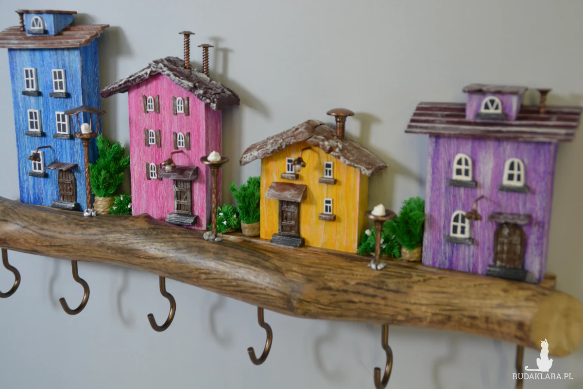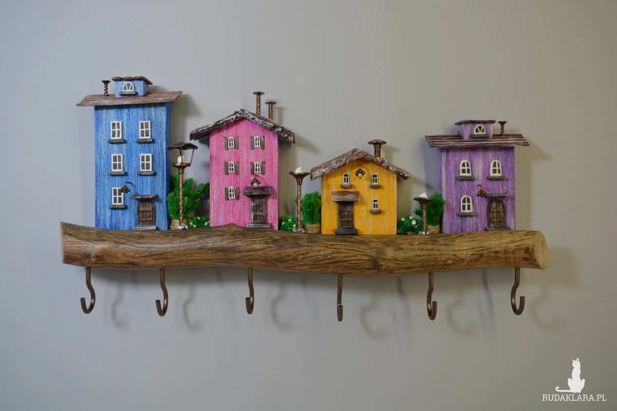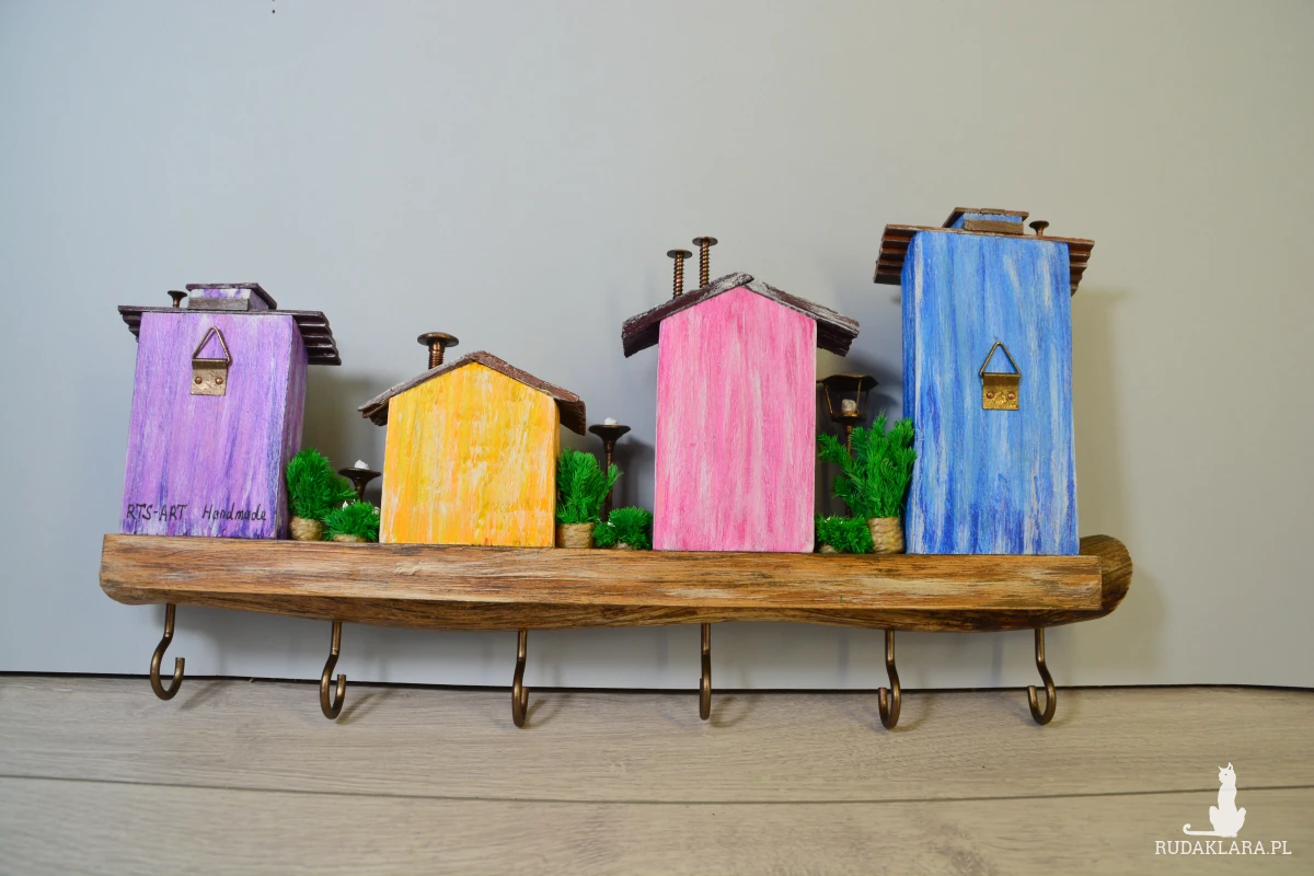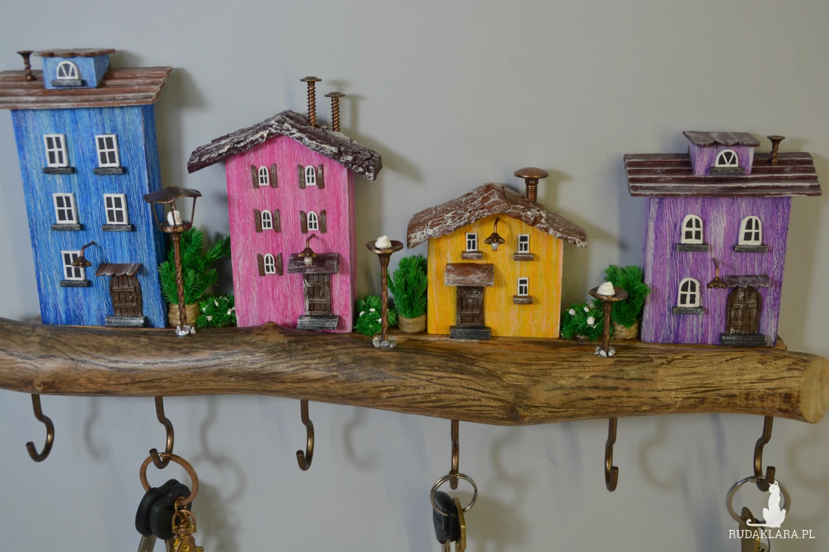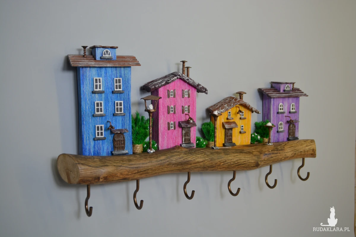 Drewniany wieszak na klucze wielobarwne domki na gałęzi. 6 haków.