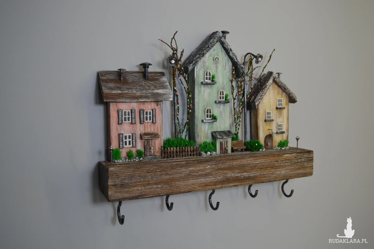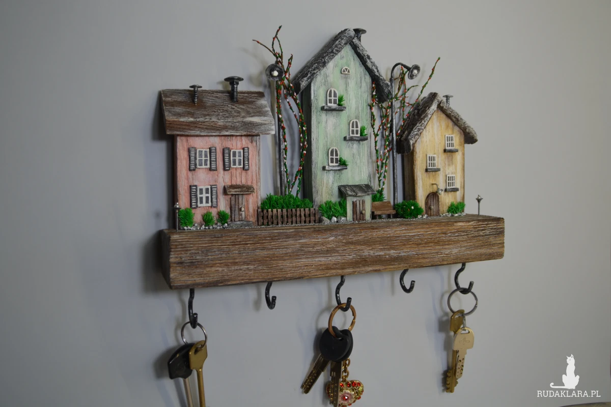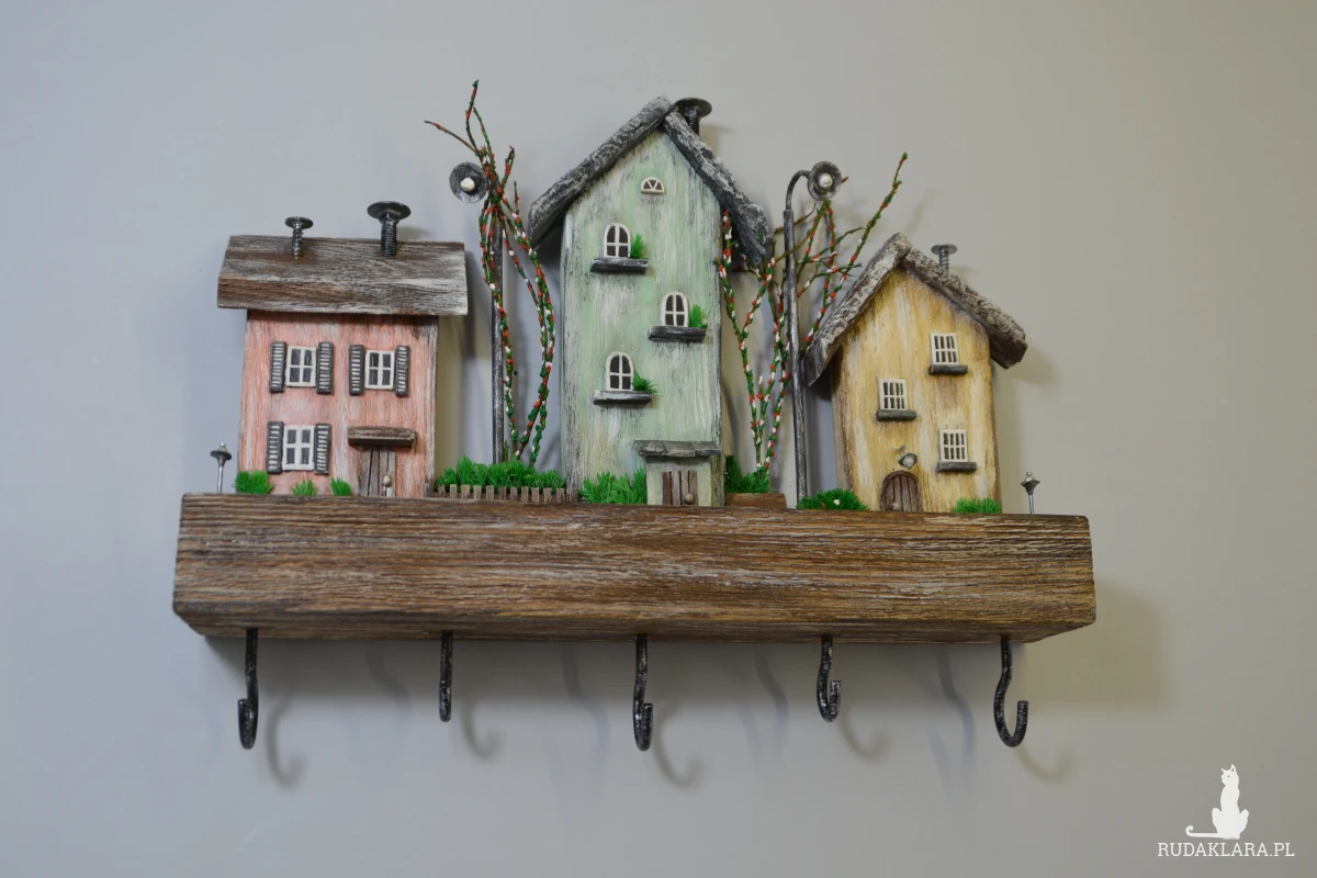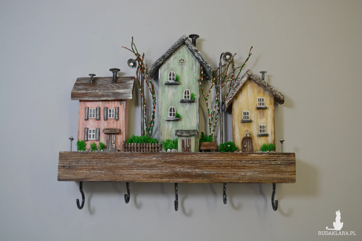 Ten drewniany wieszak na klucze wykonany jest z drewna sosnowego. Małe drewniane domki ze starego drewna oraz śrub, gwoździ, podkładek do śrub i nie tylko. Domy są ręcznie malowane ekologicznymi farbami na bazie wody. Wszystkie materiały, których używam są ekologiczne, pochodzą z napraw i recyklingu. Daję drugie życie starym, zapomnianym materiałom.