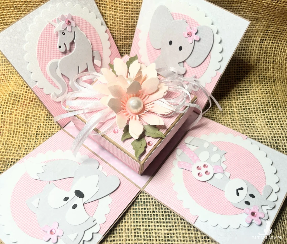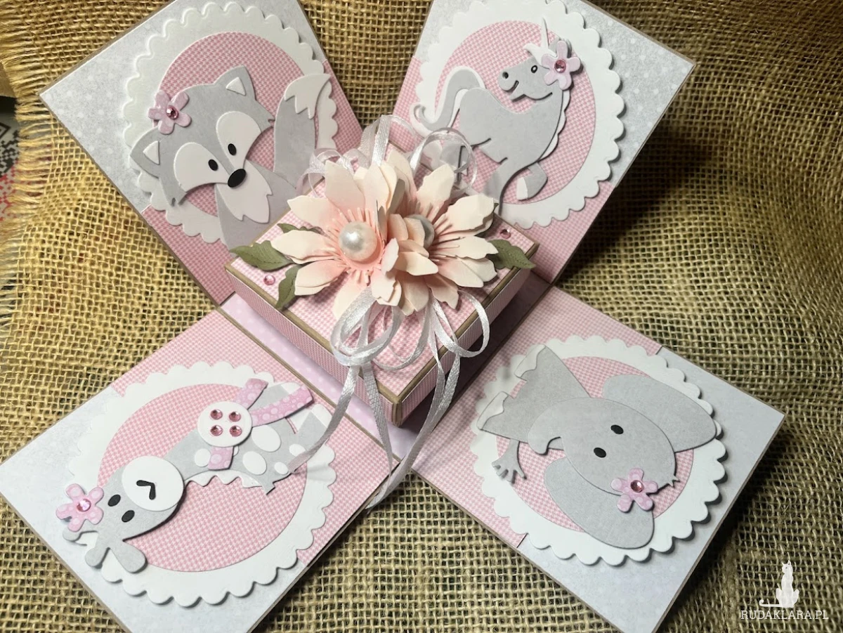 Exploding box na chrzest,narodziny lub roczek ze słodkimi zwierzątkami w pastelowych kolorach - wersja dla dziewczynki.Pudełeczko wykonane z największą dbałością o szczegóły.Wieczko ozdobione kompozycją kwiatową. W środku znajduje się jeszcze jedno pudełeczko na małe co nieco,pod wieczkiem boxa umieszczone są życzenia odpowiednie do uroczystości lub czysty karnecik na wypisanie własnych życzeń.Na czterech ściankach pod zwierzątkami znajdują się kieszonki na banknoty lub kupony lotto.Pudełko w tym stanie jest gotowe do natychmiastowej wysyłki w uwagach napisać na jaką okoliczność .