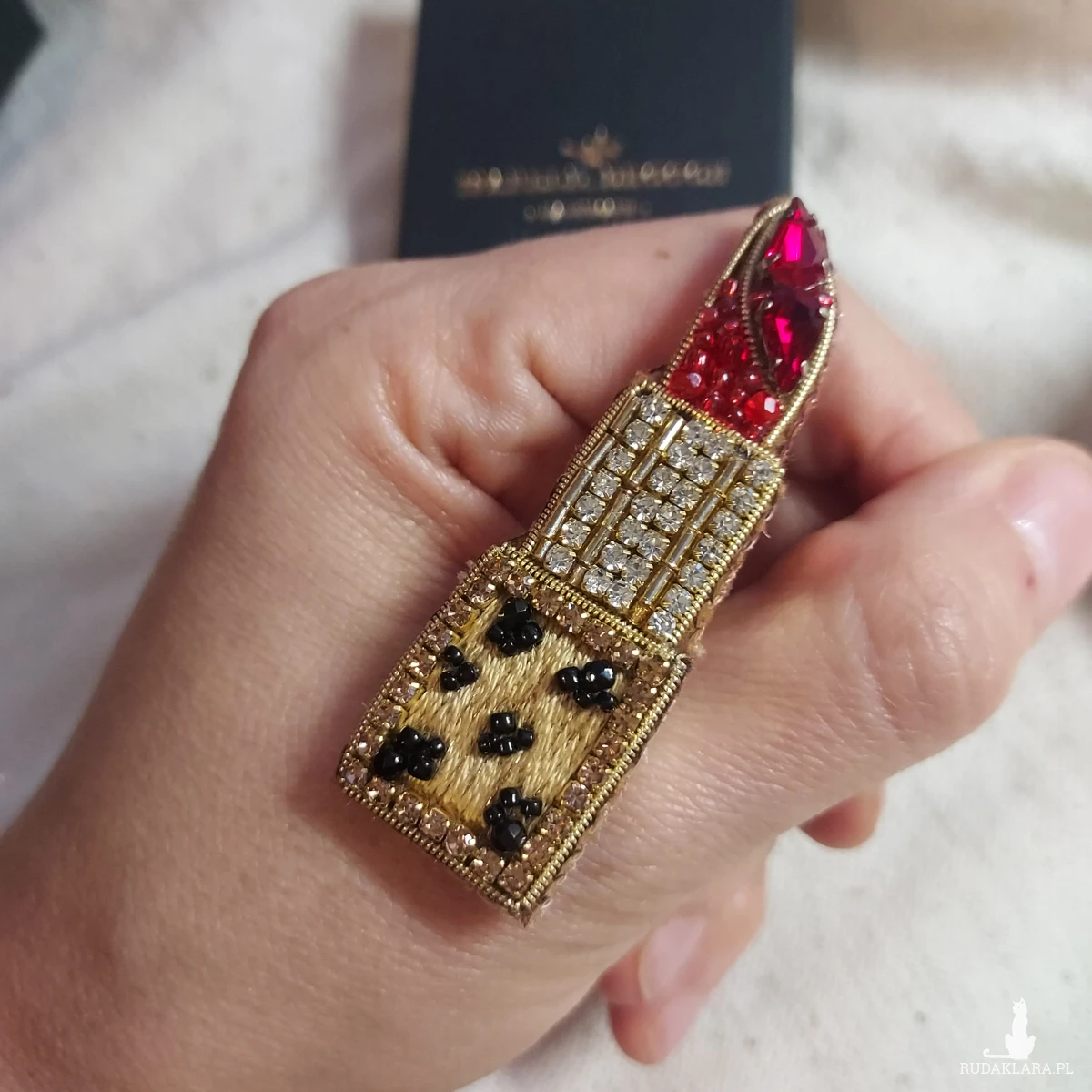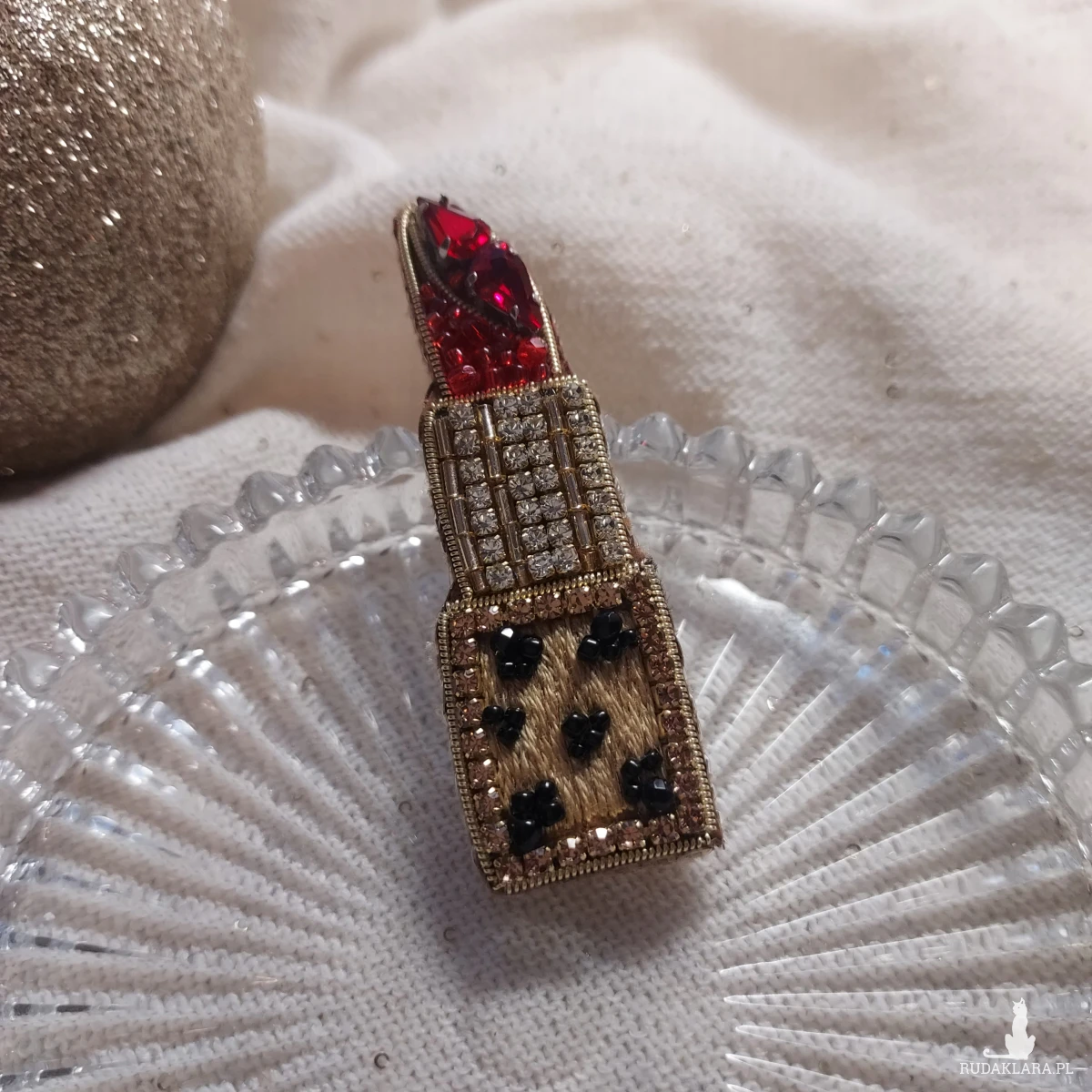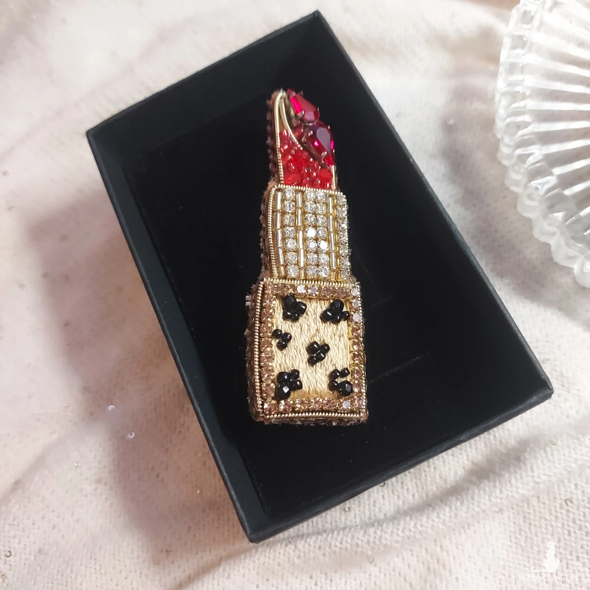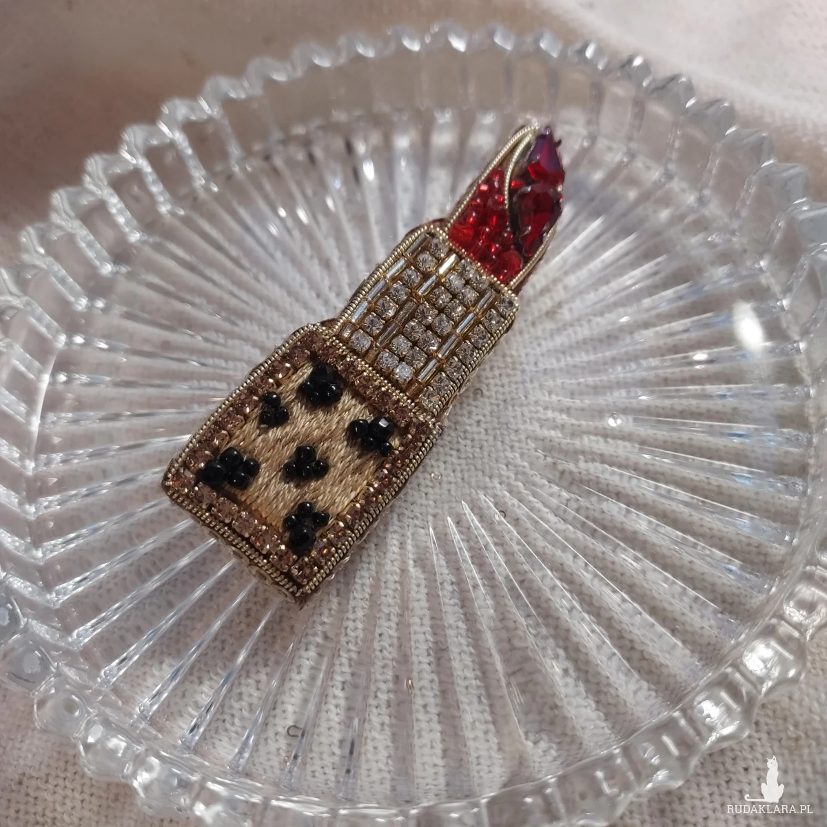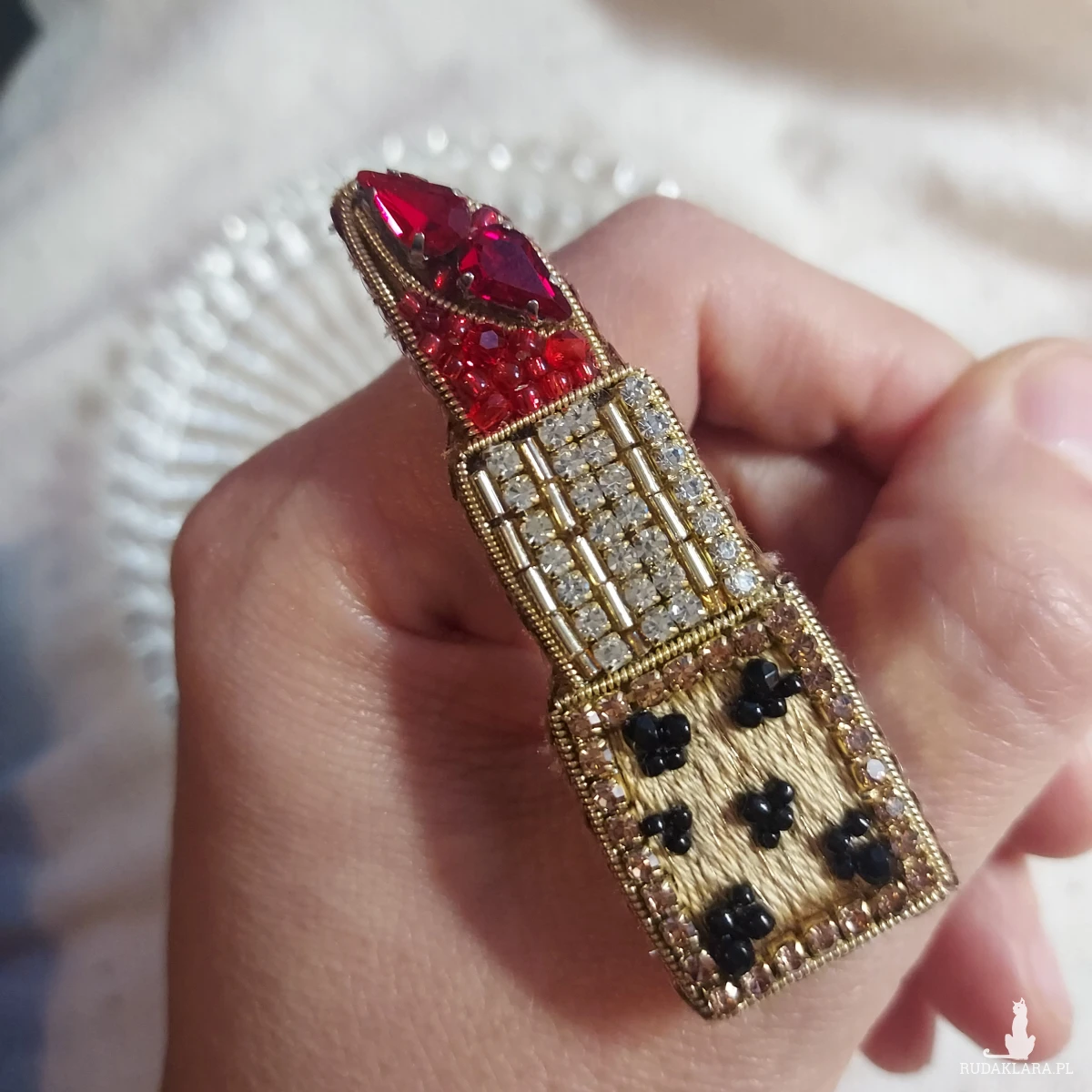 Broszka szminka powstała techniką haftu koralikowego. Jej piękno urzeka.