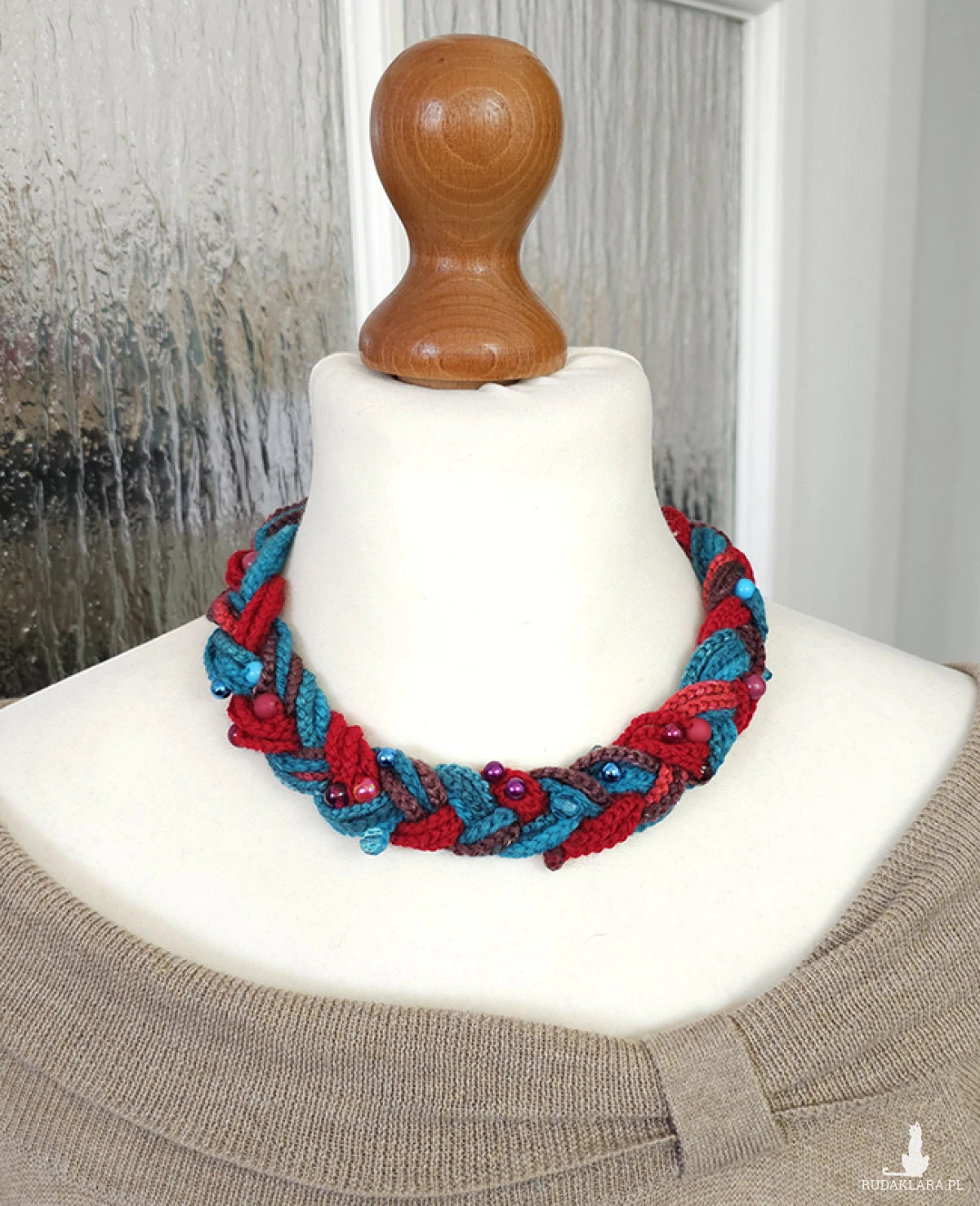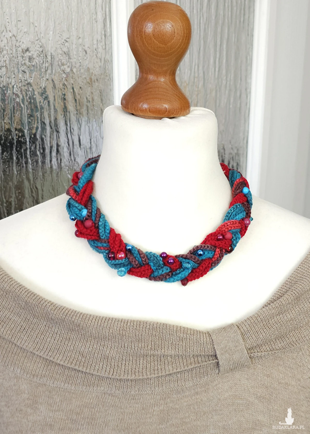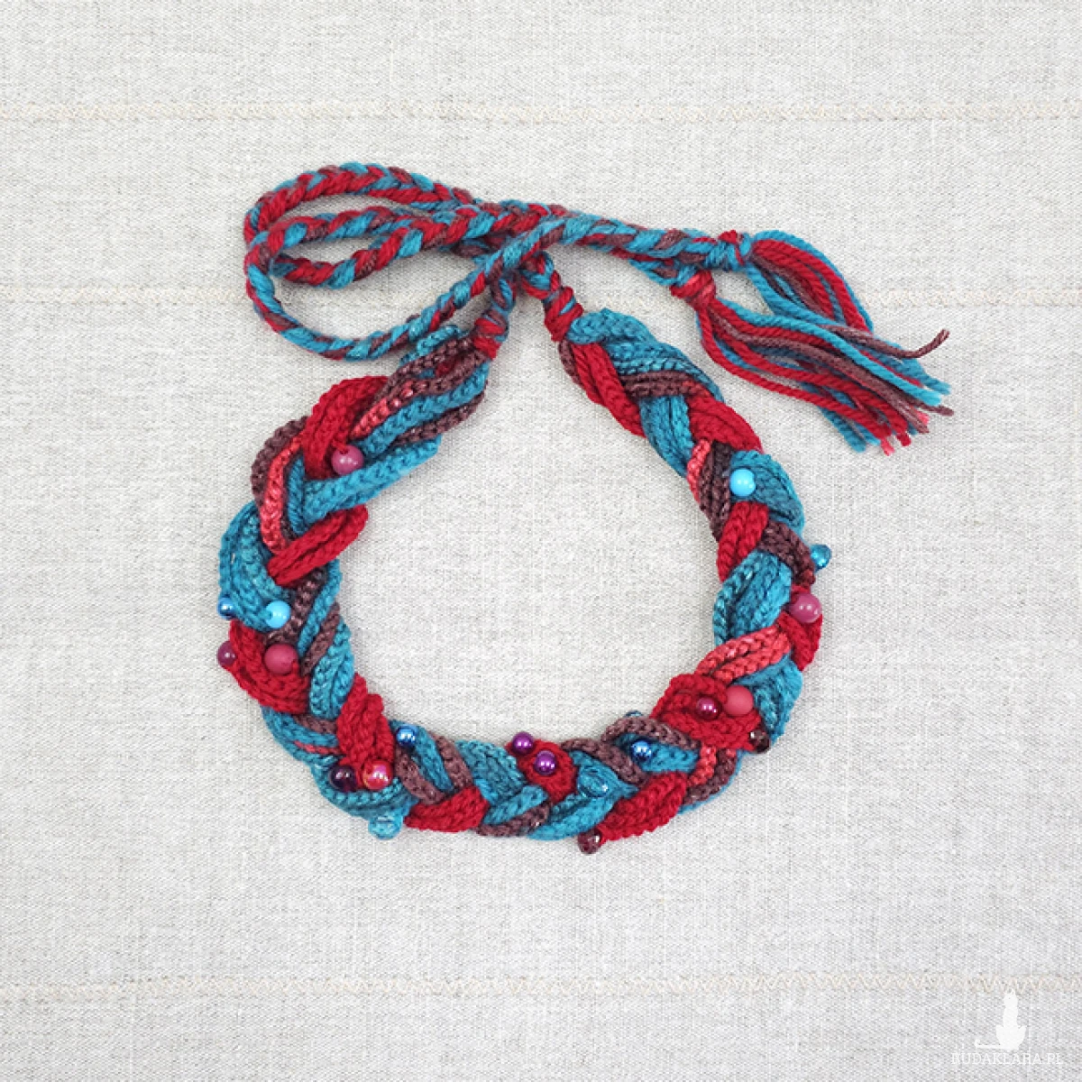 Naszyjnik wykonany z 12 szt. ręcznie plecionych sznurków, splecionych w luźny warkocz.