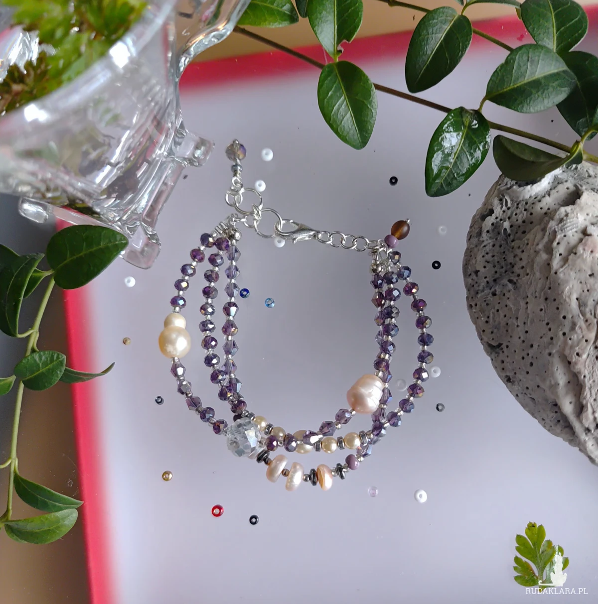 Bransoletka z kryształków szklanych i pereł hodowlanych. Przekładki z koralików szklanych i hematytów w kolorze srebrnym. szklo, metal, perly, obj. 18-20 cm