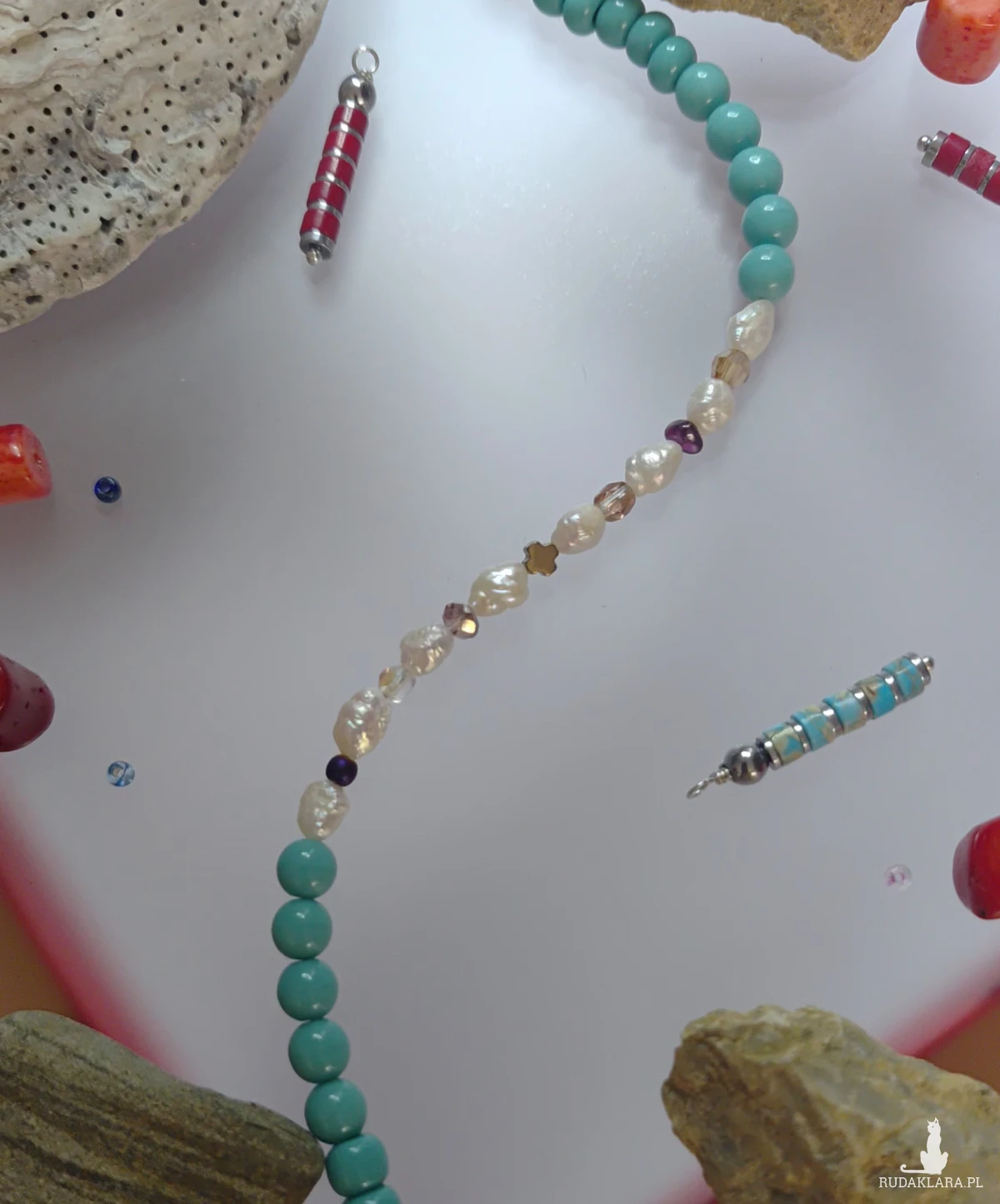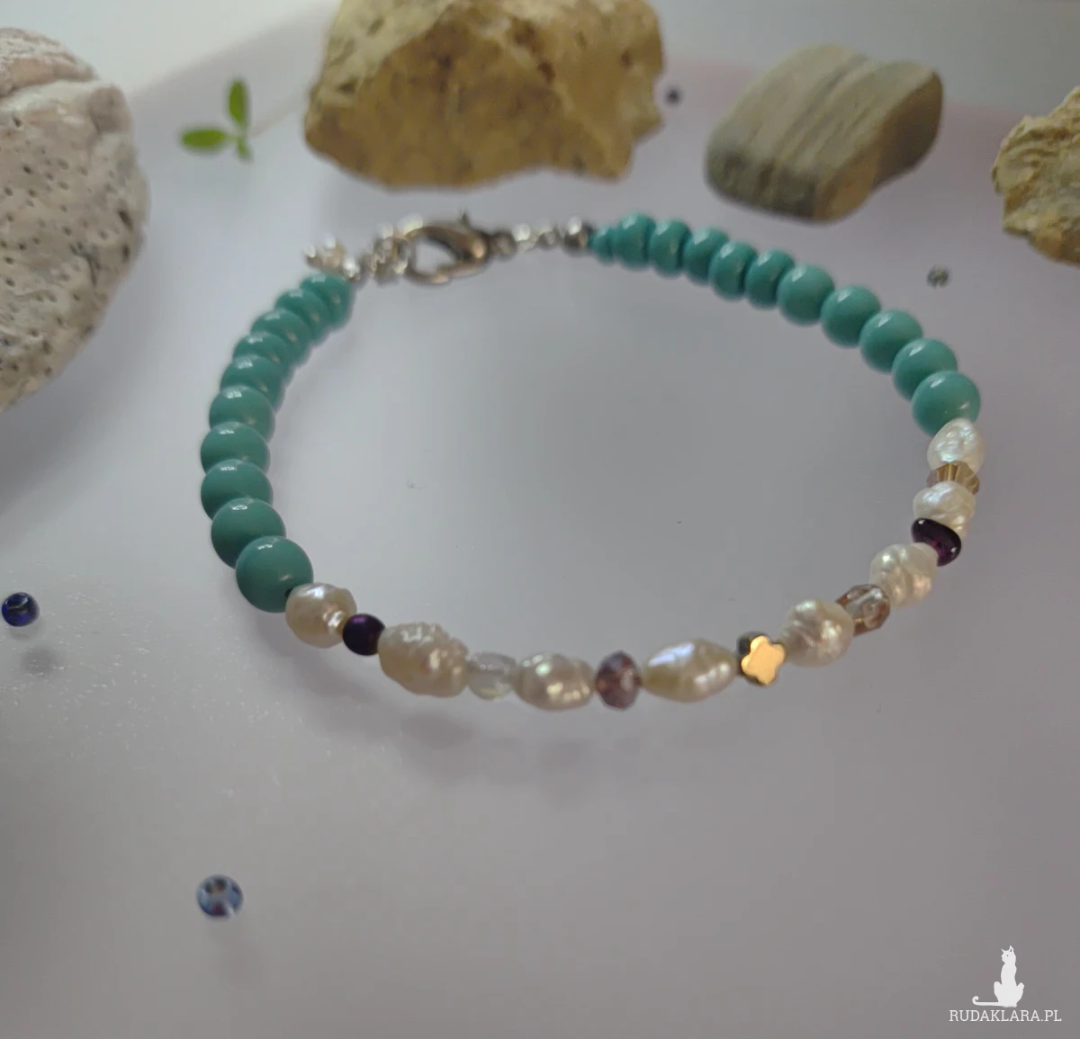 Bransoletka z malenkich perełek hodowlanych w połączeniu z kuleczką granatu, hematytu i innych przekładek malutkich. Kryształki kulki szklane w kolorze turkusowym. Bransoletka ma objętość dużą 21- 22 cm, zapięcie stal