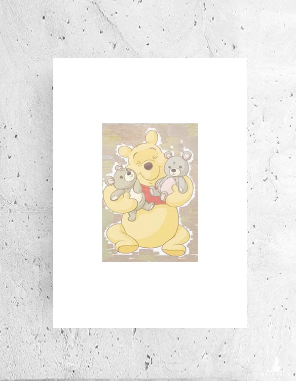 Kolorowy obrazek z Kubusiem Puchatkiem, lekko złociste tło. Grafika na jasnym kartoniku w rozmiarze A4.. Dekoracja na ścianę do dziecięcego pokoju, kuchni, jadalni, sypialni, żłobka, przedszkola, bawialni, klubu malucha itp. Poster wystarczy dać do ramki w rozmiarze 21 x 30 cm..