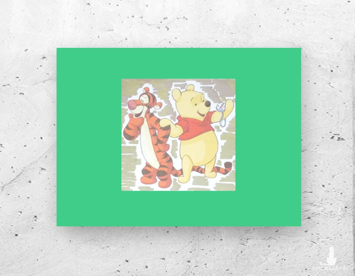 Nowy, kolorowy obrazek z bajki o Kubusiu Puchatku, lekko złociste tło. Grafika na zielonym kartoniku w rozmiarze A4. Plakat na ścianę do dziecięcego pokoju, kuchni, jadalni, sypialni, żłobka, przedszkola, bawialni, klubu malucha itp. Poster wystarczy dać do ramki w rozmiarze 21 x 30 cm..