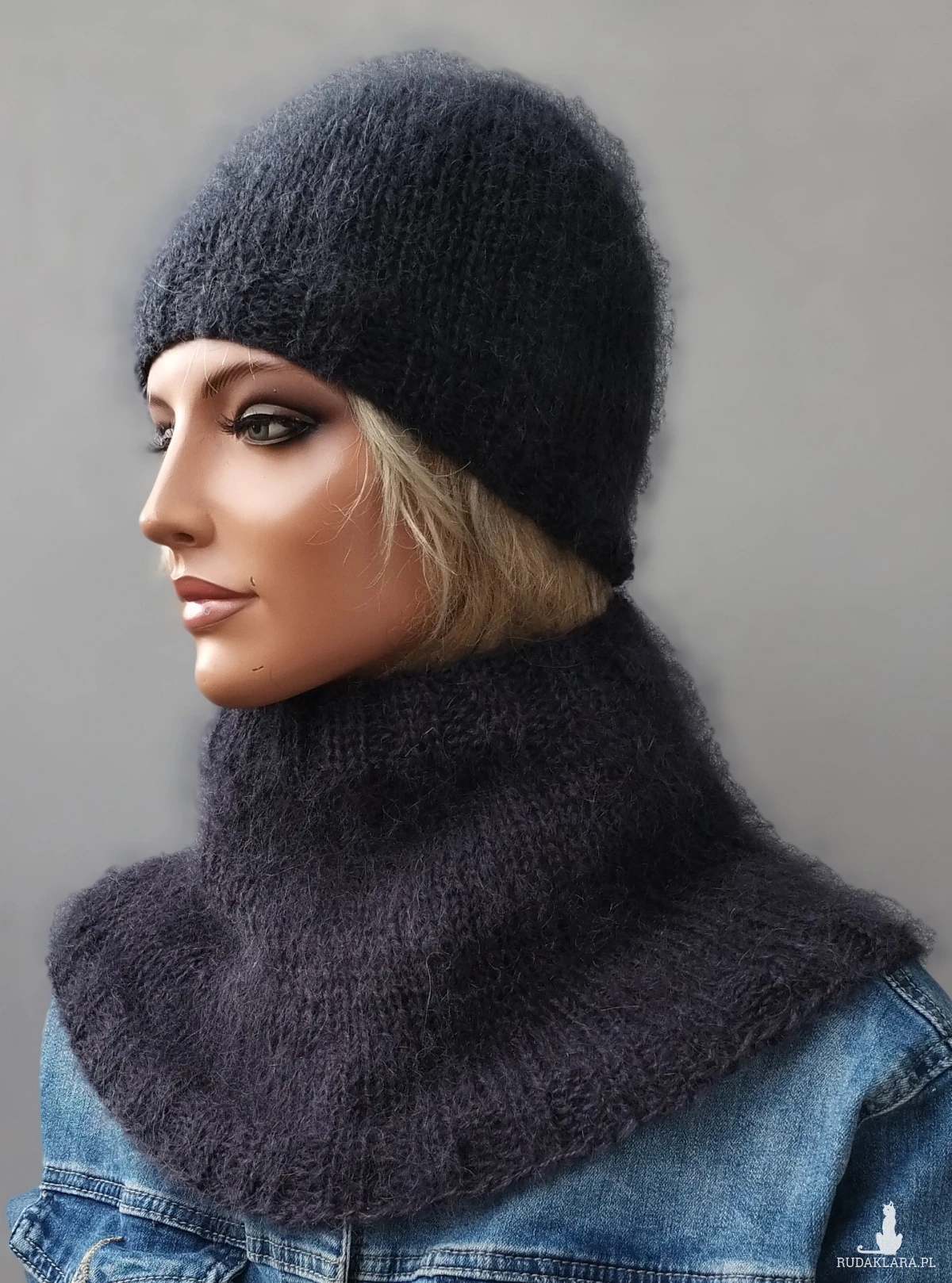 Moherowy komplet czapka i komin,zrobione ręcznie na drutach z mieszanki moheru i akrylu w kolorze grafitowym. Włóczka puszysta, miękka, nie gryzie, ma śliczny włos. Rozmiar uniwersalny. Producent włóczki zaleca pranie ręczne w temperaturze 30 stopni, suszyć na leżąco.