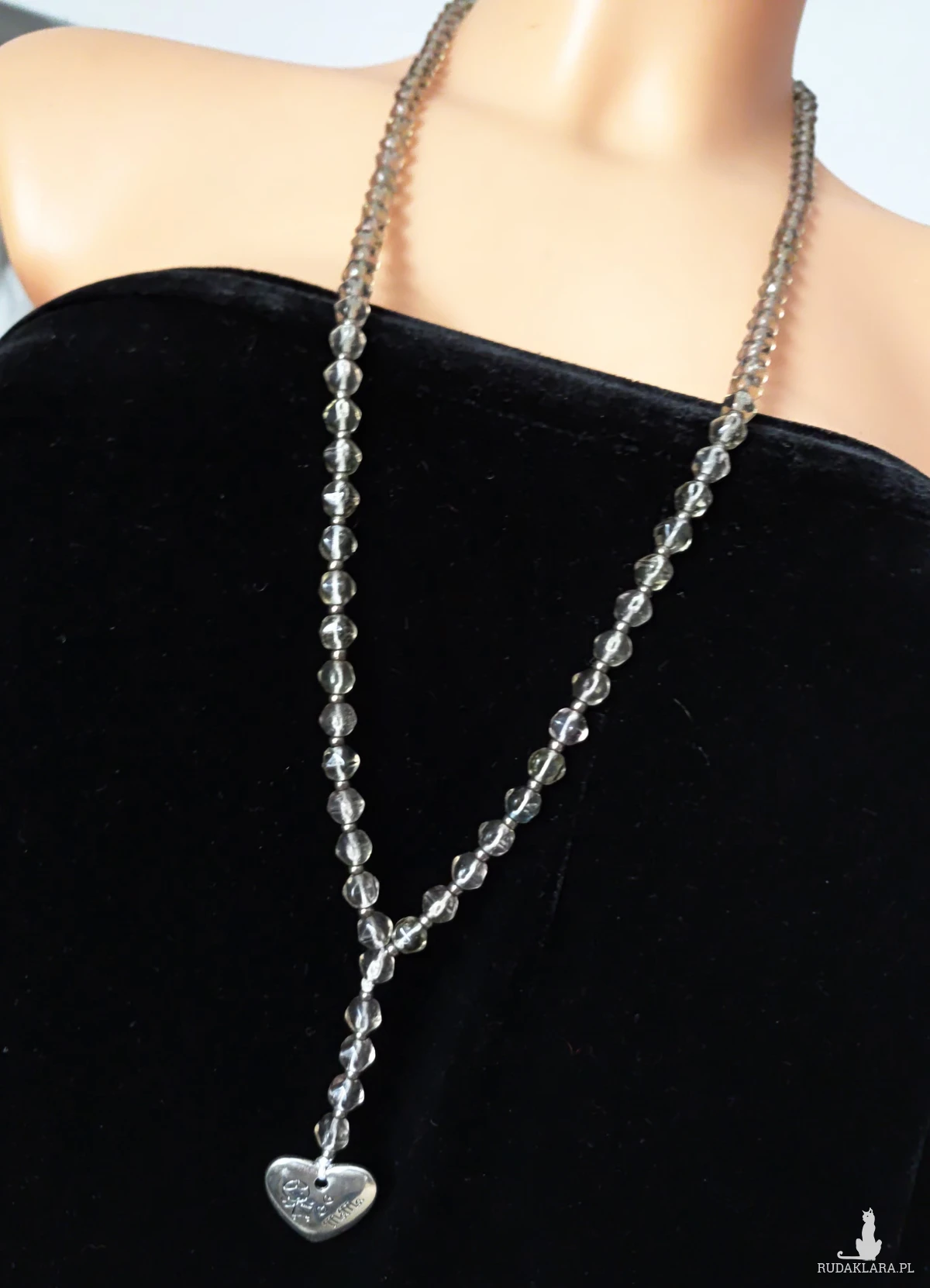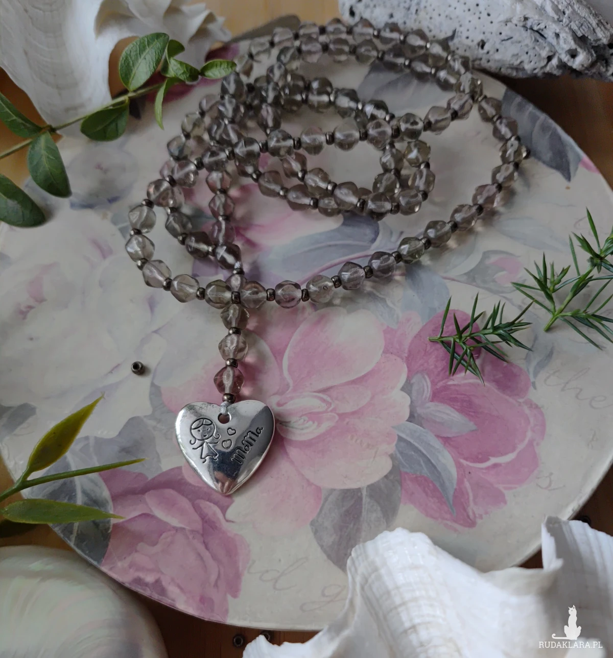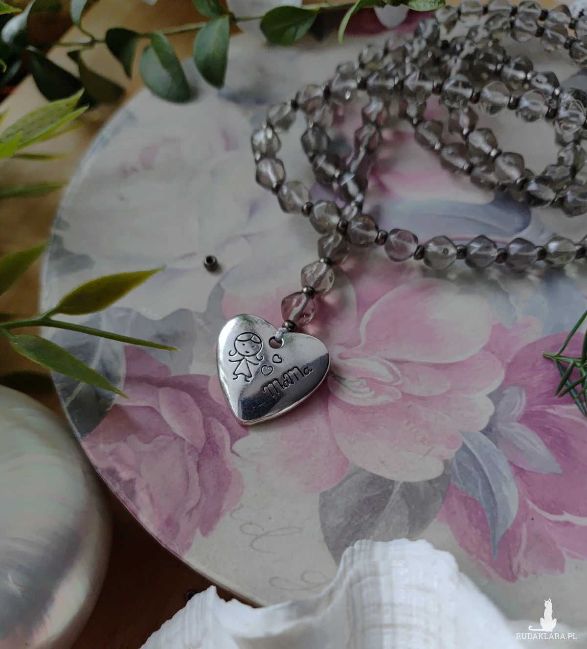 Naszyjnik korali szklanych 6 mm, kryształki przydymione z przekładkami w kolorze starego srebra. Zawieszka metalowa z napisem mama w kształcie serduszka 2 cm, naszyjnik na sznurku syntetycznym. Długość 44 cm