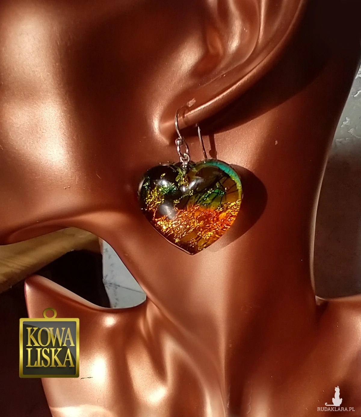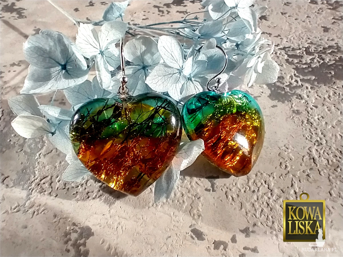 Podbarwiona żywica z zatopionym złoto-czarnym motywem zyskała intrygującą głębię i świetliste refleksy. Bursztyn i turkus tworzą zjawiskowy, miły dla oka efekt.