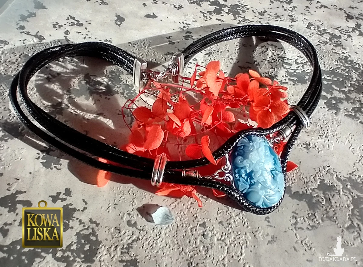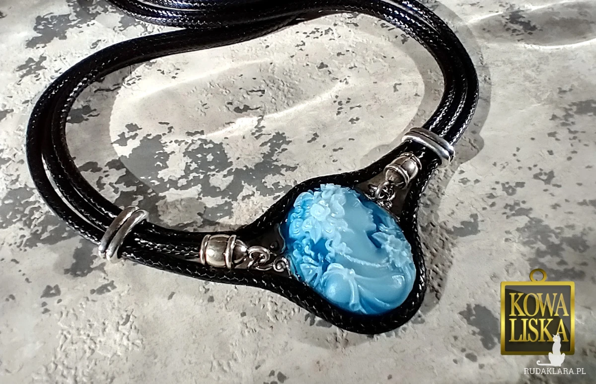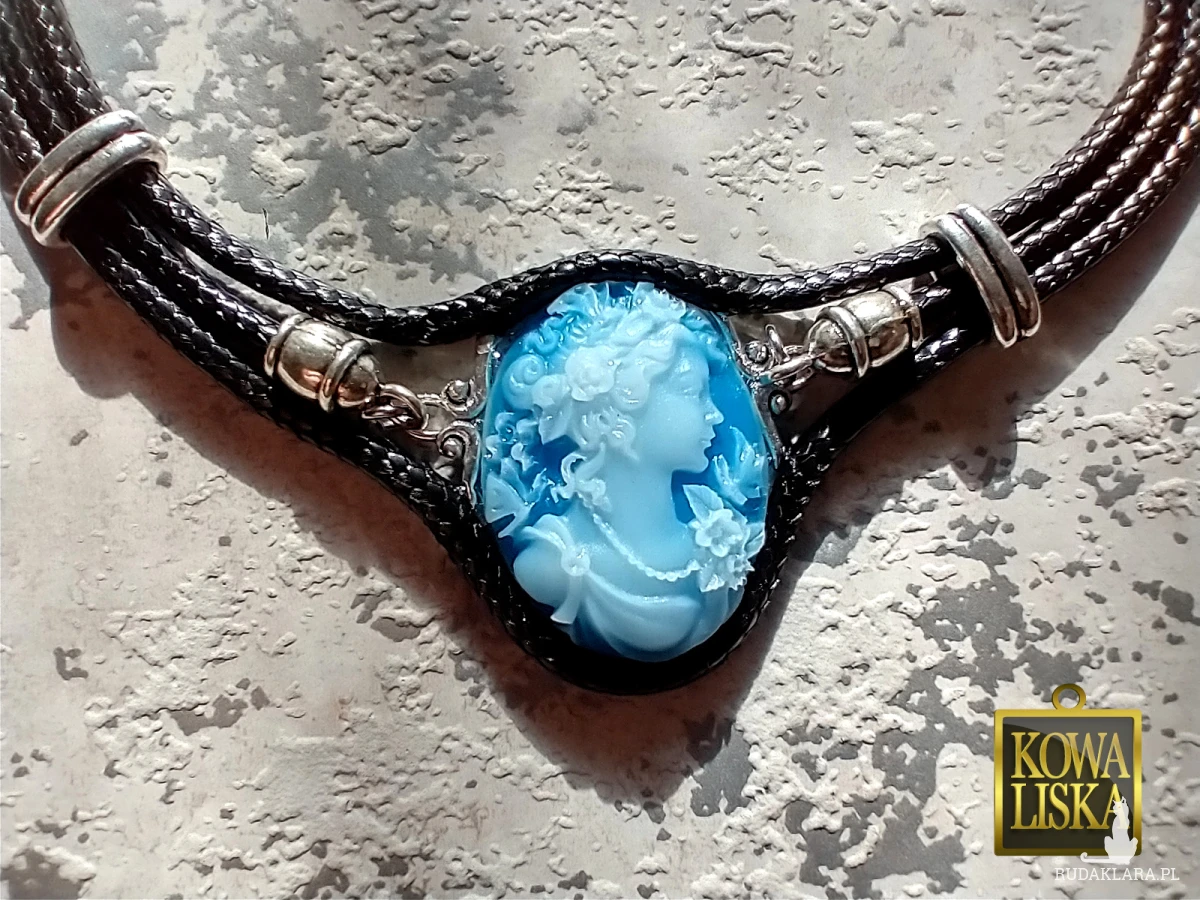 Duży kaboszon stylizowany na kameę, oprawiony w gruby sznurek i dodatki w kolorze srebra, razem tworzą wyrazistą ozdobę, świetnie dopełniającą proste stylizacje.