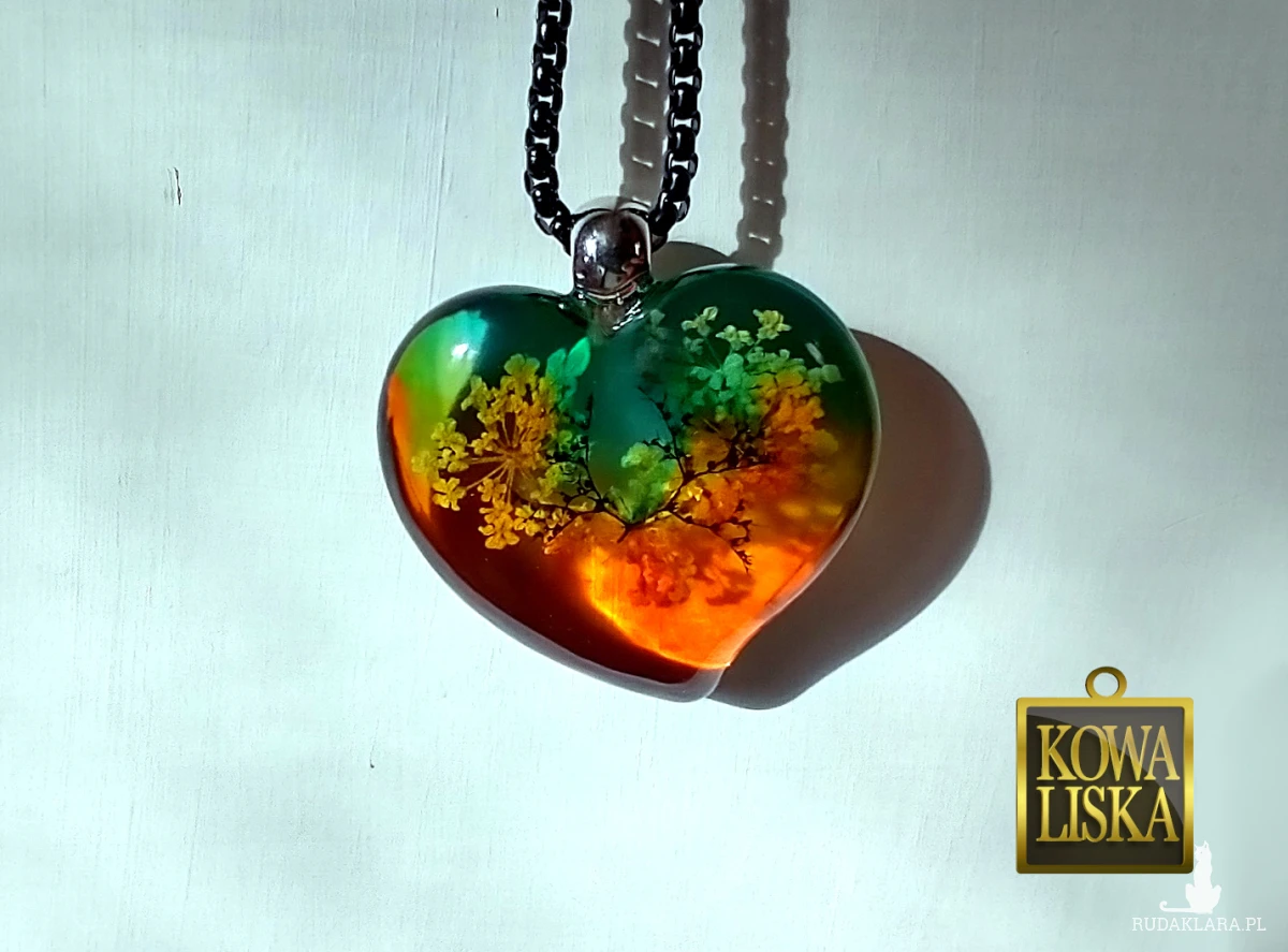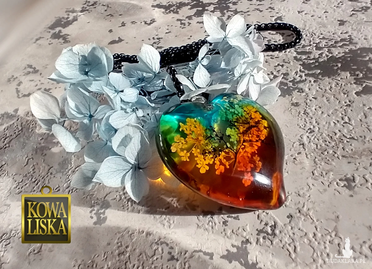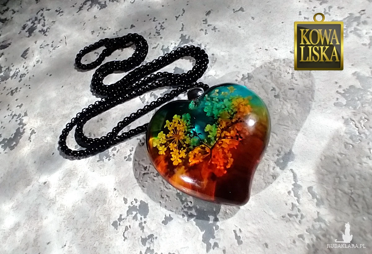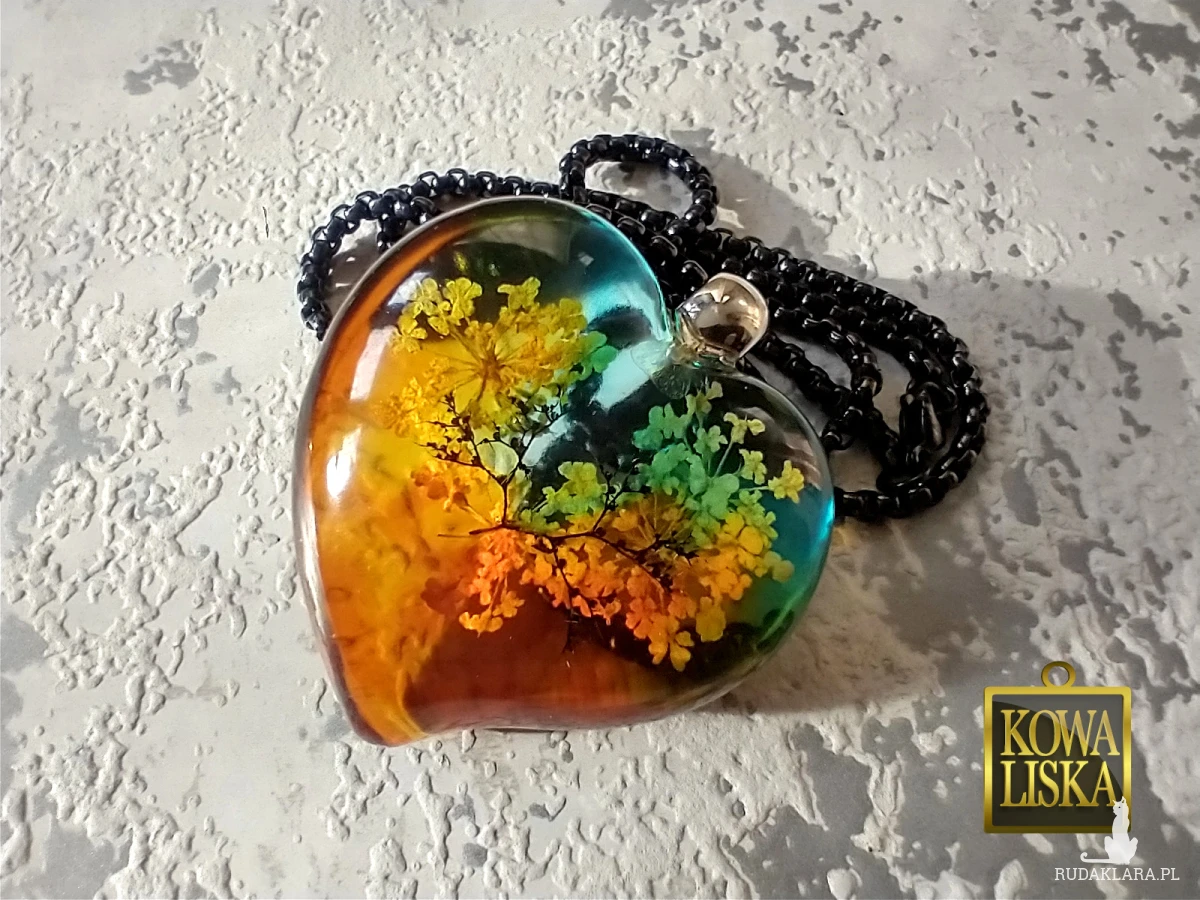 Drobne gałązki ukwiecone jesiennymi barwami, zatopione w bursztynowo - turkusowej żywicy . Czarny, masywny łańcuszek równoważy gabaryty samego wisiora i kontrastuje z lekkim, roślinnym wnętrzem.