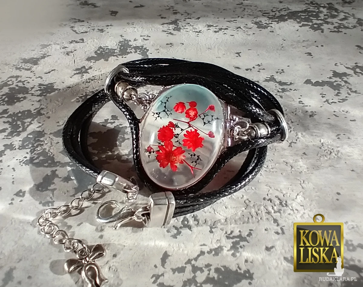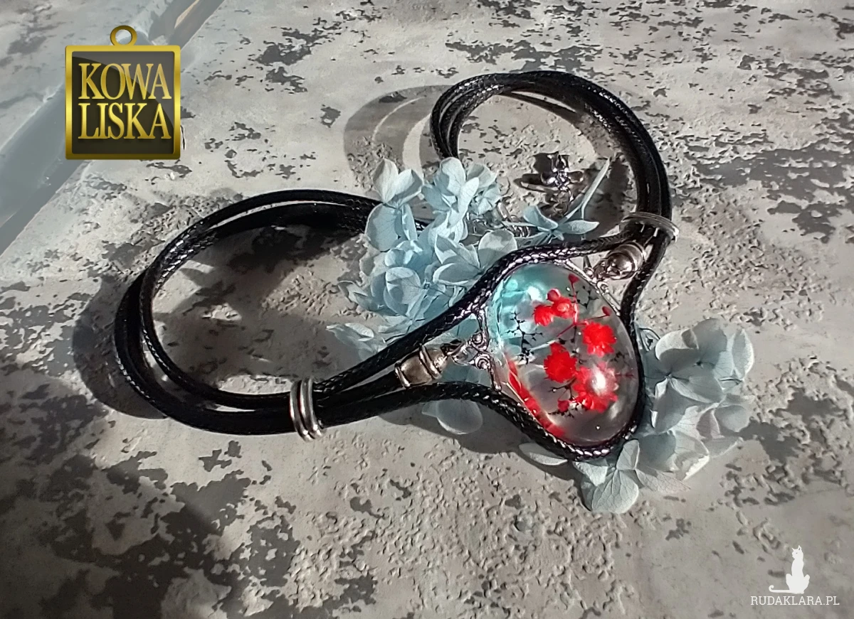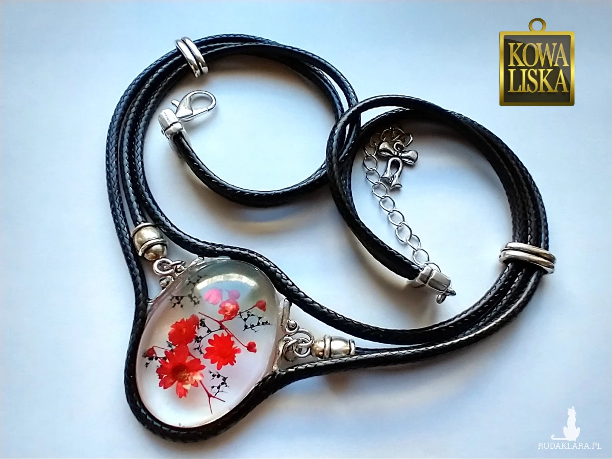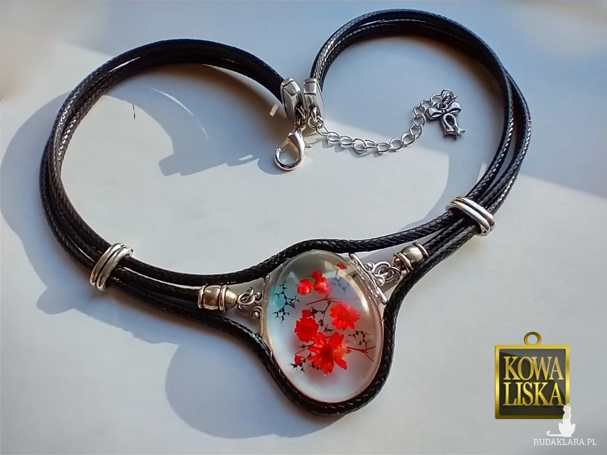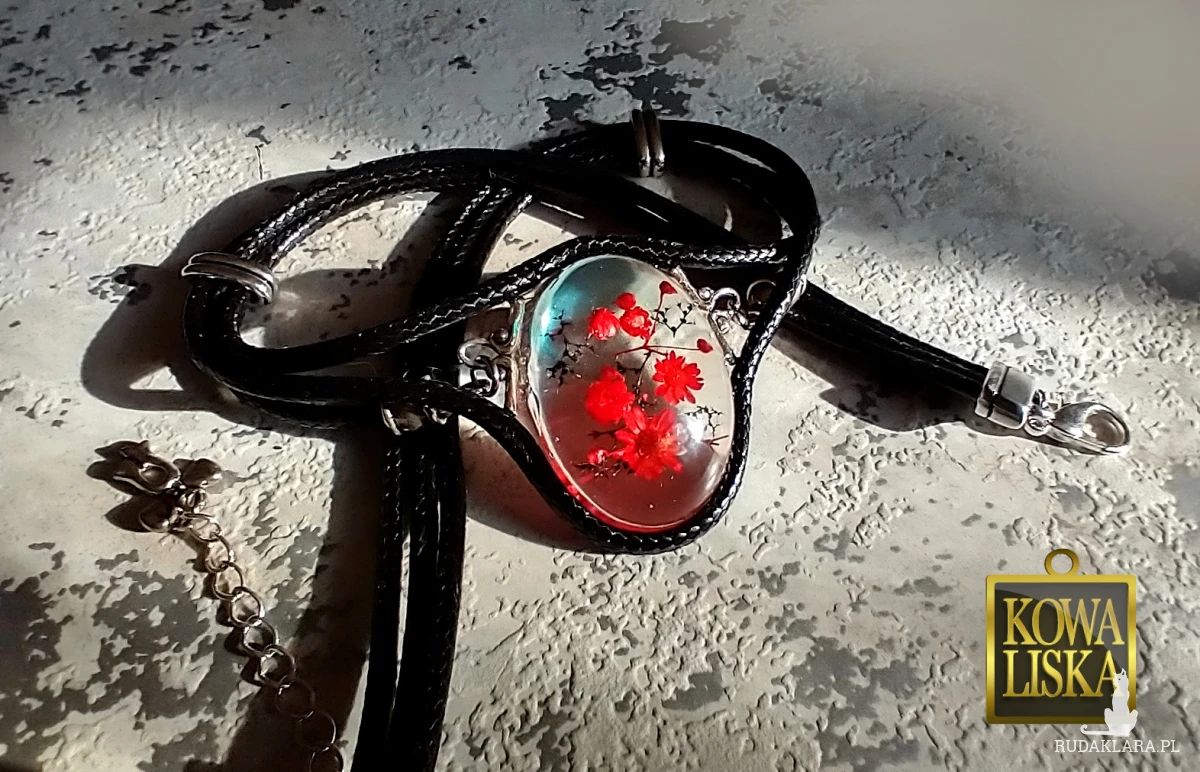 Duży kaboszon z zatopionymi kwiatami, oprawiony w gruby sznurek i dodatki w kolorze srebra, razem tworzą wyrazistą ozdobę, świetnie dopełniającą proste stylizacje.