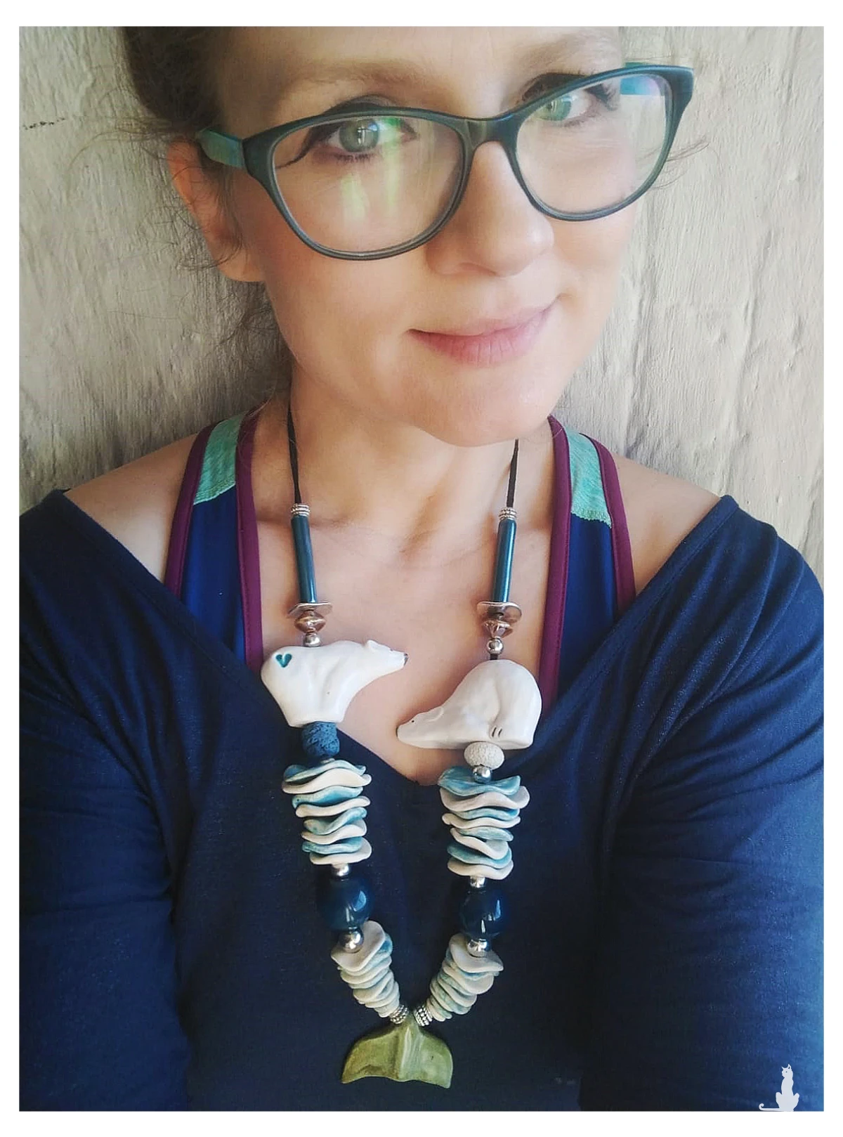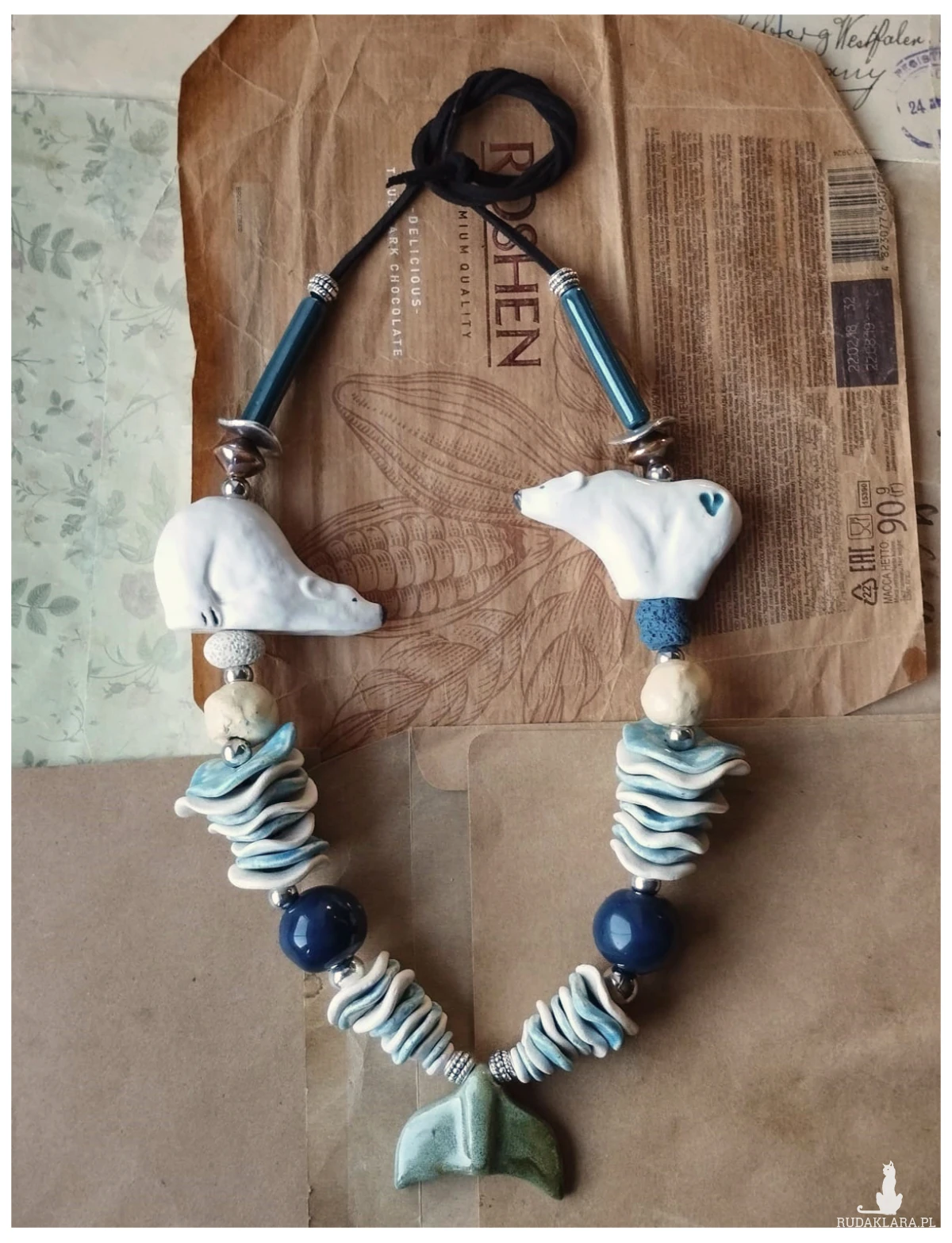 Ceramiczne korale wykonane z gliny szamotowej, wypalone na biskwit a następnie szkliwione w temperaturze 1260 stopni C. Długość ok 40 cm. W stylu arktycznym. Serdecznie polecam Paniom poszukującym nietuzinkowej biżuterii.