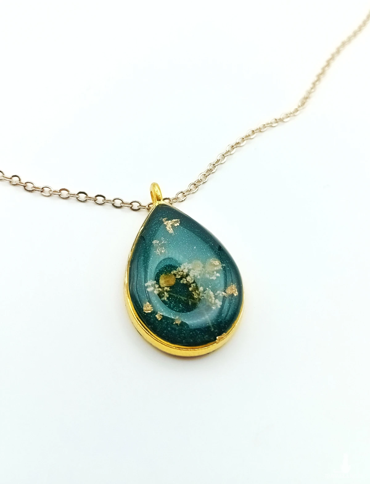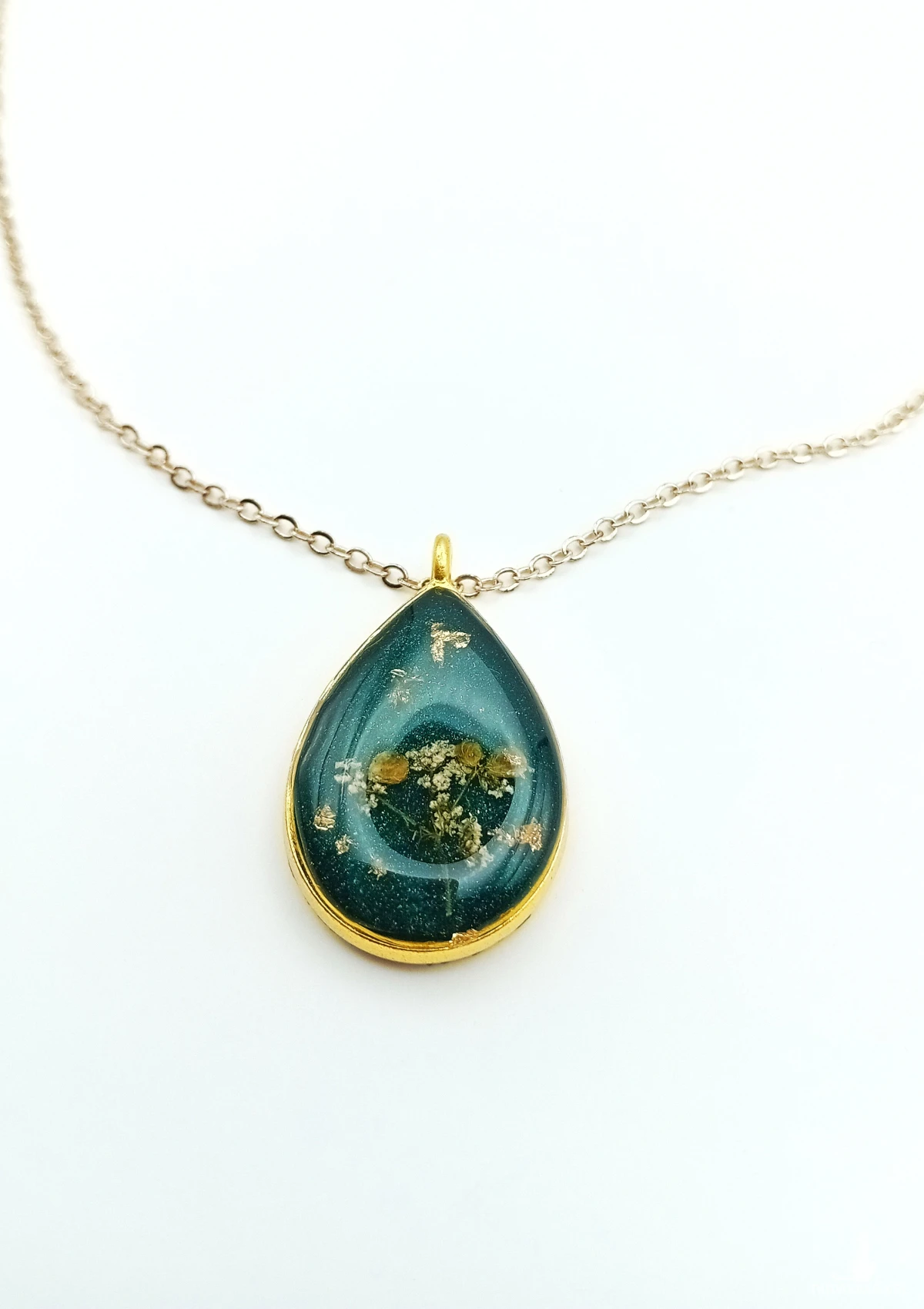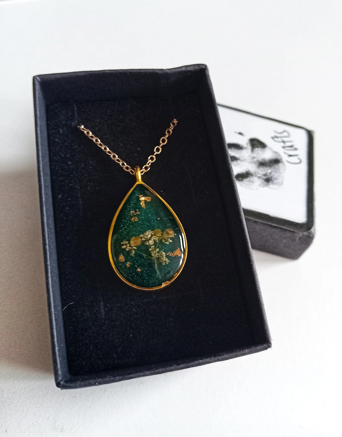 Żywica w kolorze ciemnej zieleni oraz transparentna tworzą unikalne połączenie, podkreślone suszoną białą przytulią i złotymi drobinkami. To nie tylko biżuteria, to fragment natury noszony blisko serca.