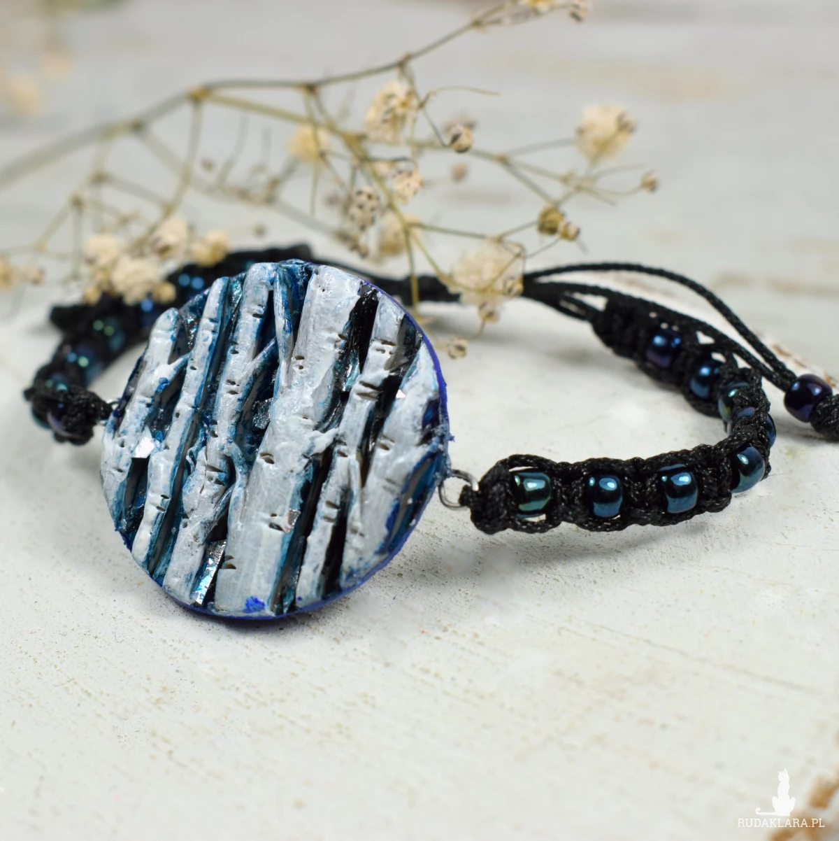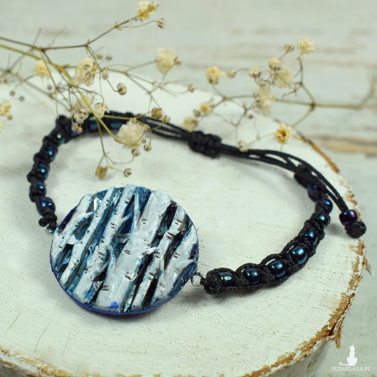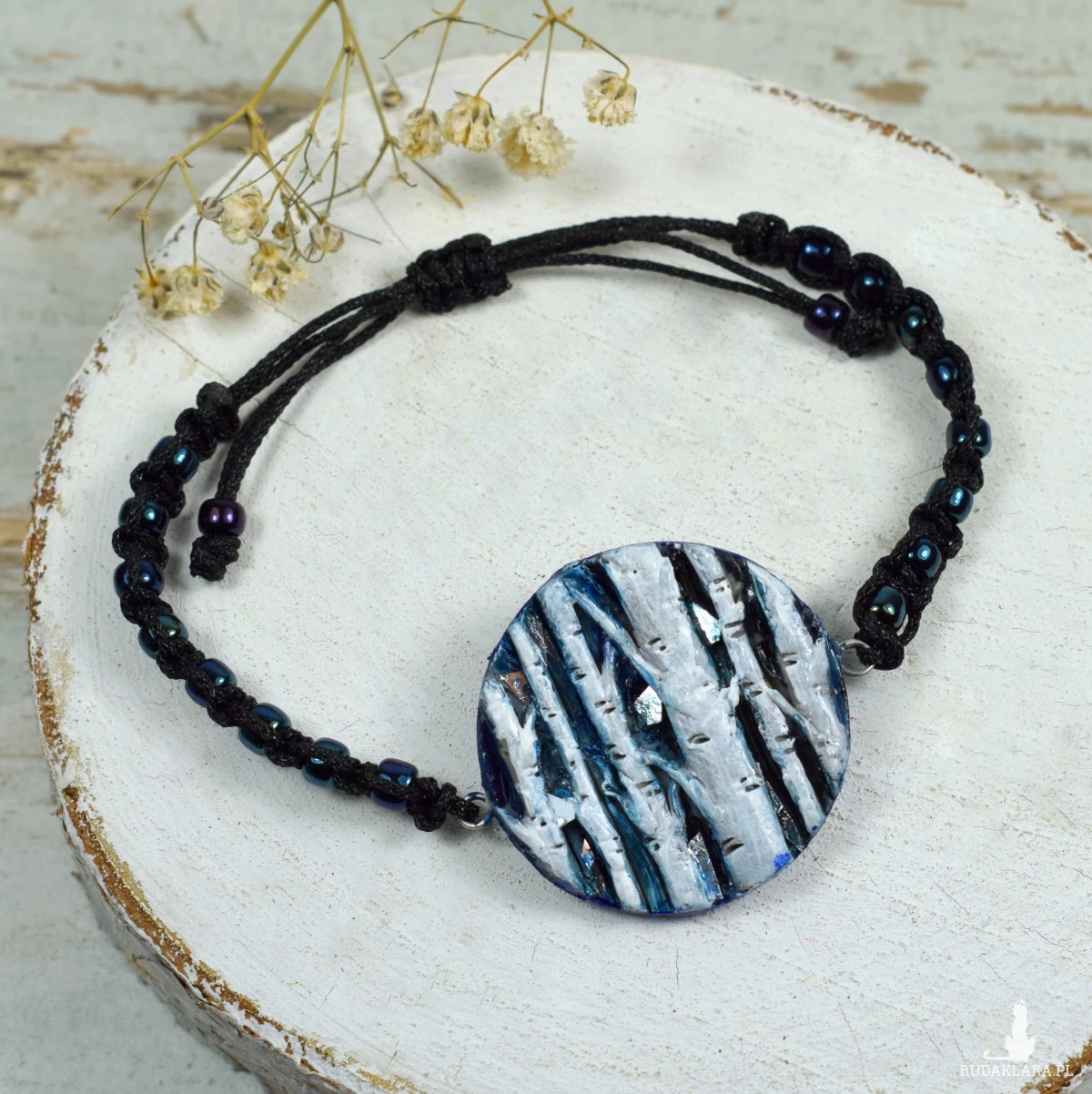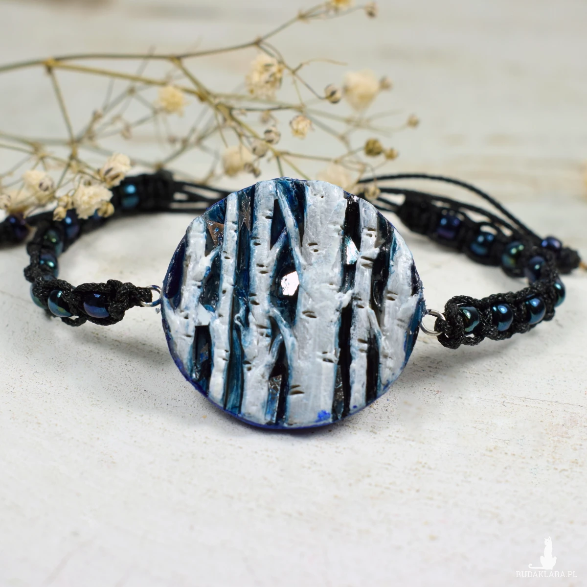 Niezwykła bransoletka "Szepty brzozy" w odcieniach granatu, bieli i czerni, z motywem przepięknych brzóz.