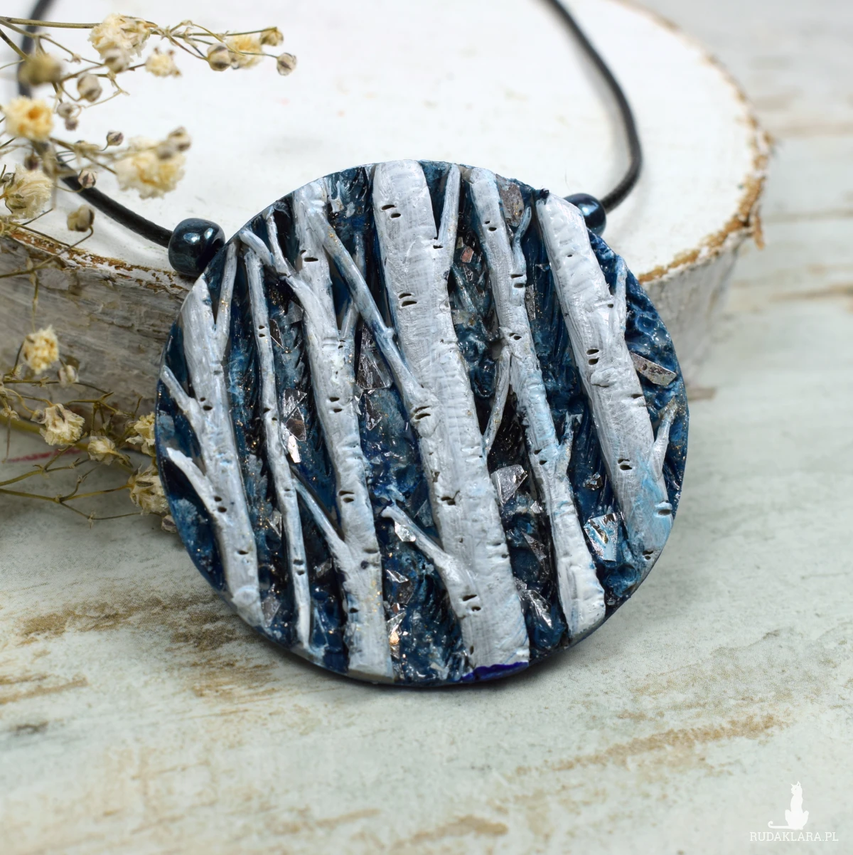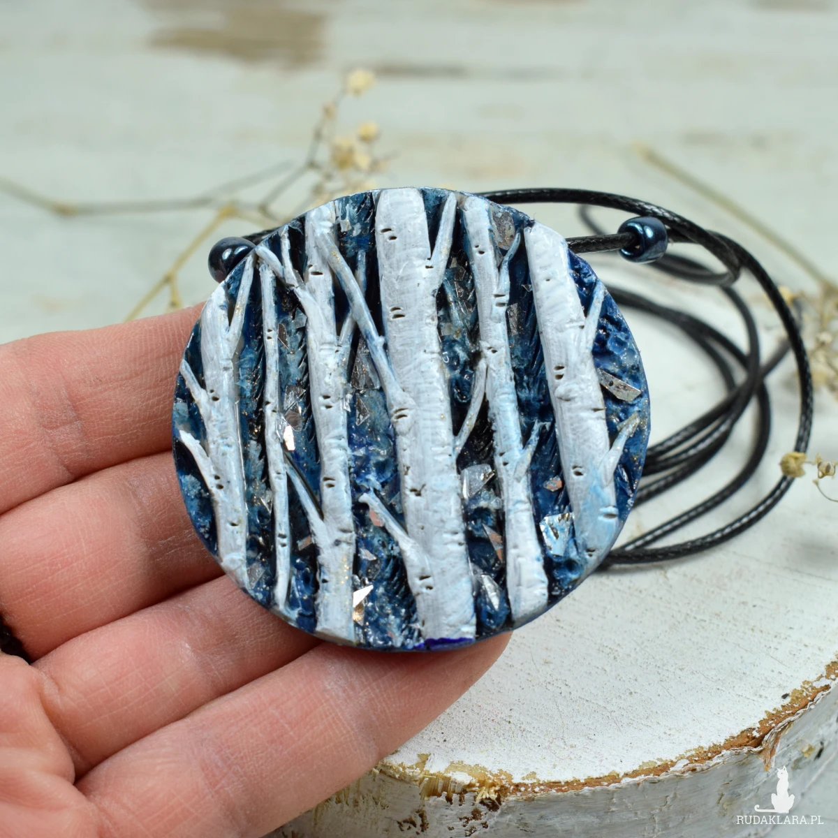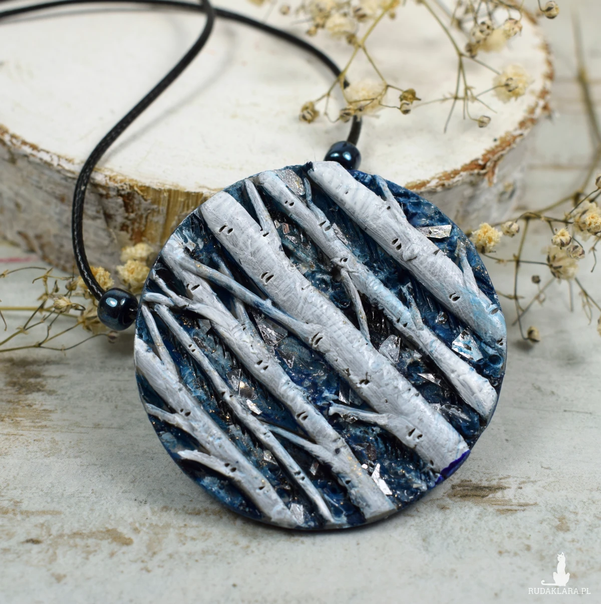 Unikatowy, duży wisior z motywem brzóz w odcieniach granatu, srebra i bieli.