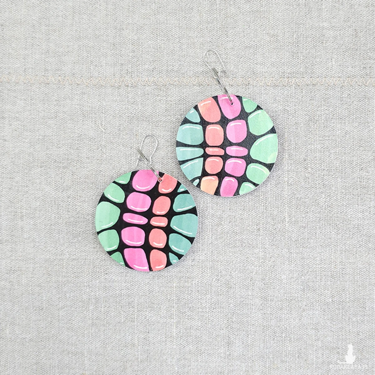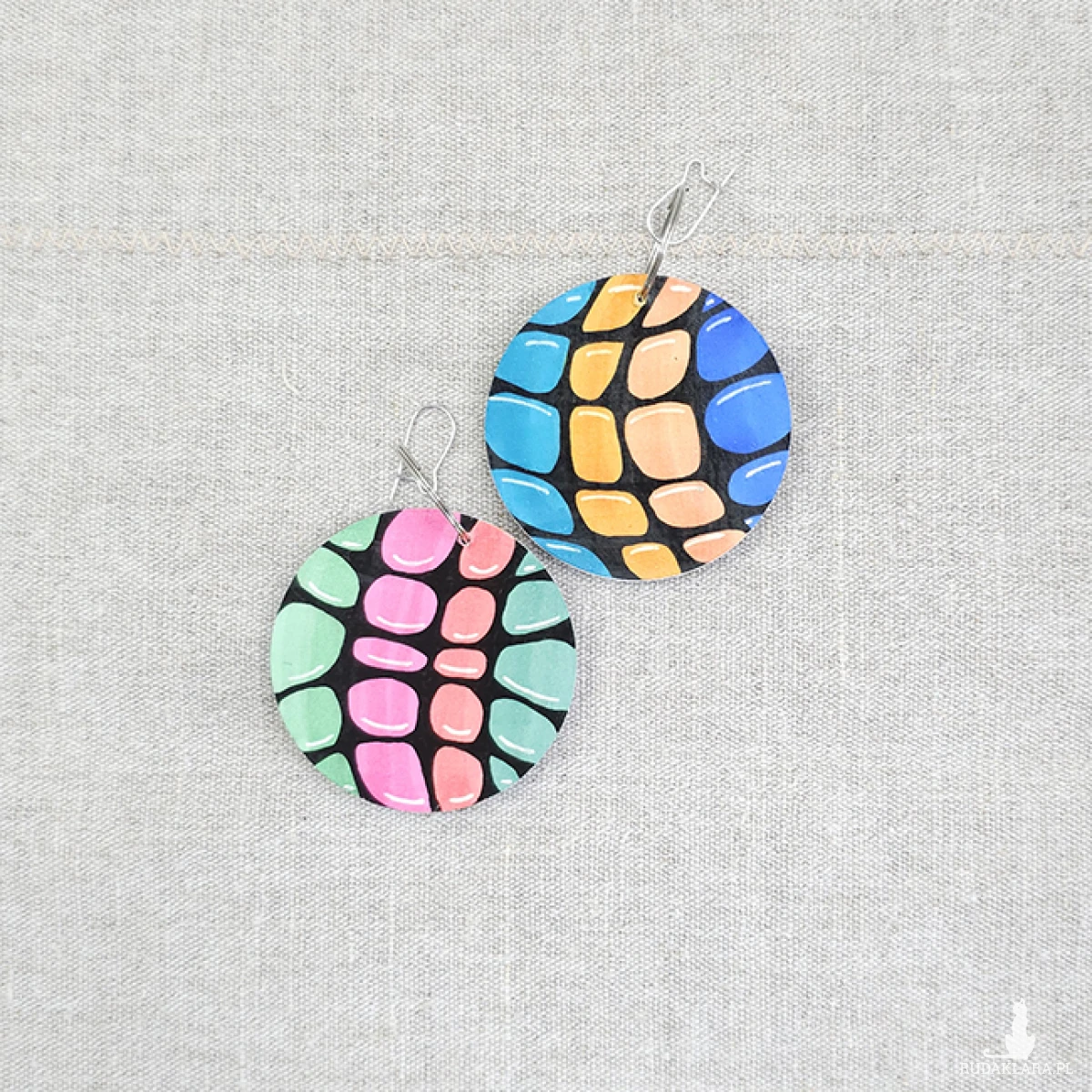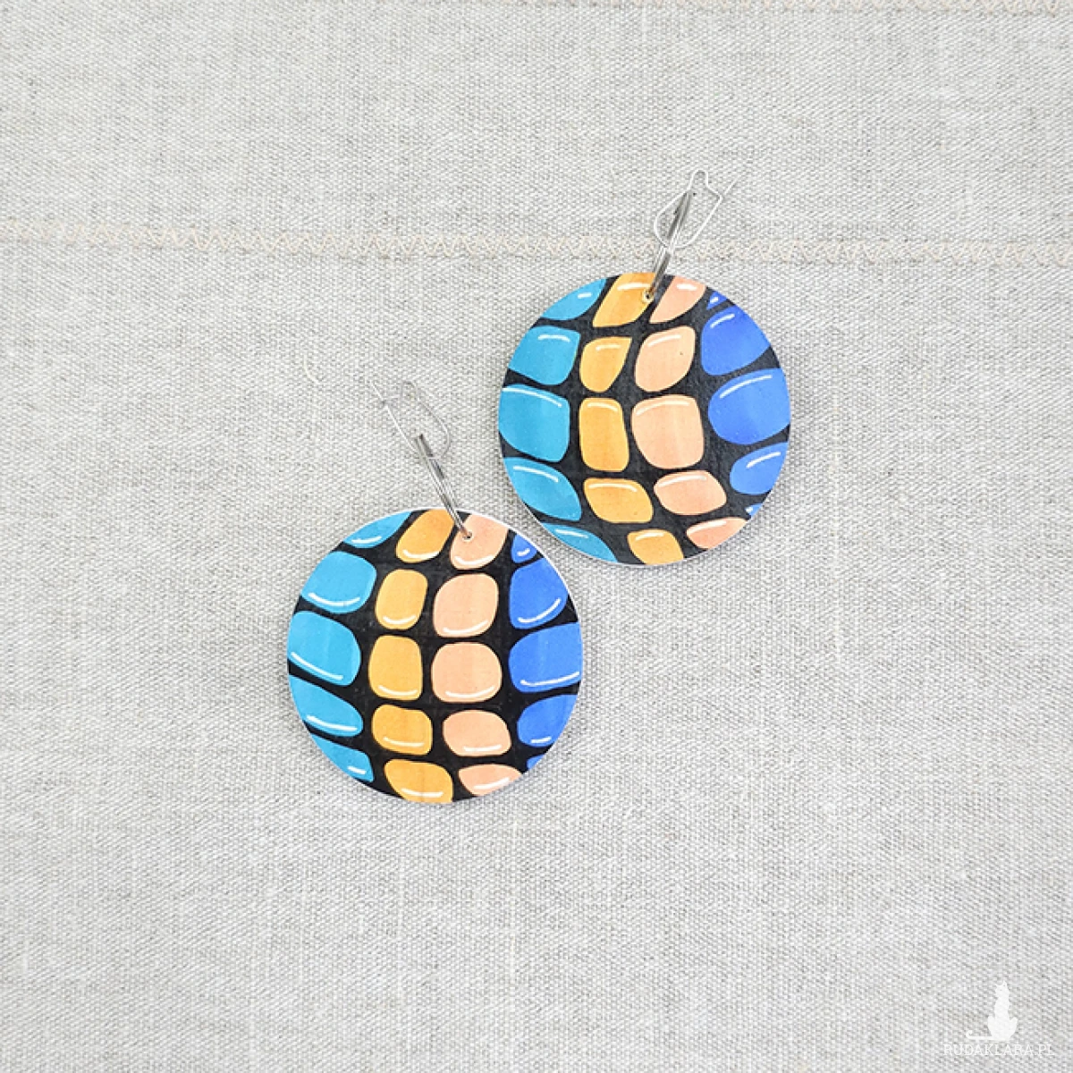 Ręcznie malowane (rysowane) kolczyki. Baza drewniana plus satynowy papier.