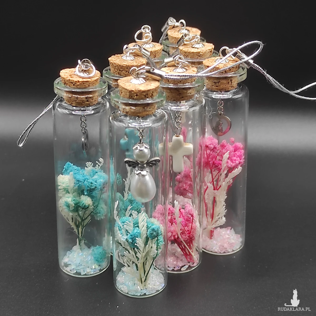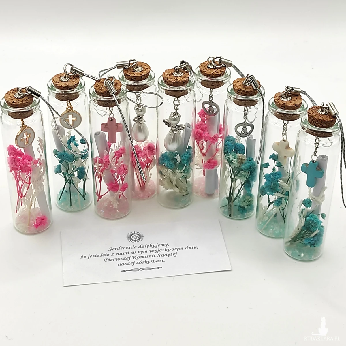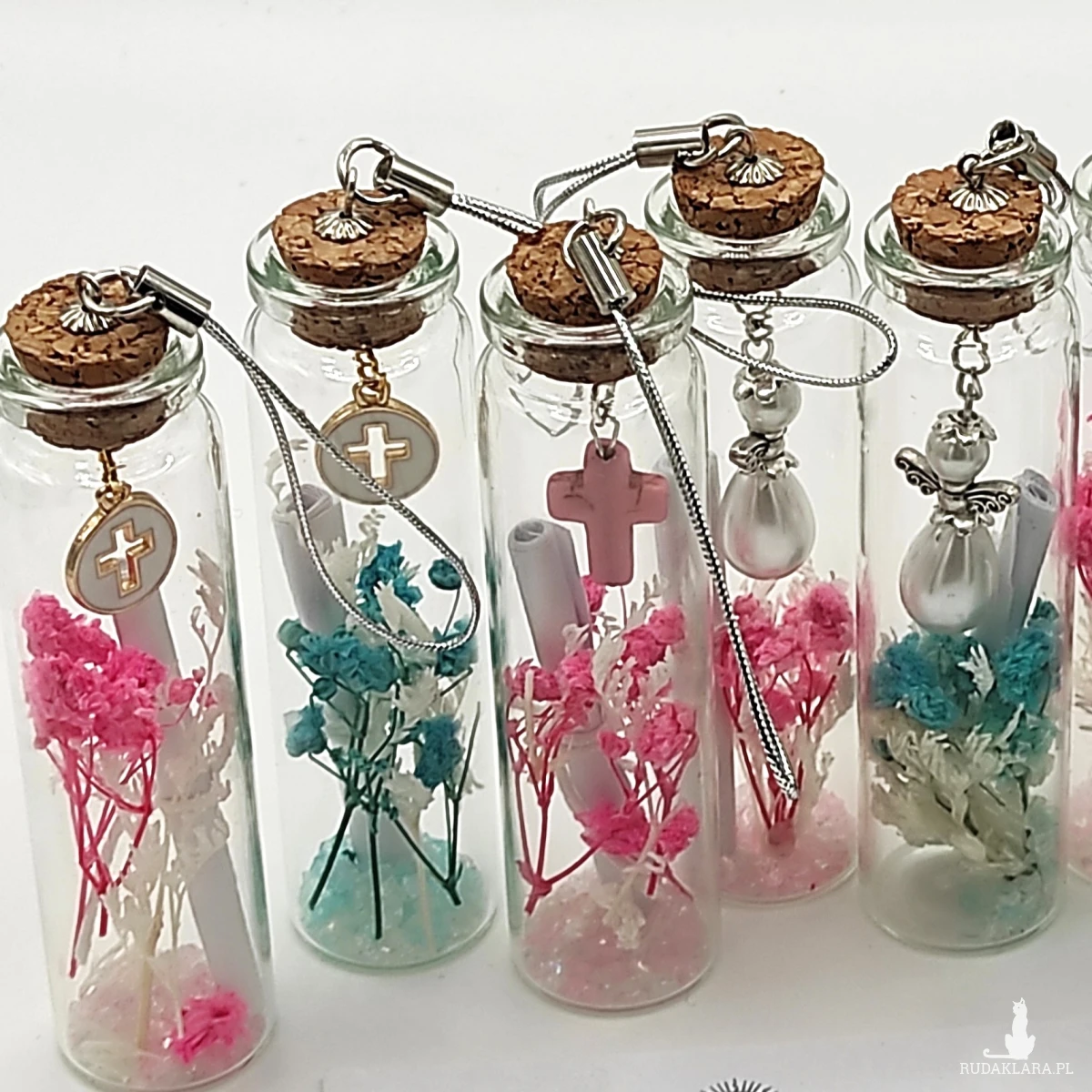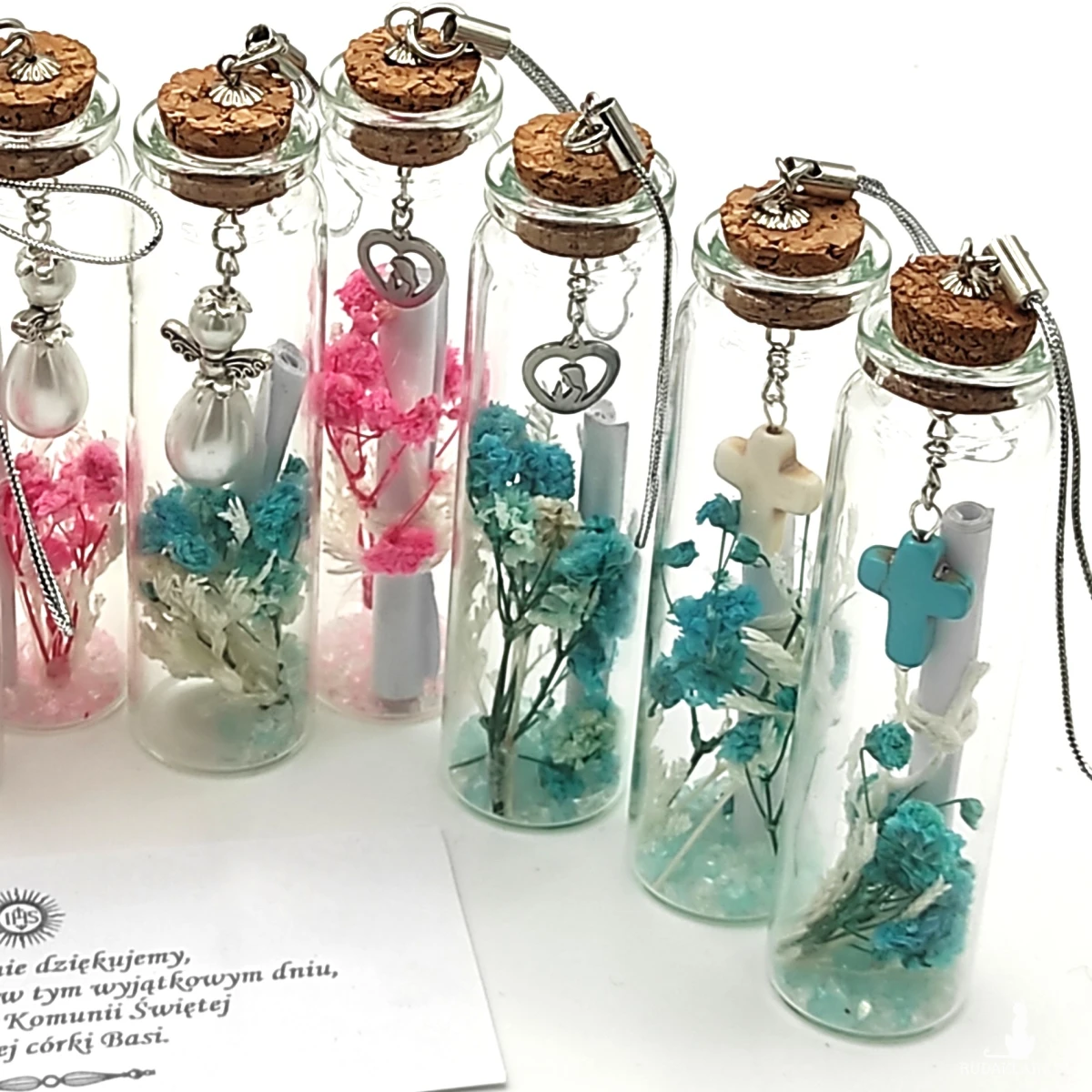 Buteleczka z korkiem 8 cm/2,2 cm. Do środka wrzucone szklane kryształki, zasuszone kwiatki , tekst podziękowania zwinięty w rulonik. Od środka do korka zaczepiona zawieszka krzyżyk, medalik aniołek, na zewnątrz przyczepiony sznureczek do zawieszenia. Po zakupie proszę podać w wiadomości e-mail tekst podziękowania i wystrój buteleczki kolor kwiatków i jaką zawieszkę wybraliście . Wysyłam maksymalnie do 5 dni roboczych.