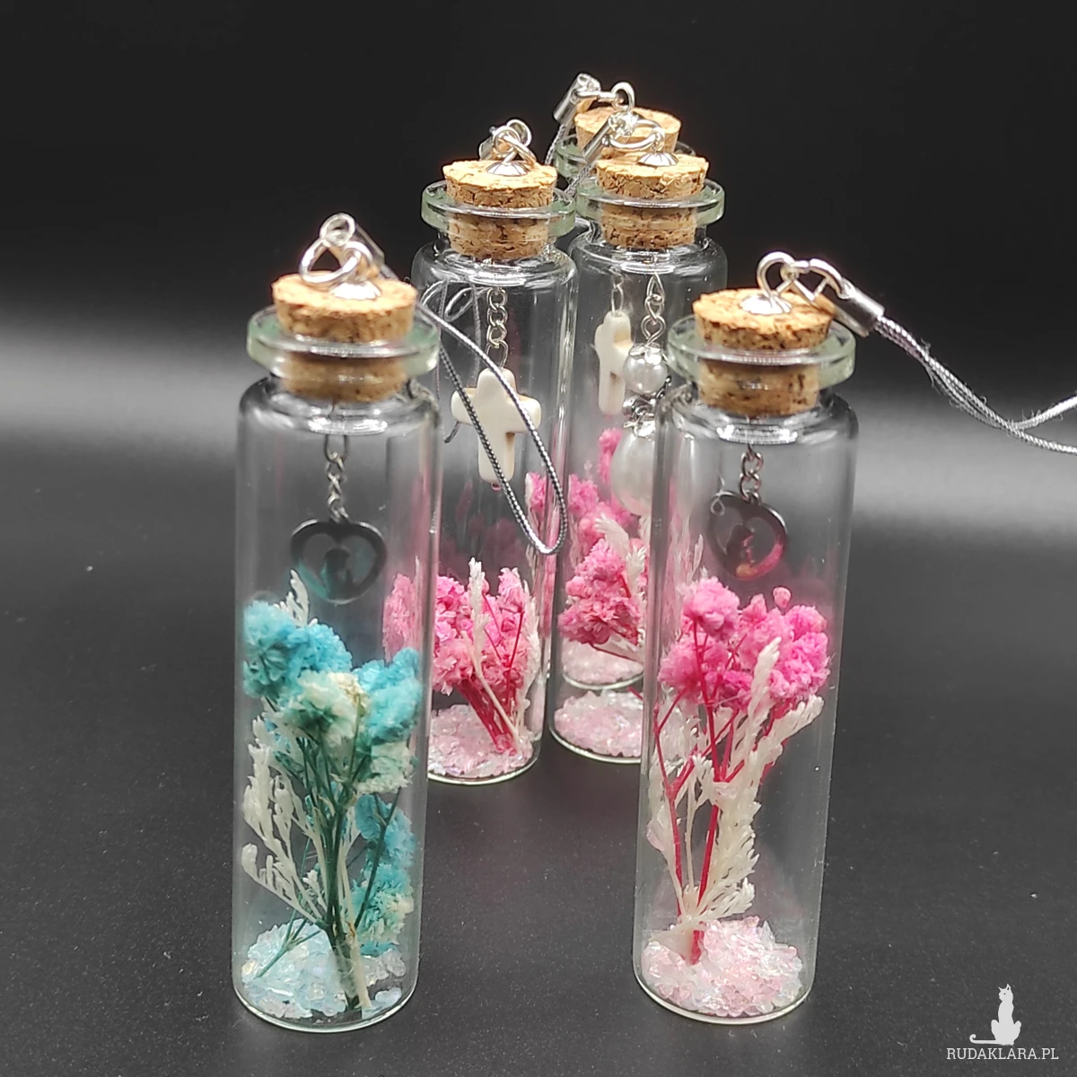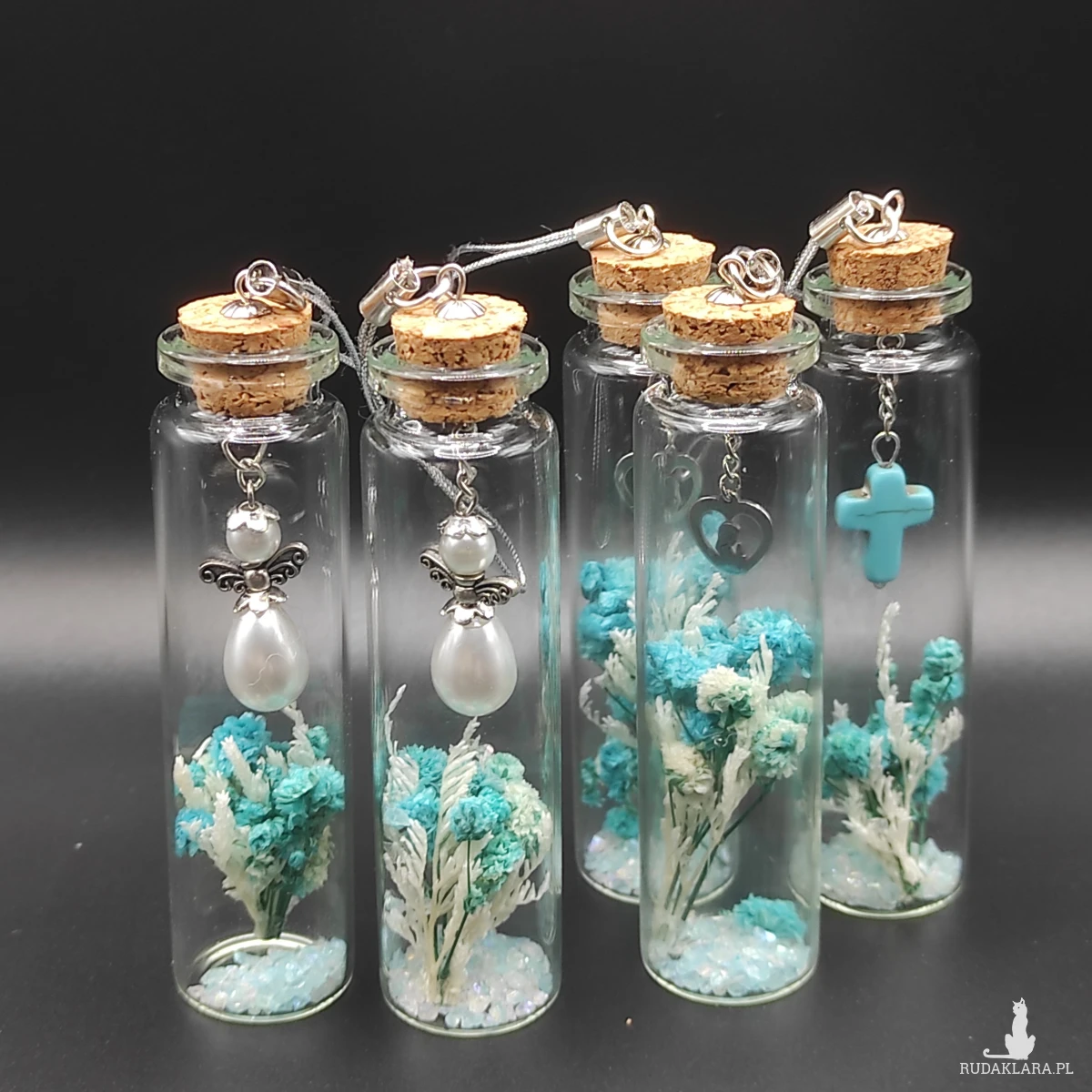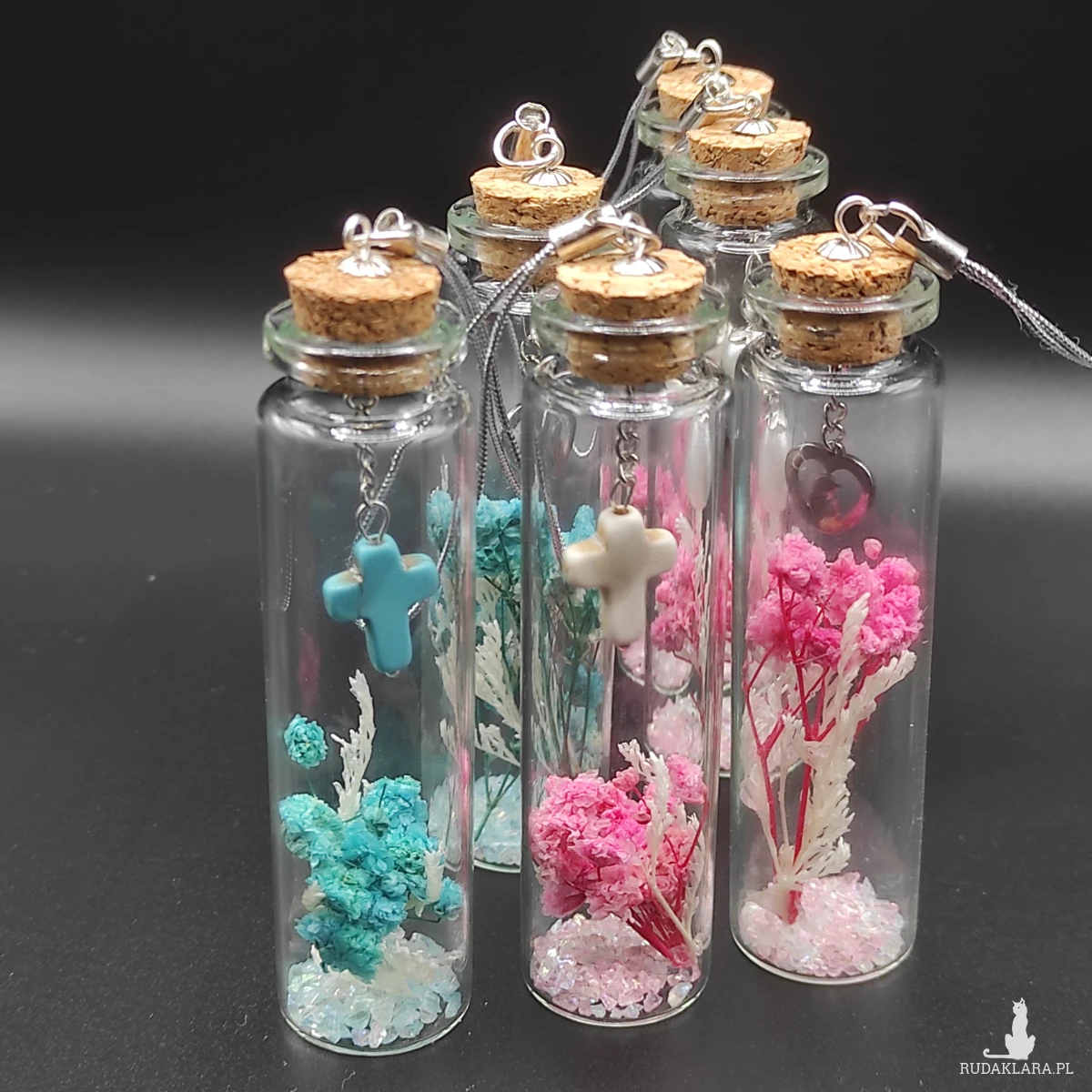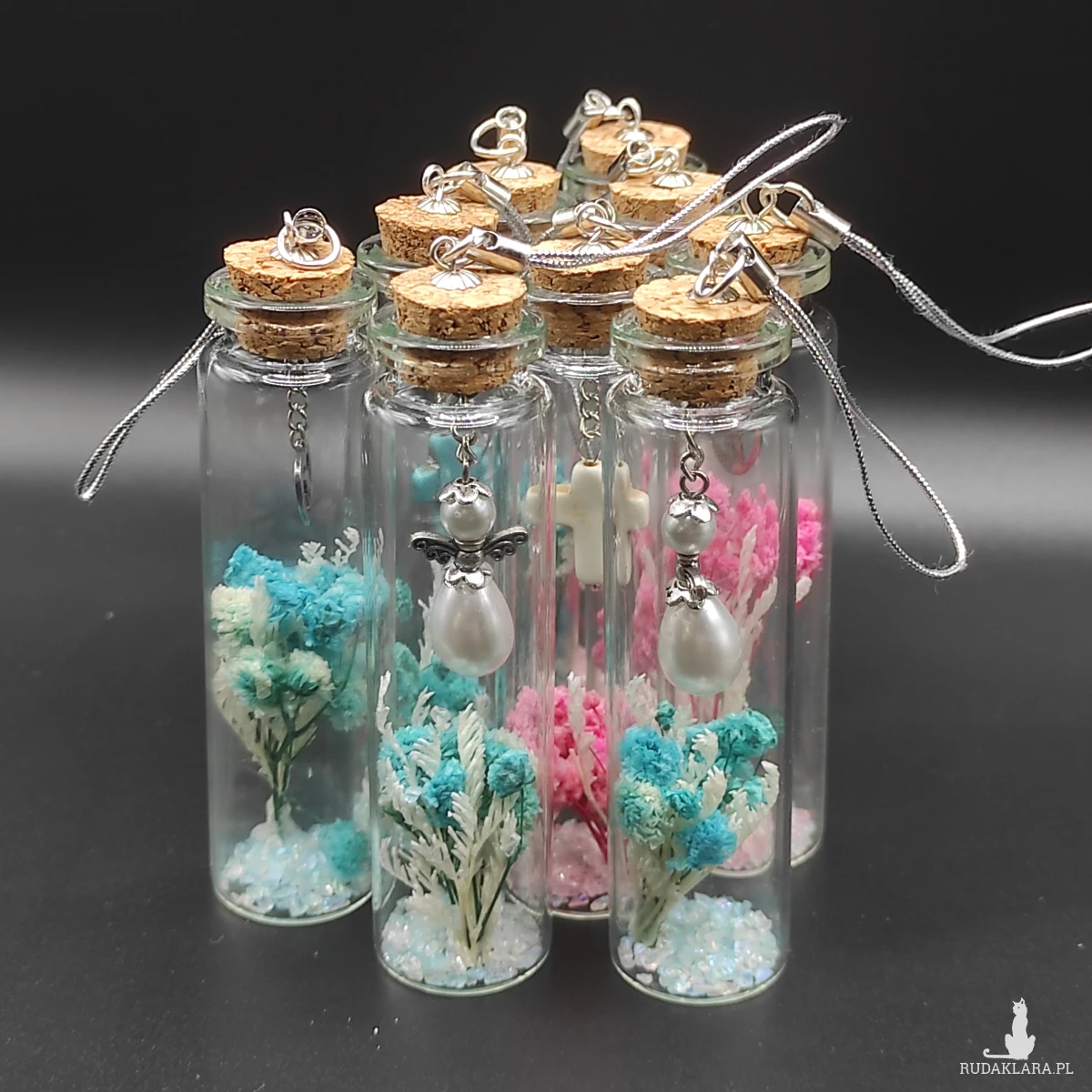 Buteleczka z korkiem 8 cm/2,2 cm. Do środka wrzucone szklane kryształki, zasuszone kwiatki , tekst podziękowania zwinięty w rulonik. Od środka do korka zaczepiona zawieszka krzyżyk, medalik aniołek, na zewnątrz przyczepiony sznureczek do zawieszenia. Po zakupie proszę podać w wiadomości e-mail tekst podziękowania i wystrój buteleczki kolor kwiatków i jaką zawieszkę wybraliście . Wysyłam maksymalnie do 5 dni roboczych.