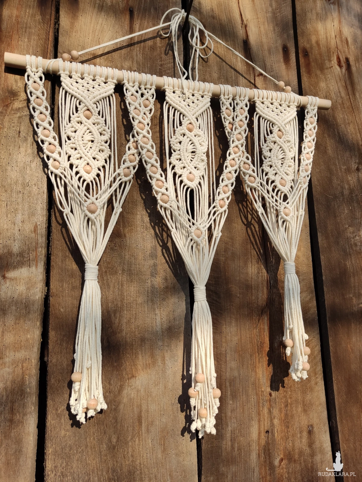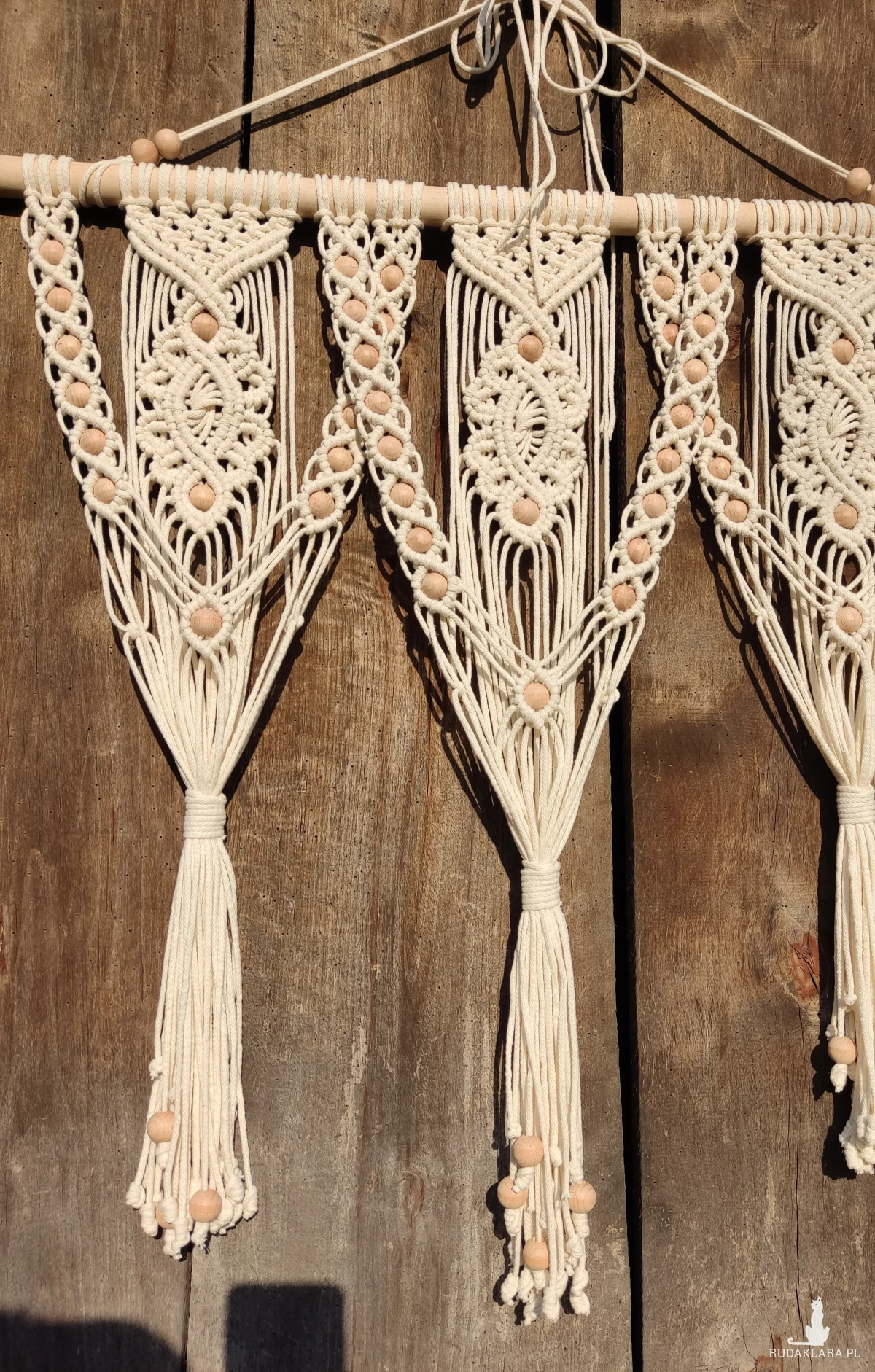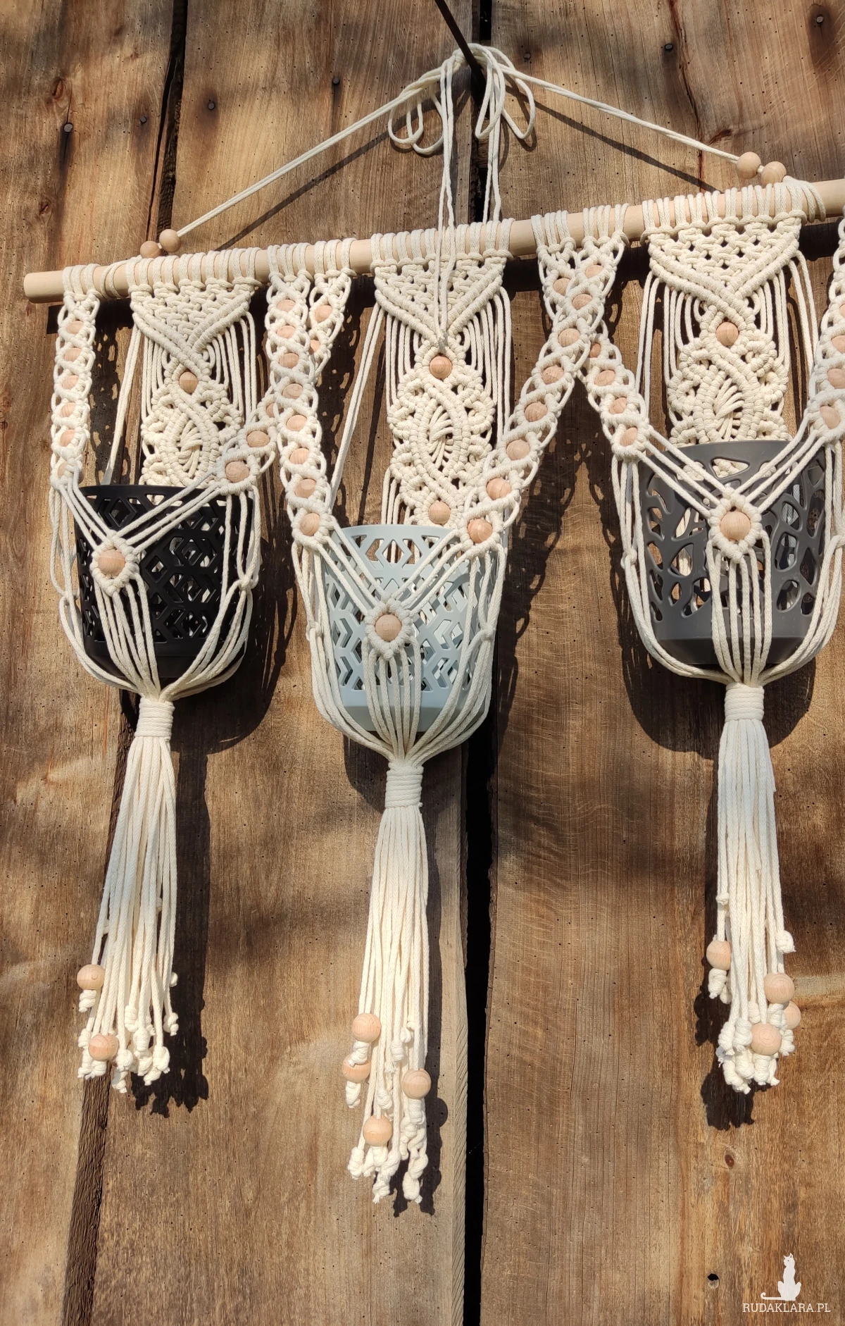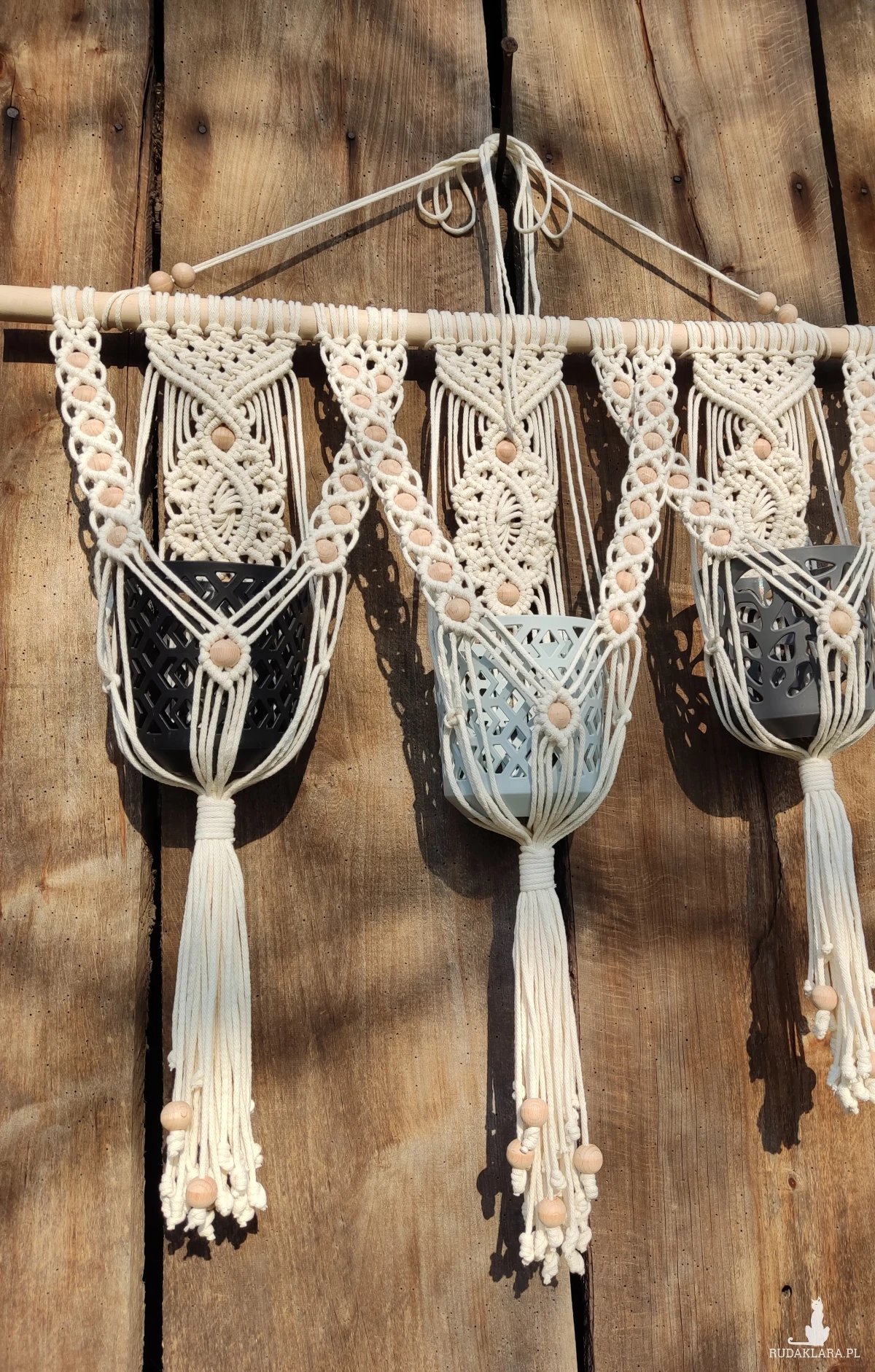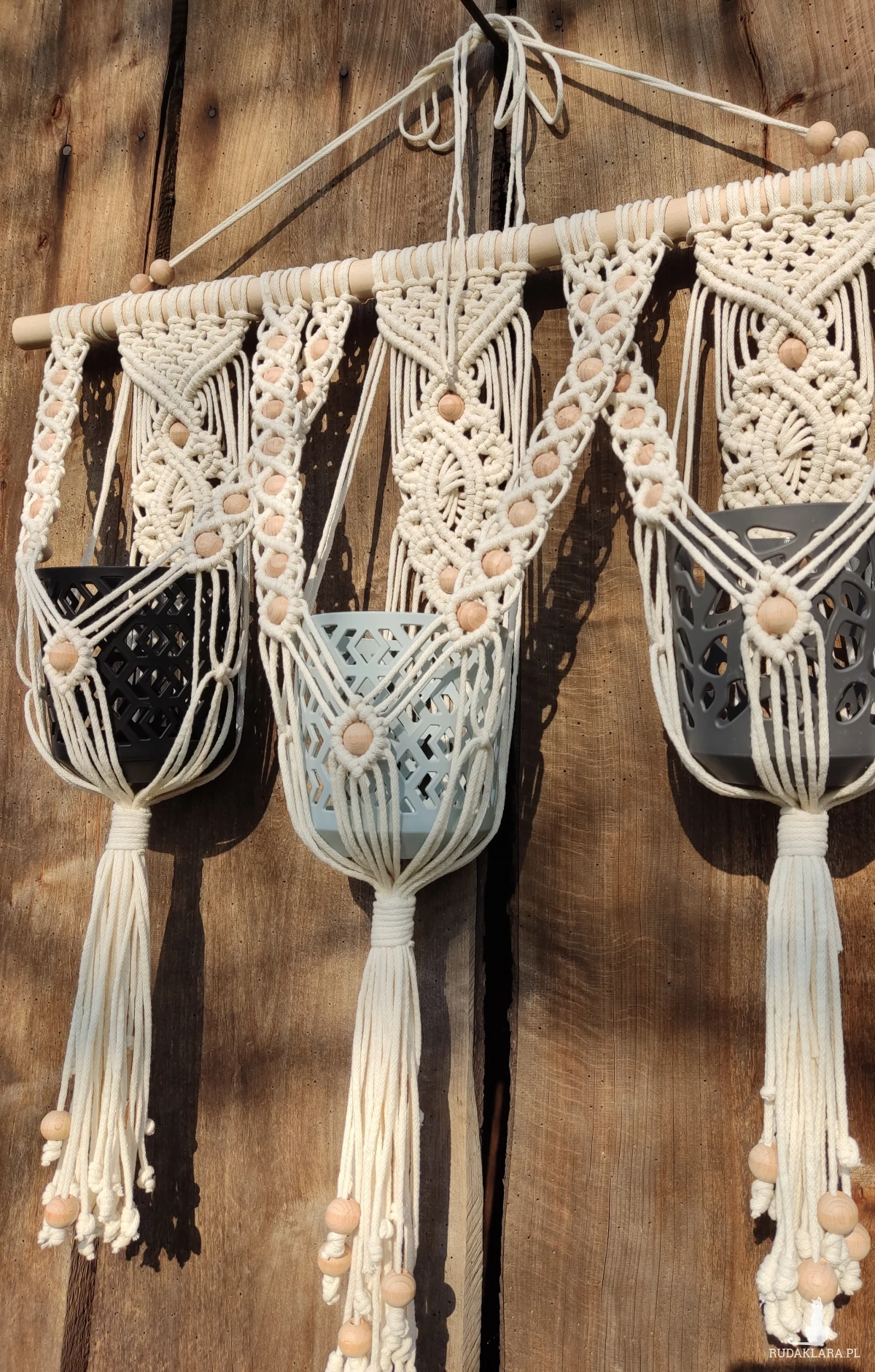 Sprzedam nowy ręcznie wykonany kwietnik na trzy donice w stylu Boho. Kwietnik wykonany ze sznurka 3 mm bobbiny w kolorze beżowym z dodatkiem drewnianych koralików. Długość kija 80 cm, wysokość kwietnika (na środku ) 70 cm.