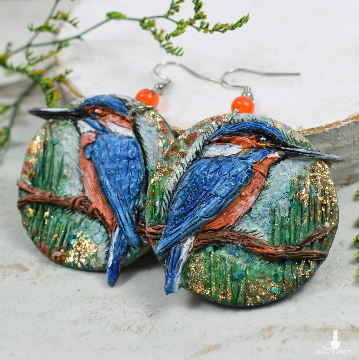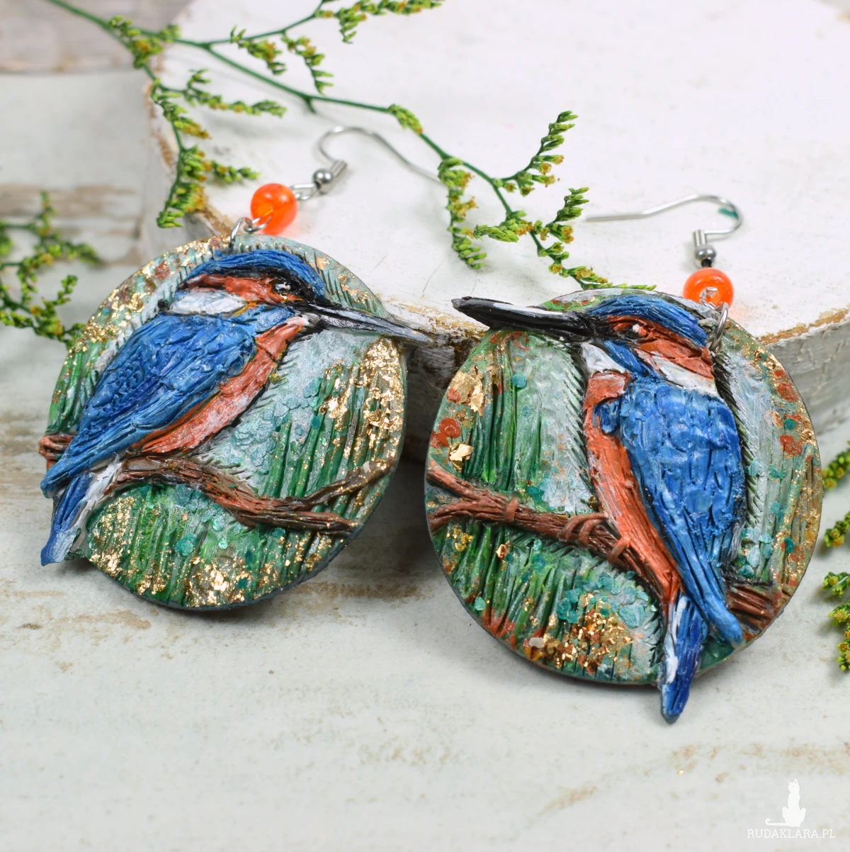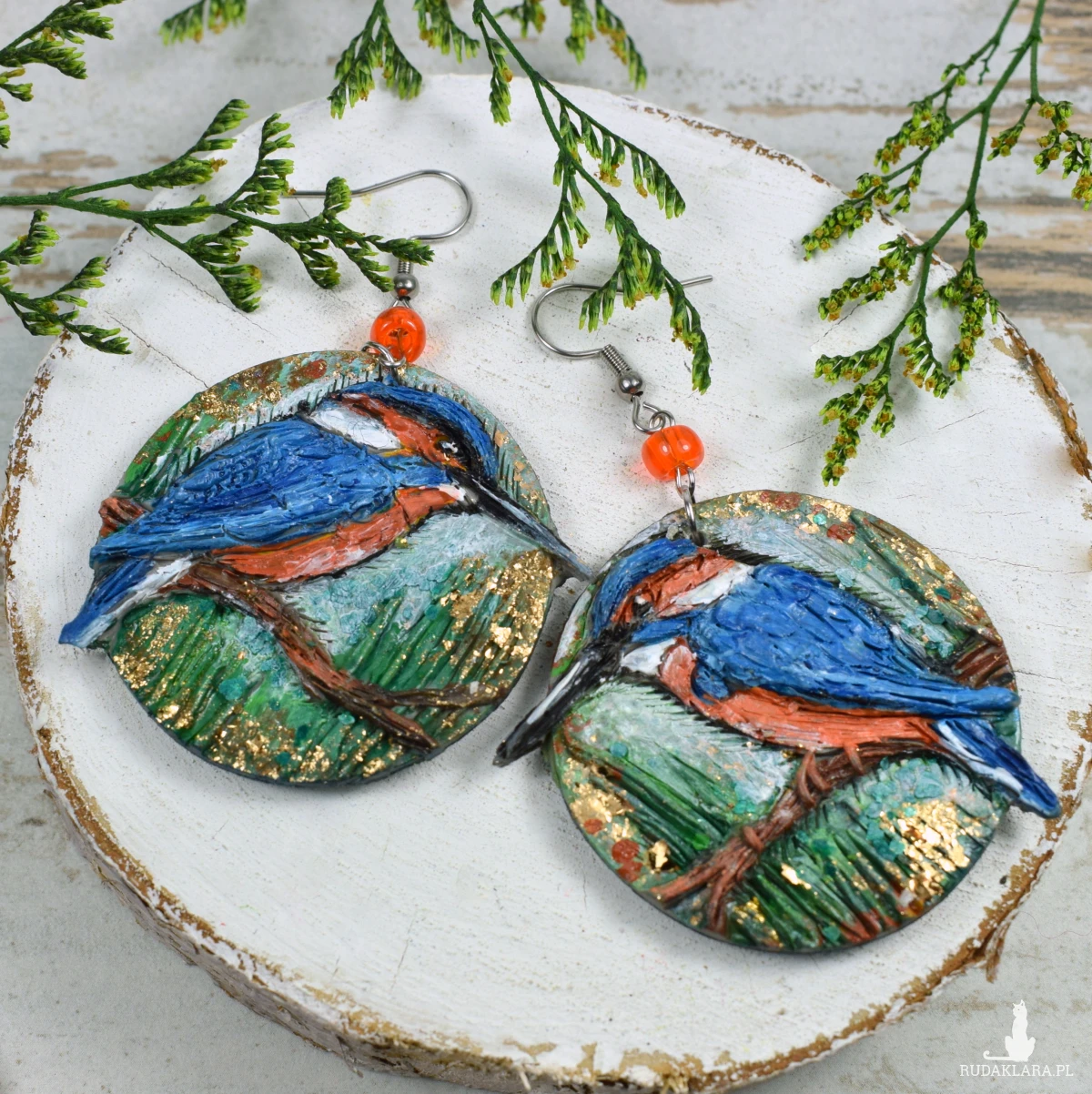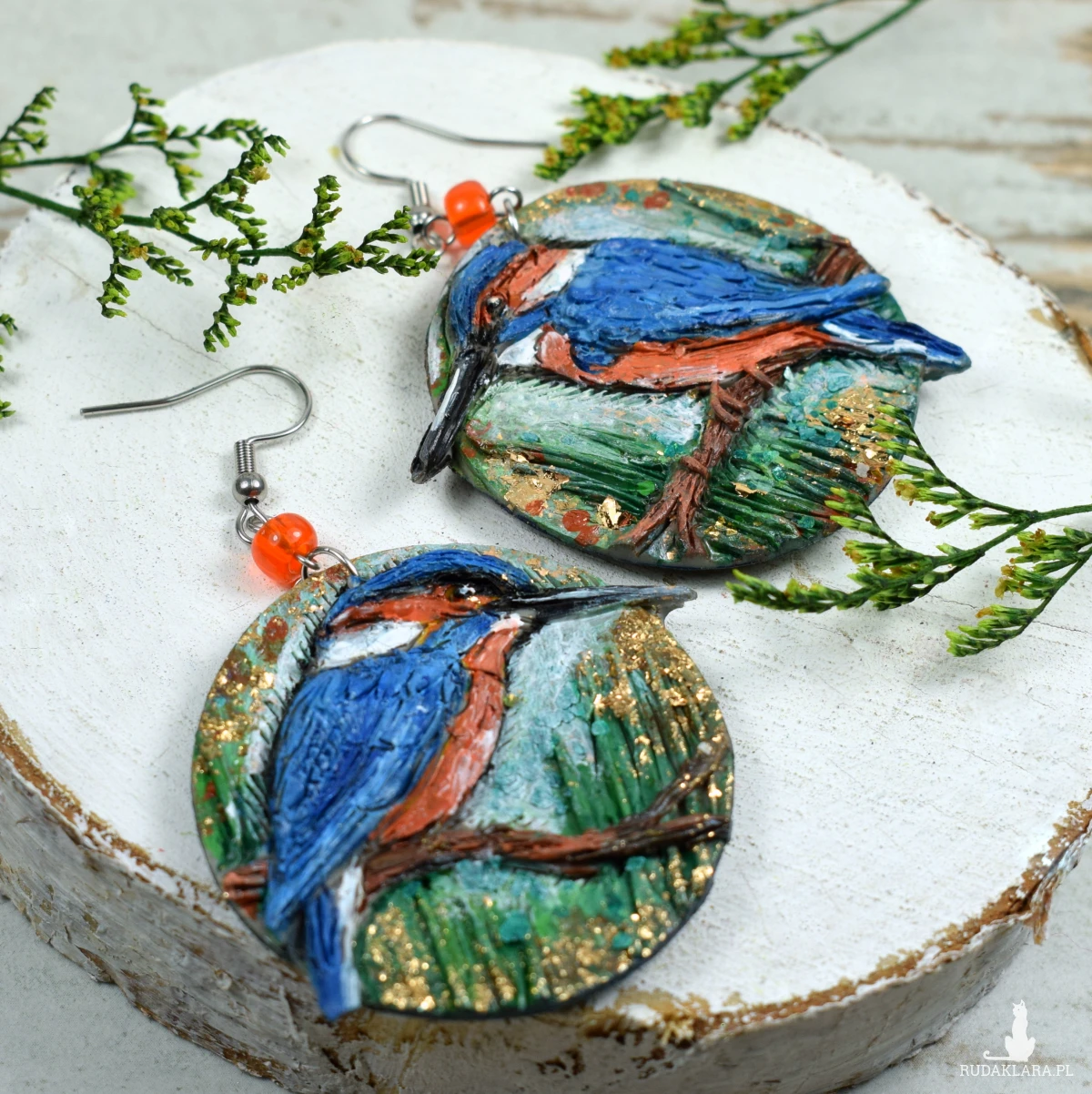 Unikatowe, wykonane ręcznie kolczyki z motywem zimorodka, w odcieniach niebieskiego, brązu, zieleni.