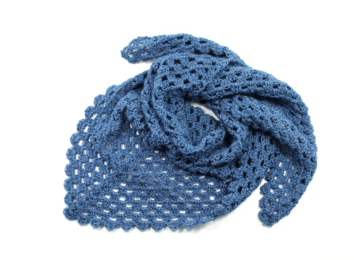 Chusta - apaszka zrobiona na szydełku z cieniutkiej akrylowej włóczki w kolorze jeansowym.