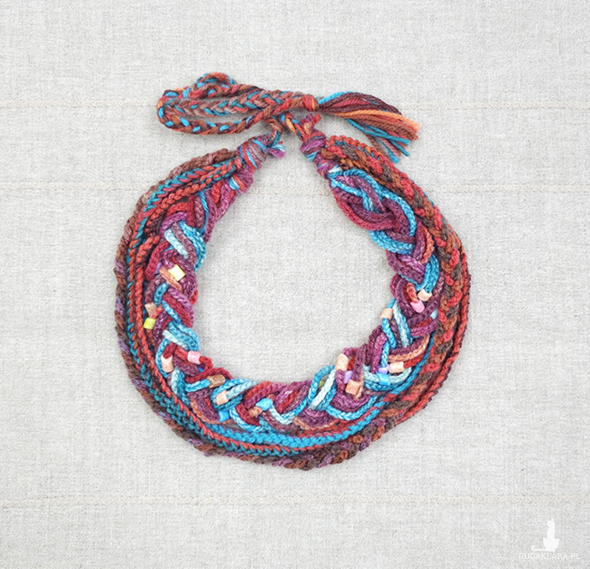 Naszyjnik wykonany z 16 szt. ręcznie plecionych sznurków.