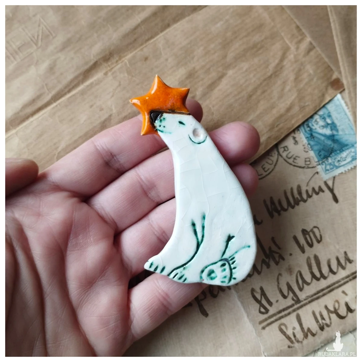 Broszka miś polarny wykonana z gliny szamotowej, wypalona na biskwit, a następnie szkliwiona w temperaturze ok 1260 stopni C. O wymiarach ok; 4 cm x 8 cm. Serdecznie polecam wszystkim Paniom poszukującym nietuzinkowej biżuterii.