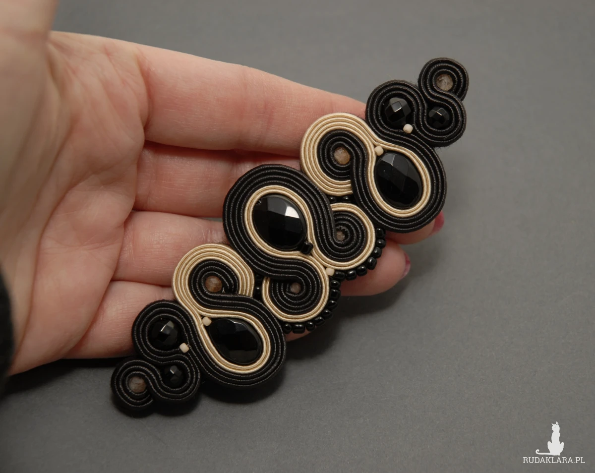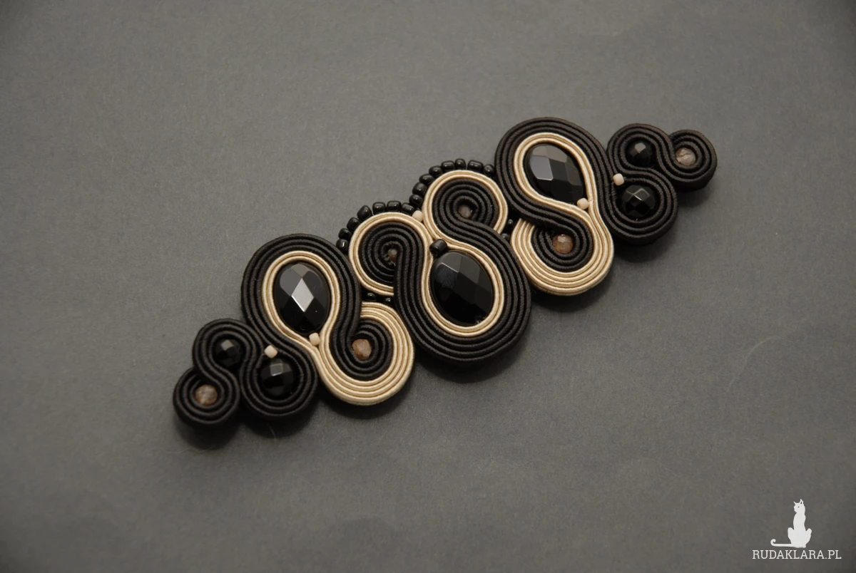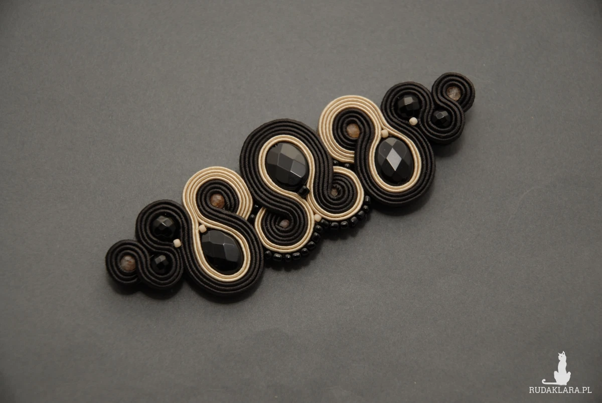 oferuję broszkę zrobioną techniką sutasz, ozdobioną dużymi, fasetowanymi onyksami, kamieniami słonecznymi i koralikami