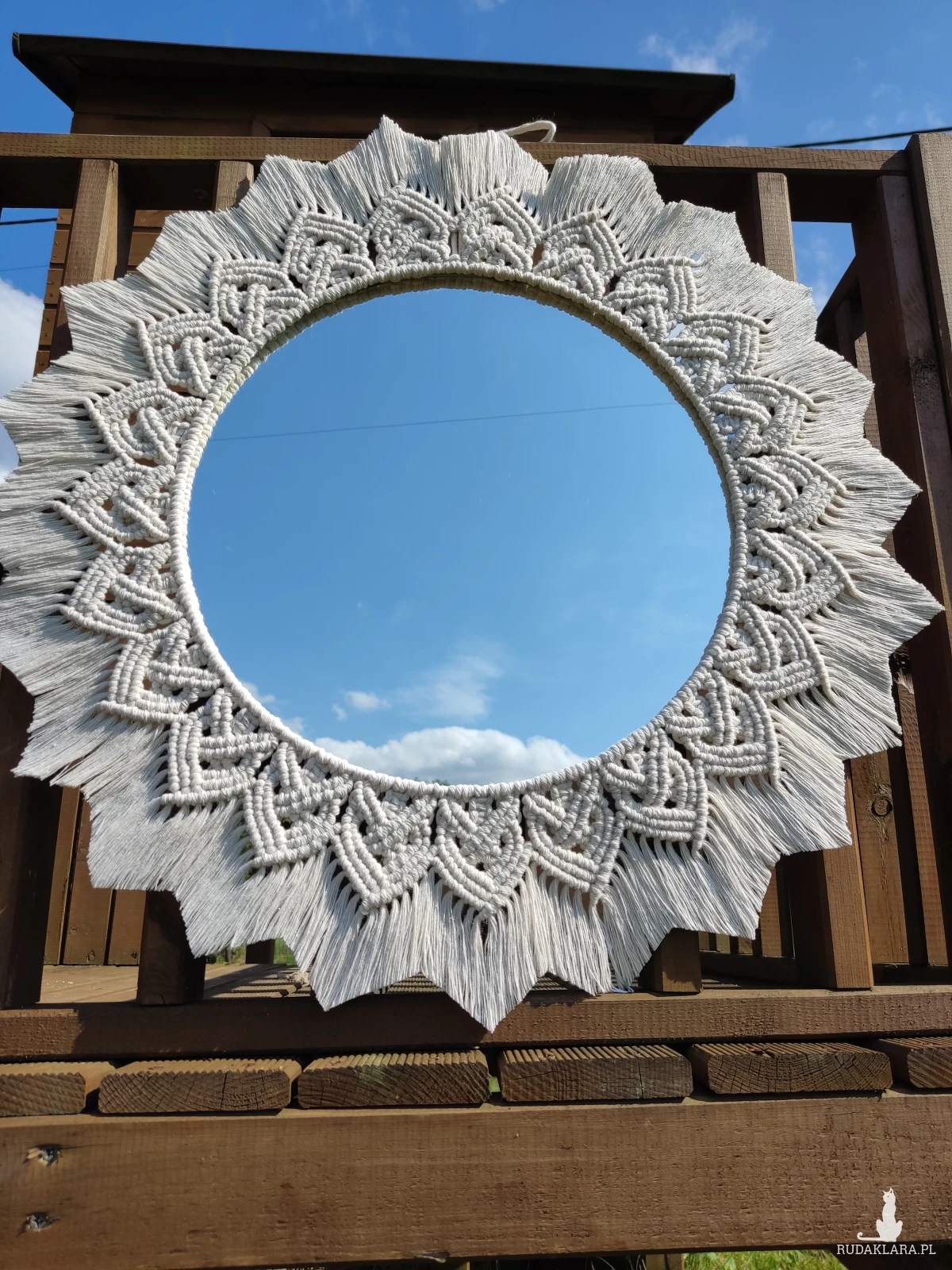 Sprzedam nowe ręcznie wykonane makramowe lustro w stylu Boho. Średnica całości wynosi 55 cm natomiast średnica samego lustra wynosi 30 cm, obrzeża mandali zostały usztywnione.