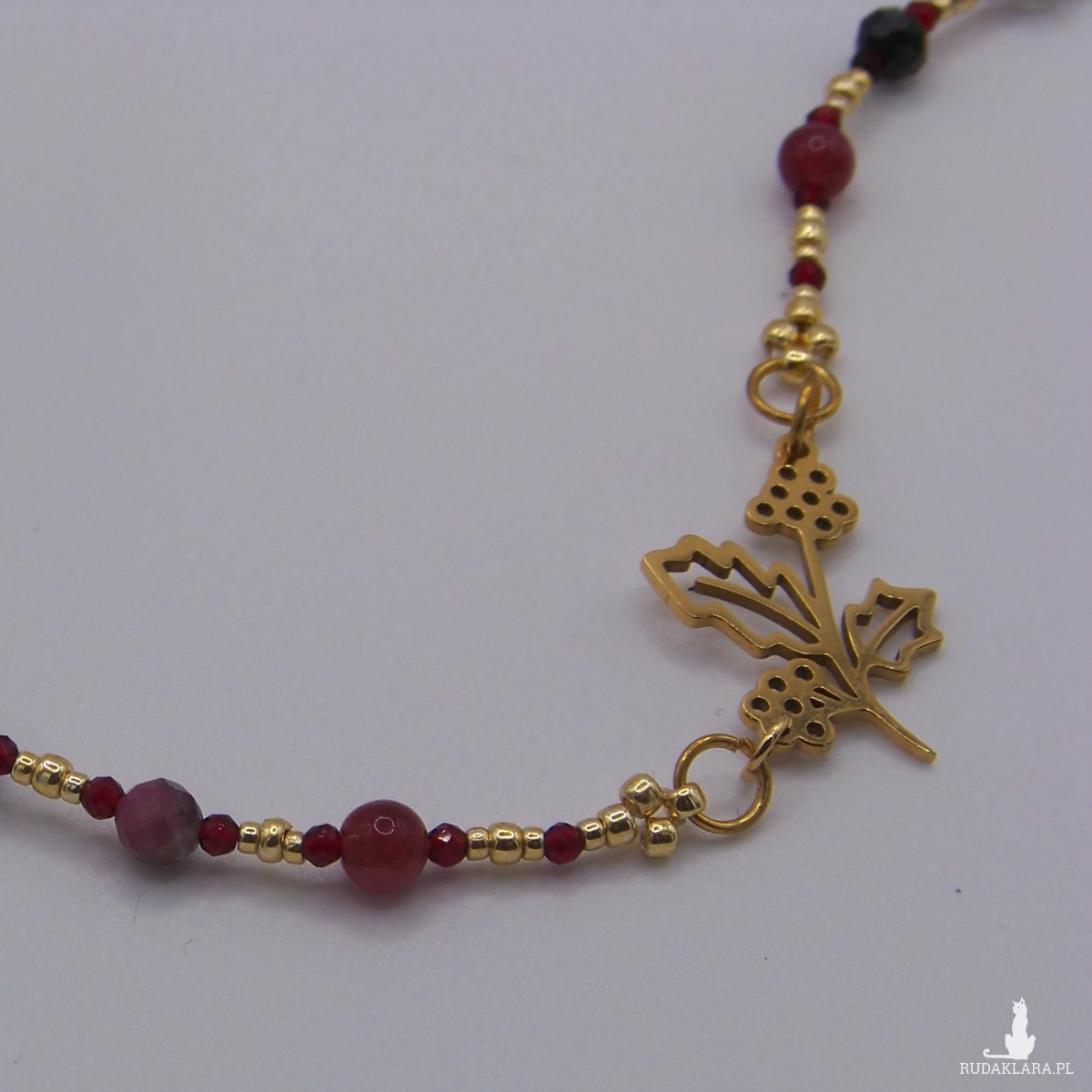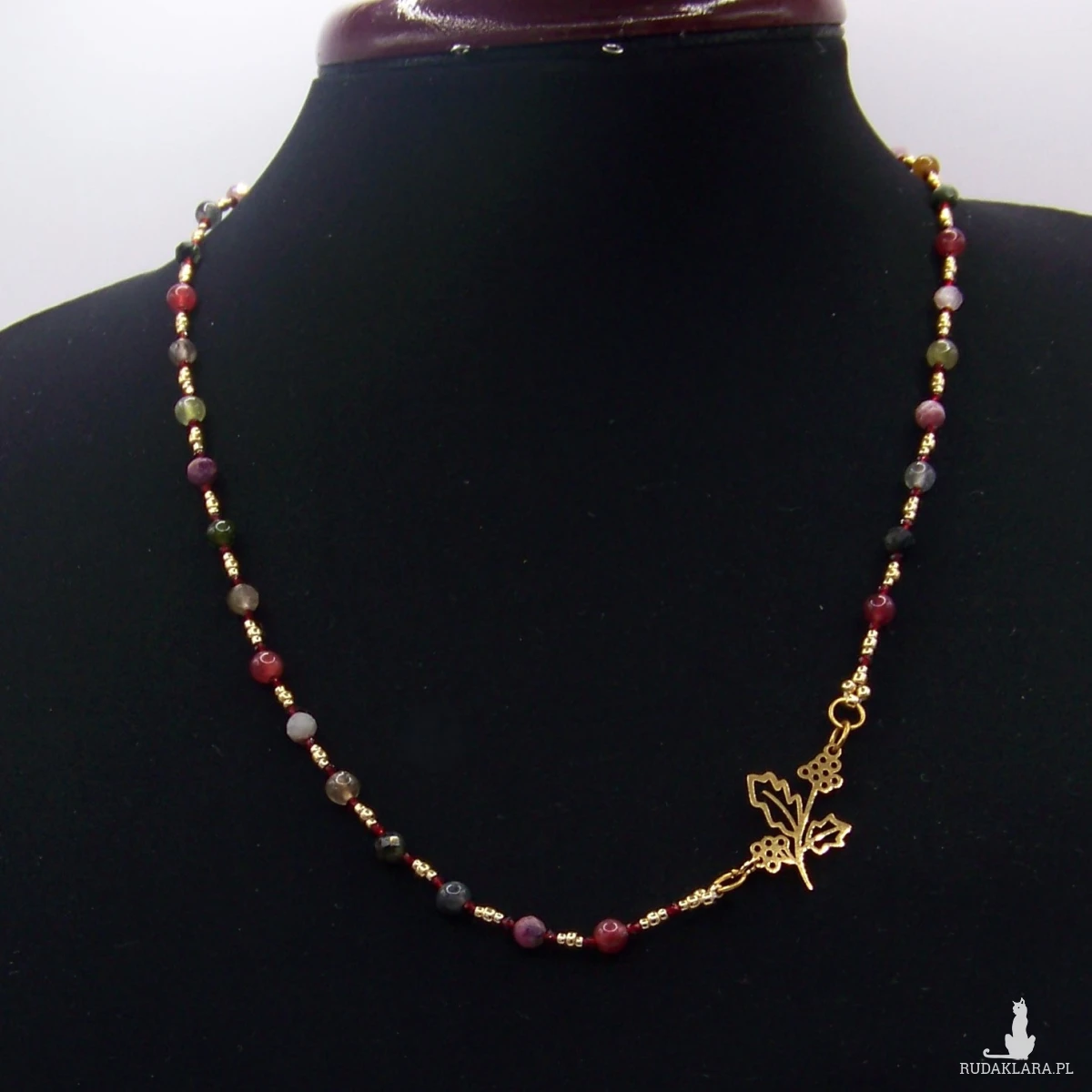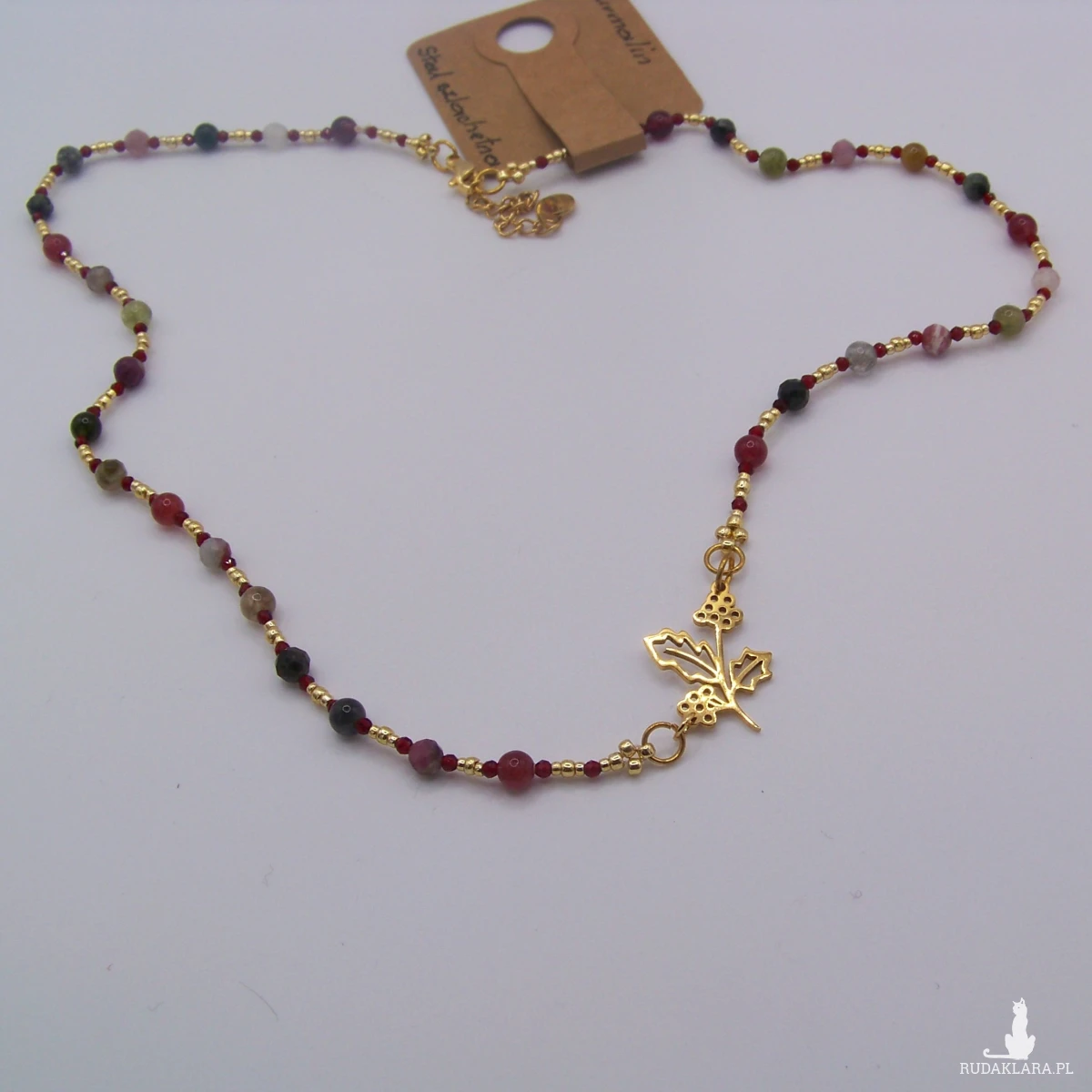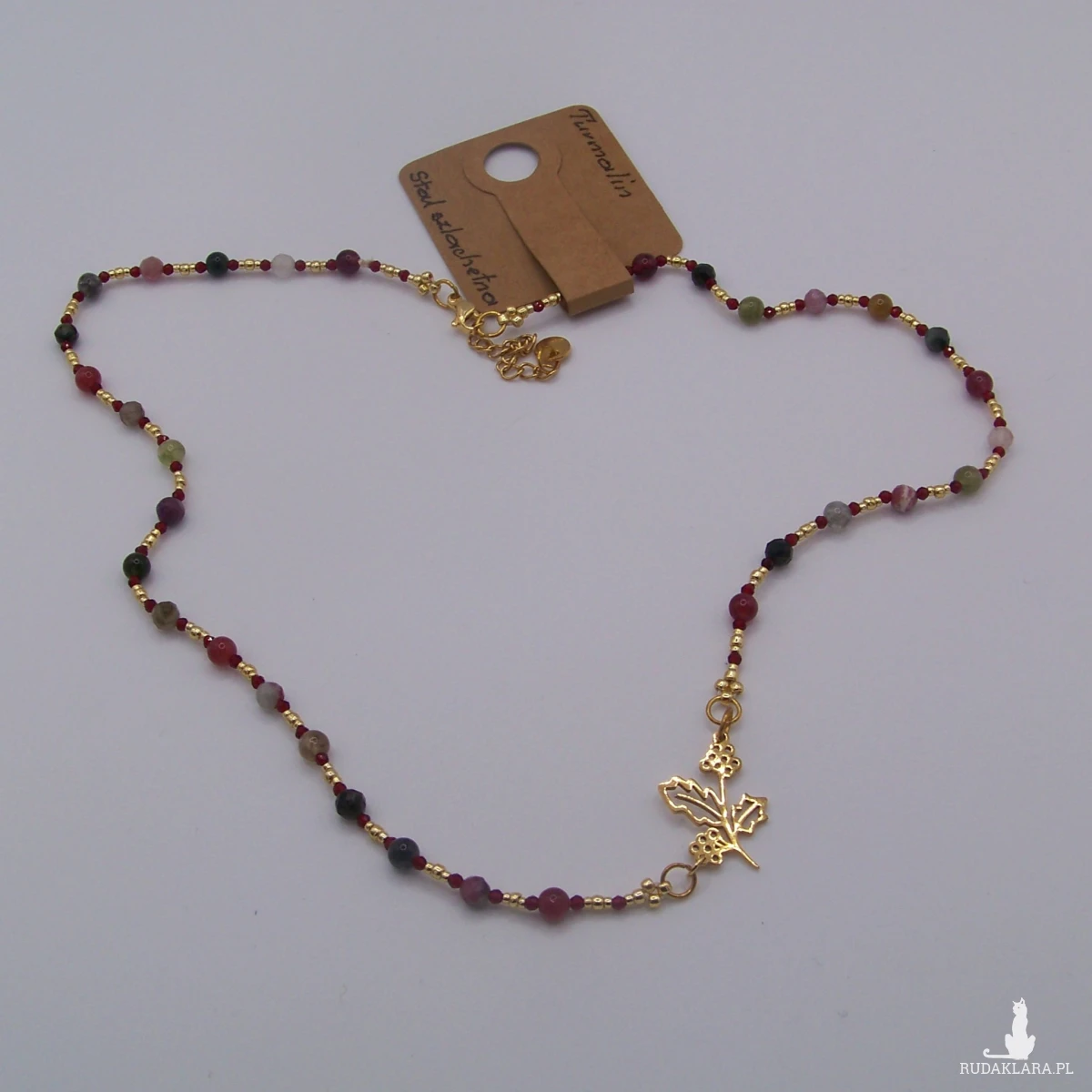 Delikatny naszyjnik zrobiłam z kamieni naturalnych na przemian : kolorowy Turmalin koraliki 4mm - koraliki kryształek szklany 2mm + złote koralik toho 2mm -, w takiej kolejności na całej długości. Wszystkie elementy wykończeniowe ze stali chirurgicznej w kolorze złotym: ozdobny łącznik, karabińczyk, przedłużka, ogniwka . Długość 46 cm + łańcuszek przedłużka 5 cm.
