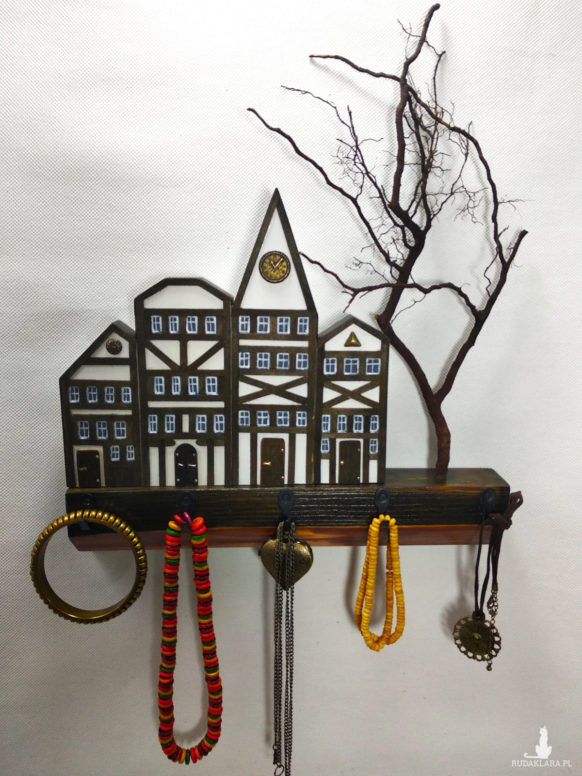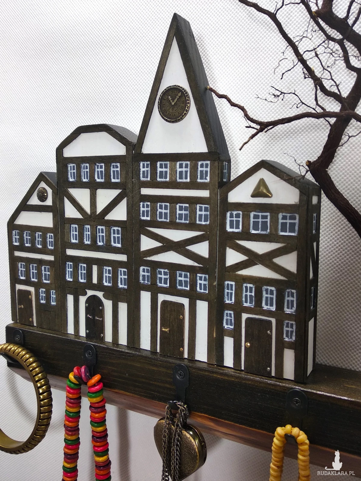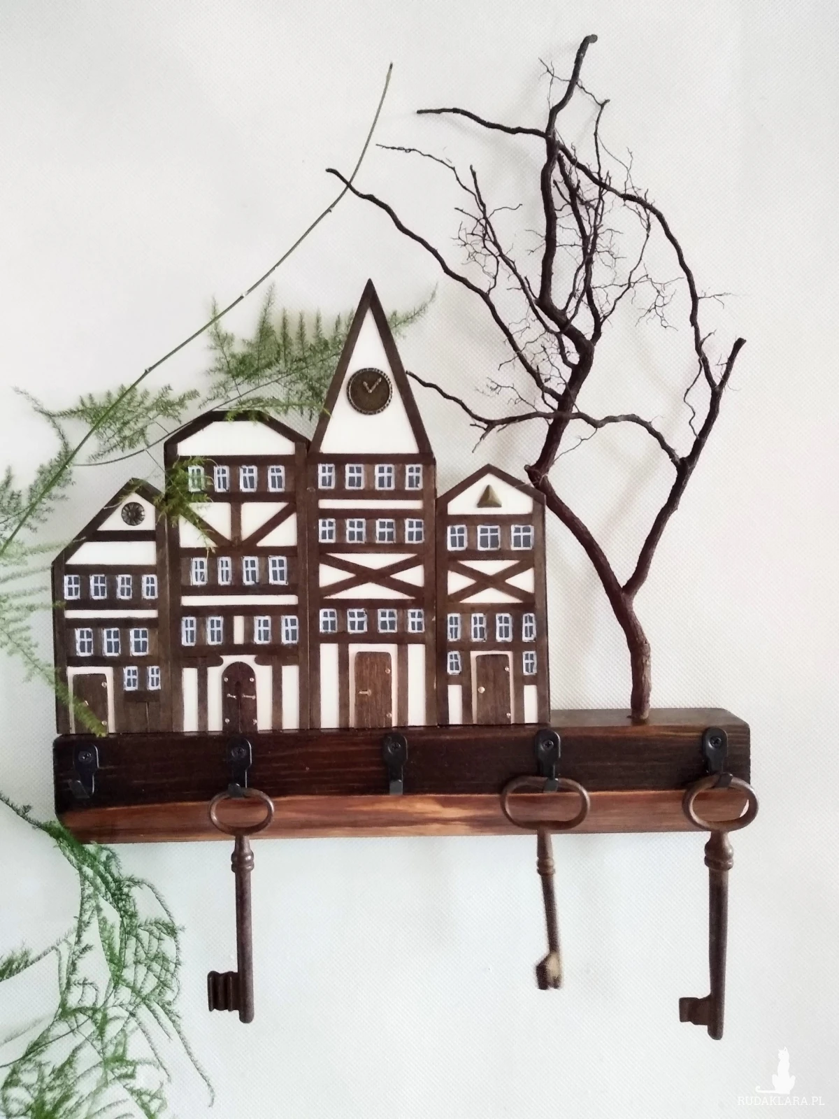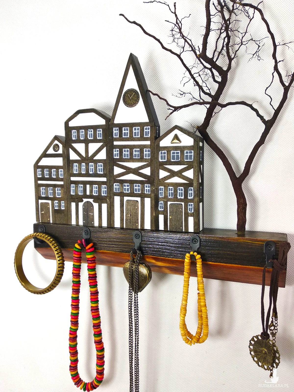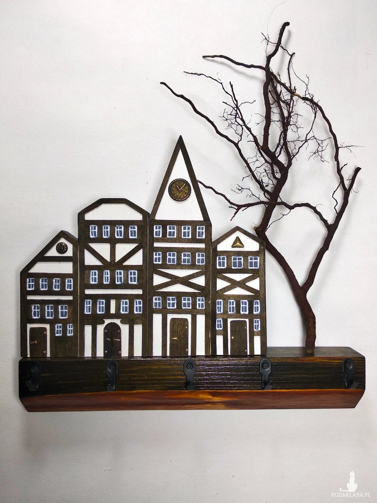 Klasyka, solidność i charakter – ten ręcznie wykonany wieszak to połączenie rzemieślniczej precyzji i ponadczasowego designu. Inspirowany architekturą szachulcową, przywodzi na myśl stare europejskie miasta, gdzie kunszt budowniczych i trwałość materiałów były kluczowe. Brązowe belkowania na jasnych fasadach tworzą surową, ale elegancką kompozycję, która idealnie pasuje do wnętrz z industrialnym, rustykalnym lub klasycznym akcentem .Drewniana konstrukcja, metalowe zdobienia i starannie wykonane detale podkreślają unikatowy charakter tego wieszaka. Dzięki pięciu haczykom z łatwością uporządkujesz klucze, zawiesisz zegarki, smycz dla psa czy inne codzienne drobiazgi. Wieszaczek ten to dodatek, który nie tylko ułatwia organizację, ale także oryginalna dekoracja wnętrza