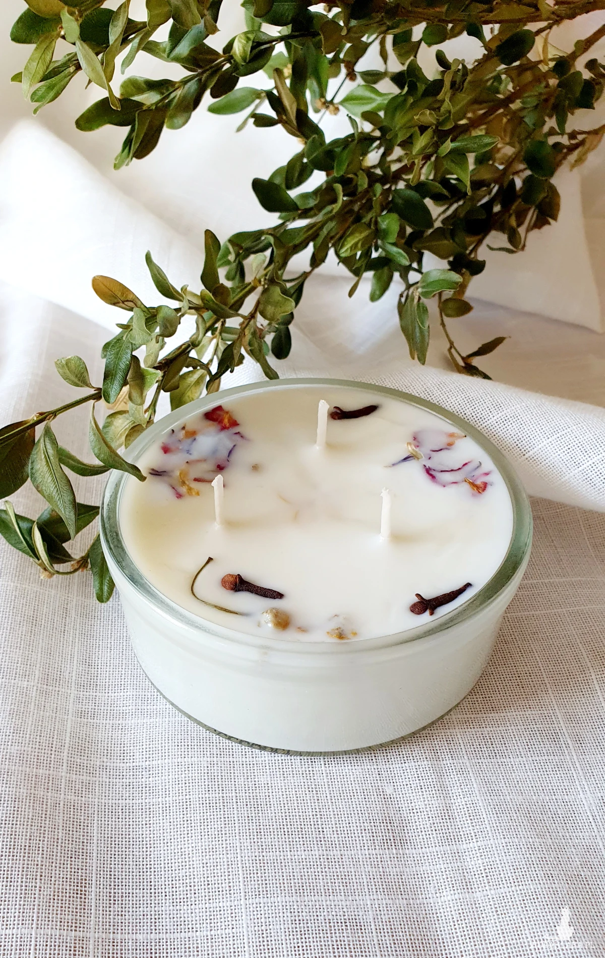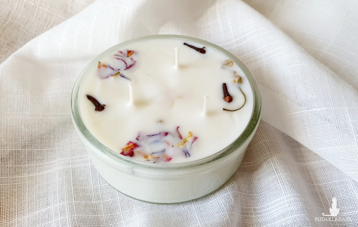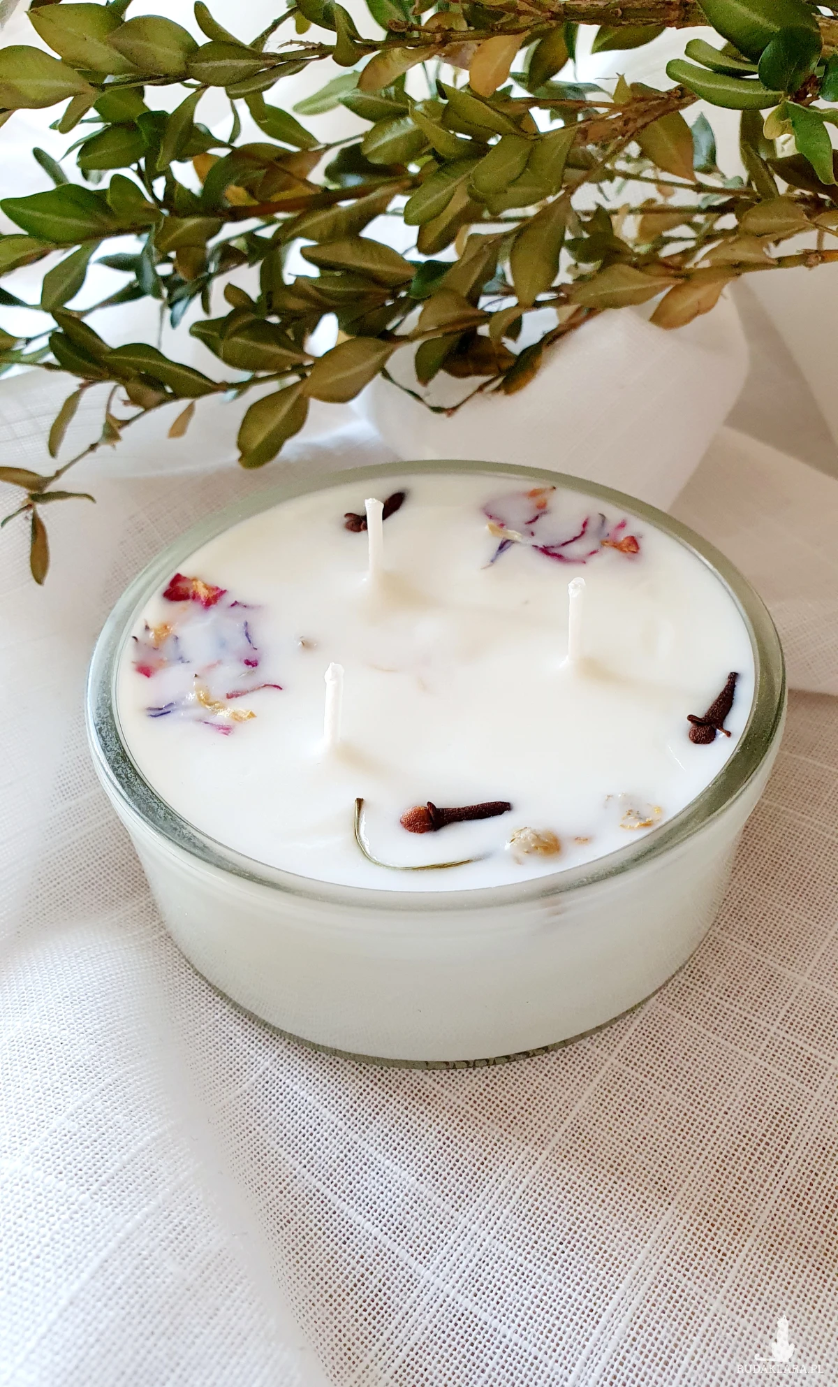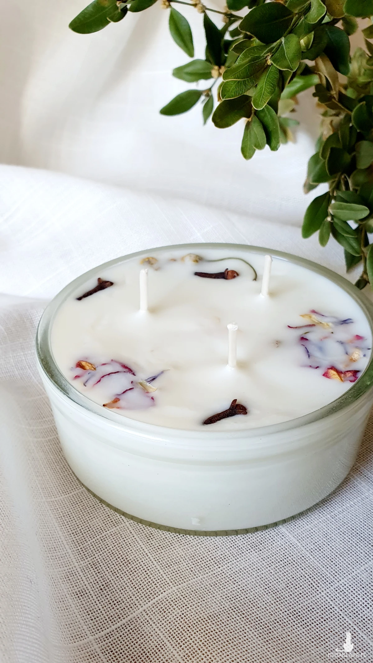 Świeca sojowa wykonana ze 100% wosku sojowego z dodatkiem olejku o zapachu citronella, udekorowana rumiankiem, nagietkiem, płatkami róży, bławatkiem i goździkami. Lekkie nierówności na wierzchu świecy świadczą o własnoręcznym jej wykonaniu.