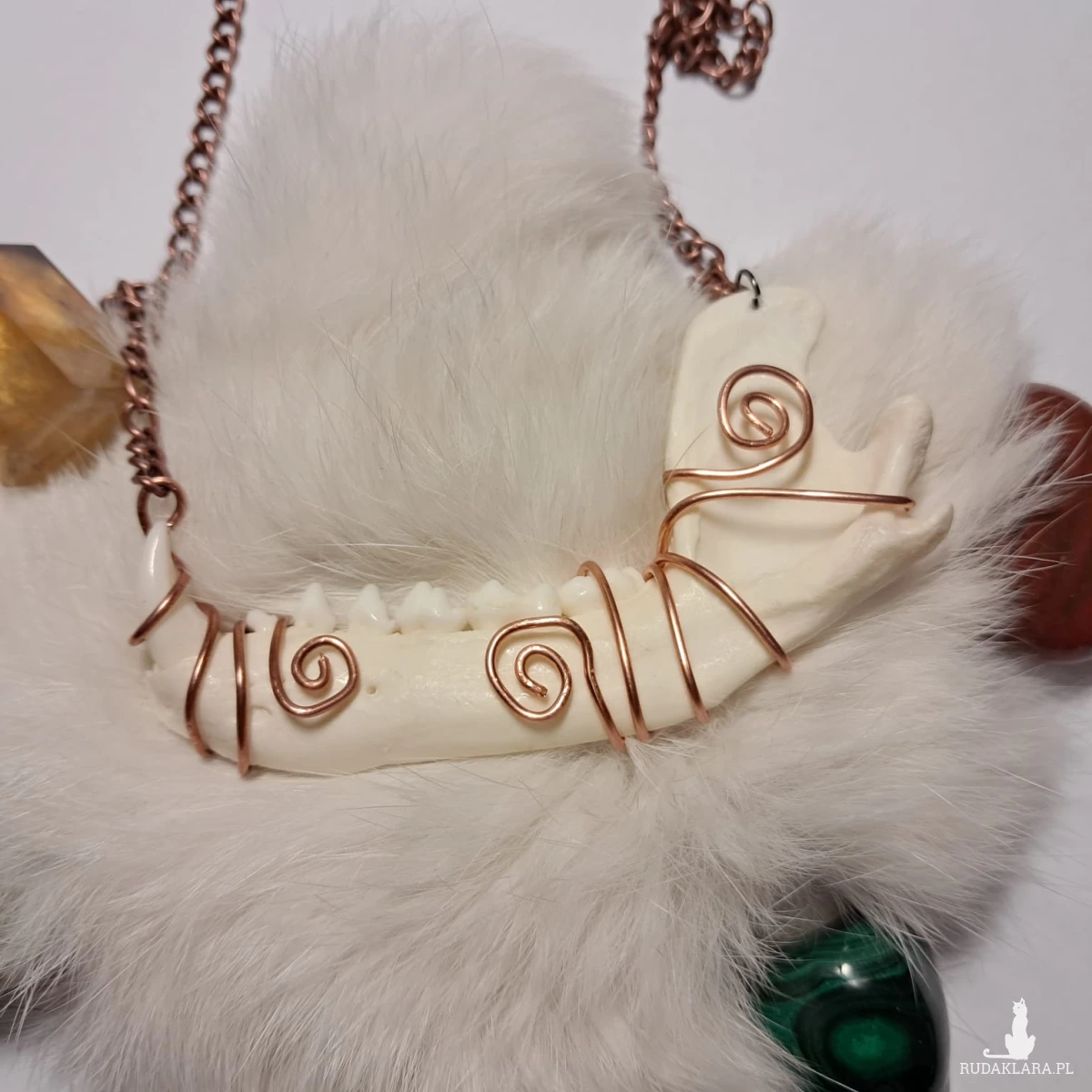 Ten unikatowy naszyjnik to połączenie surowej dzikości natury i artystycznego kunsztu. Jego głównym elementem jest autentyczna żuchwa szopa, starannie oczyszczona i zabezpieczona, aby zachować swoją wyjątkową strukturę. Całość została ozdobiona misternie oplecionym drutem miedzianym, tworzącym delikatne spiralne wzory, które dodają mu subtelnej elegancji i mistycznego charakteru.