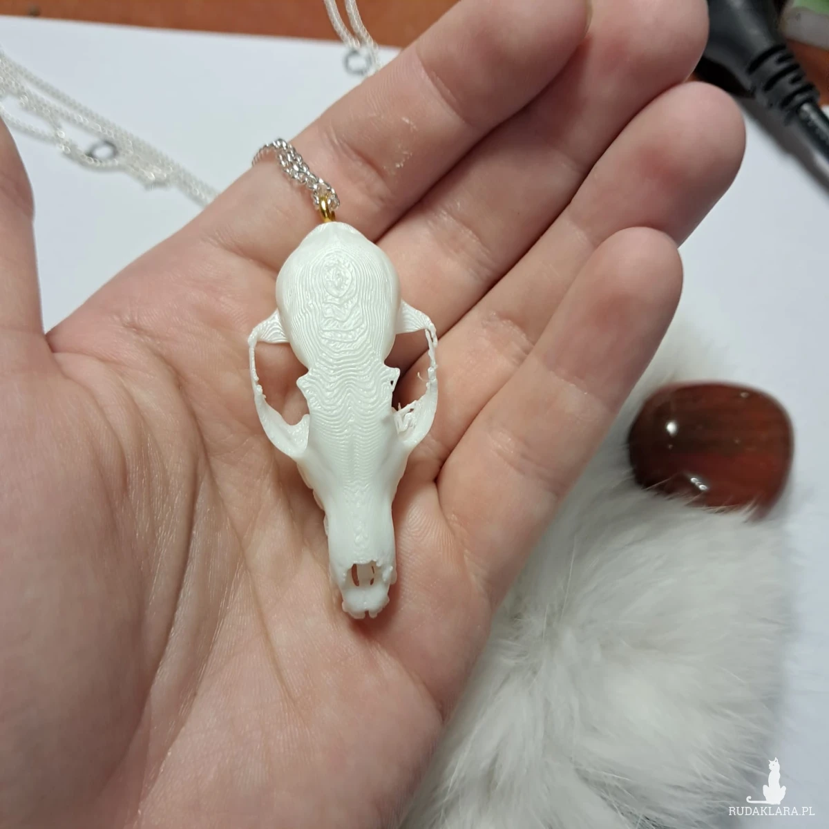 mini wydruk białej czaszki lisa jako naszyjnik
