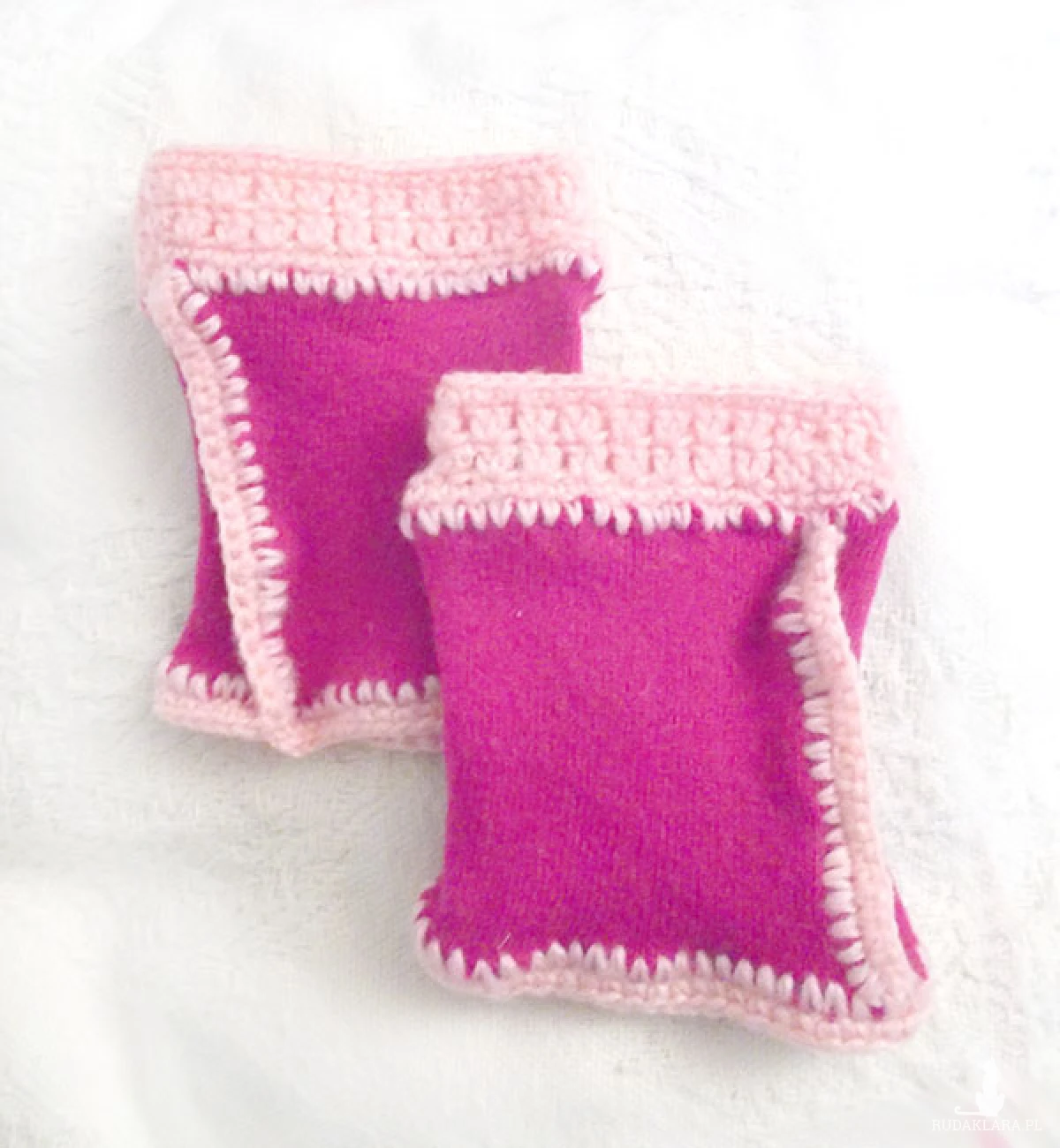 Oryginalne, wełniane mitenki damskie lub dziewczęce. Kolory: fuksja (ostry róż) i jasny róż. Ciepły materiał: jagnięca wełna 100%, wykończenie akrylowe. Prać ręcznie w letniej wodzie.