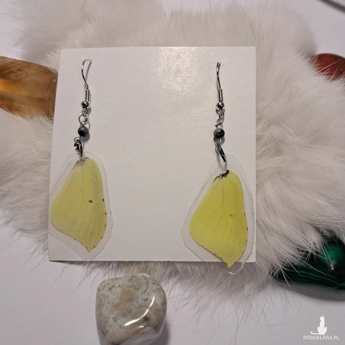 Każde skrzydło zostało zabezpieczone w przeźroczystej żywicy lub laminacie, co pozwala zachować jego delikatność, a jednocześnie czyni biżuterię trwałą i odporną na uszkodzenia. Kolczyki zawieszone są na eleganckich, srebrnych biglach z dodatkiem małych kamiennych koralików, które nadają im unikalnego charakteru.